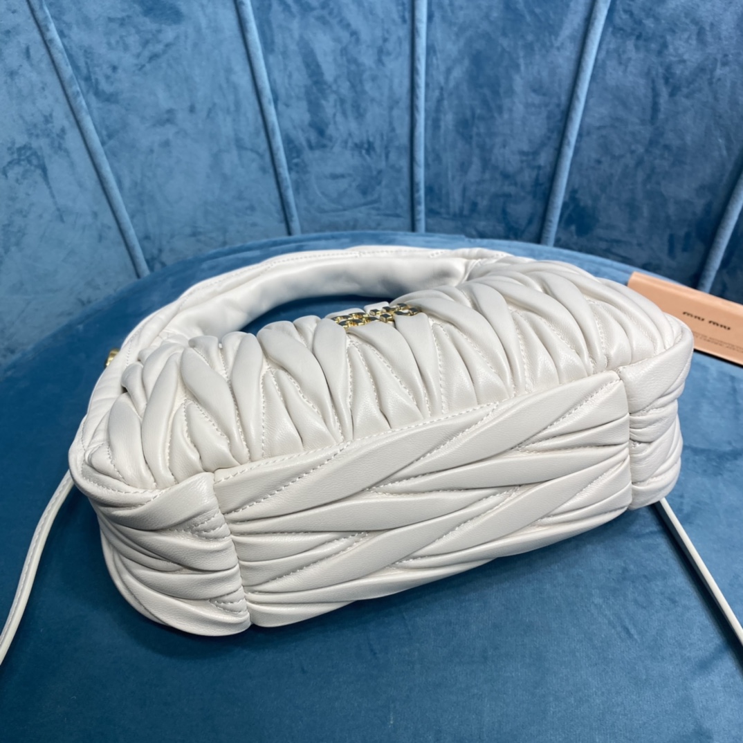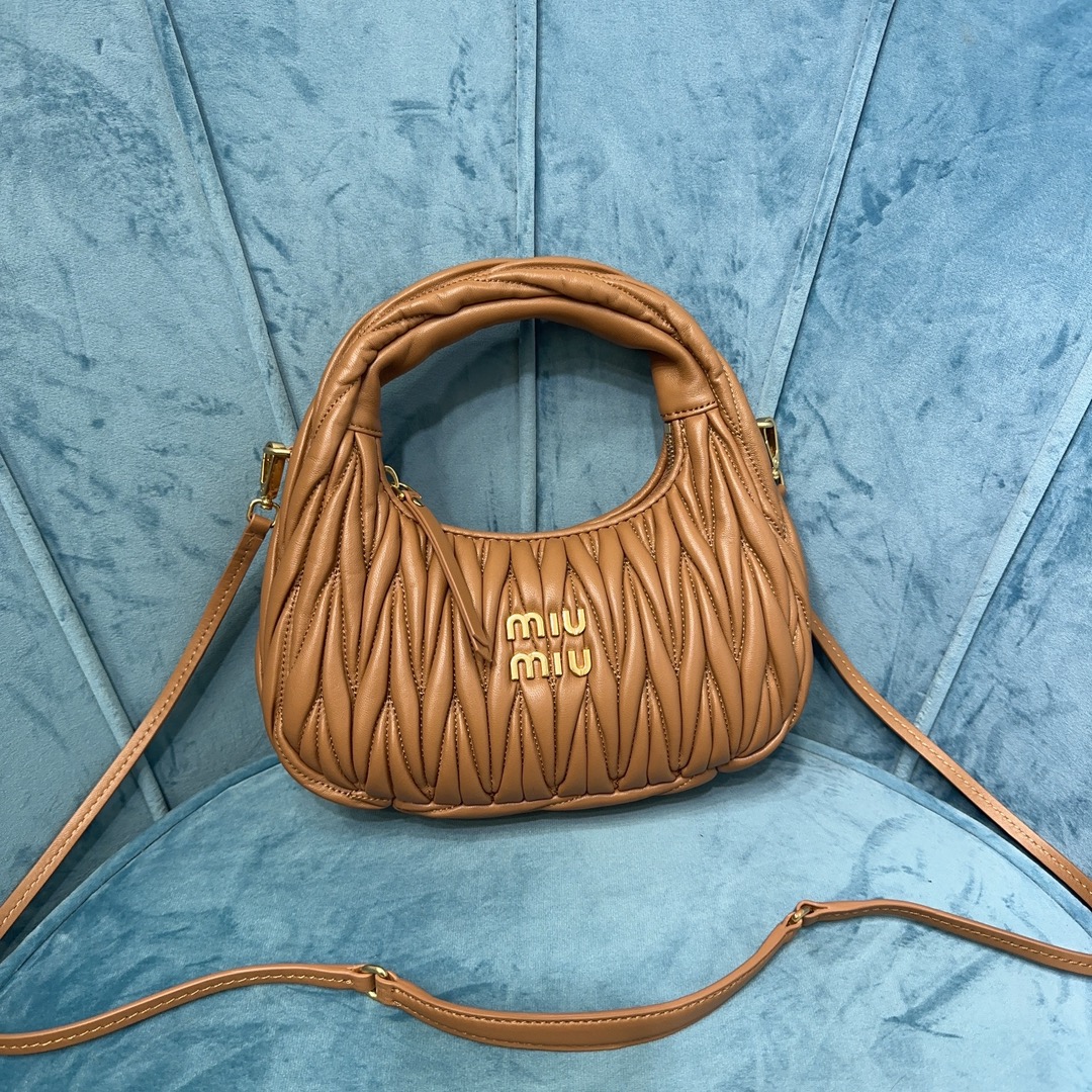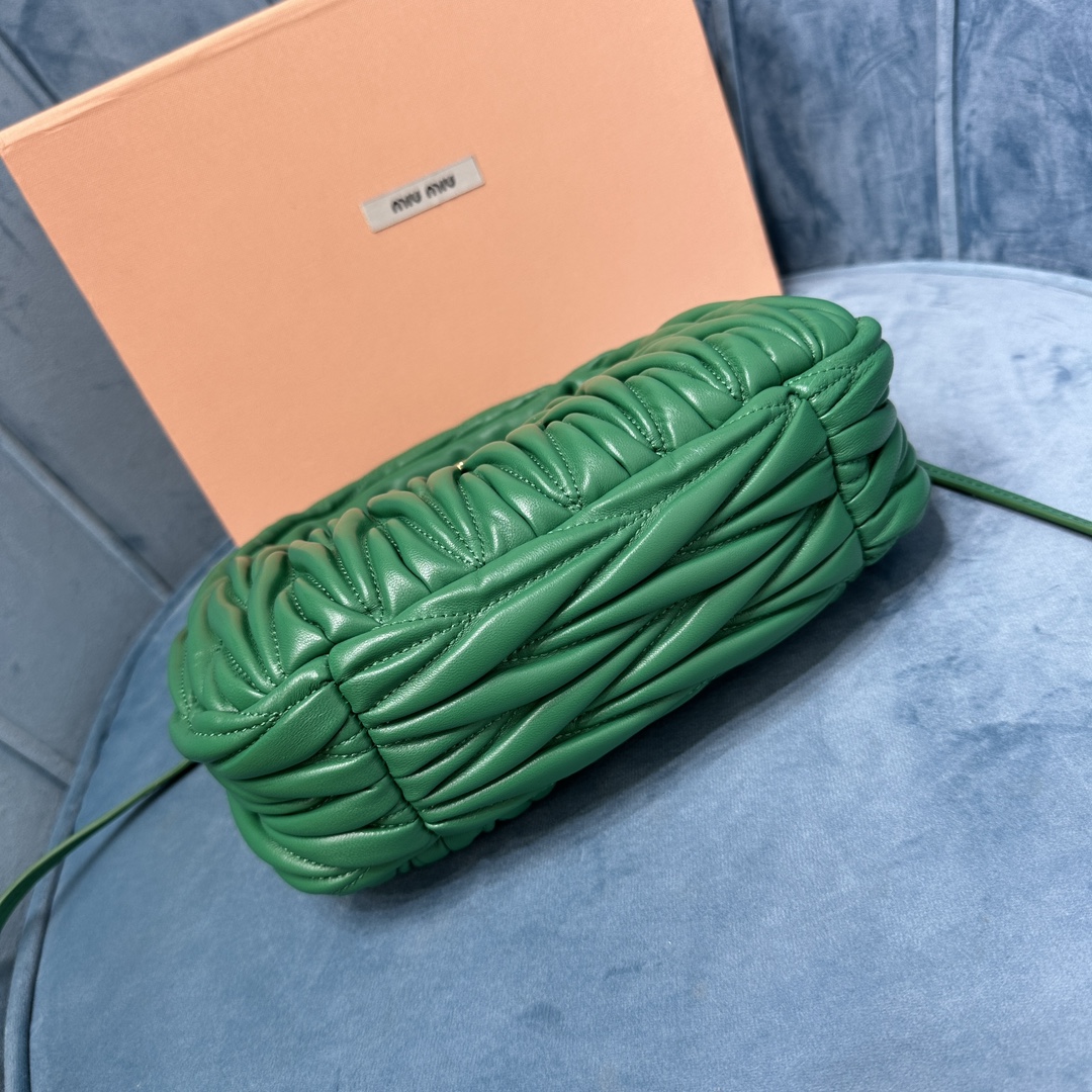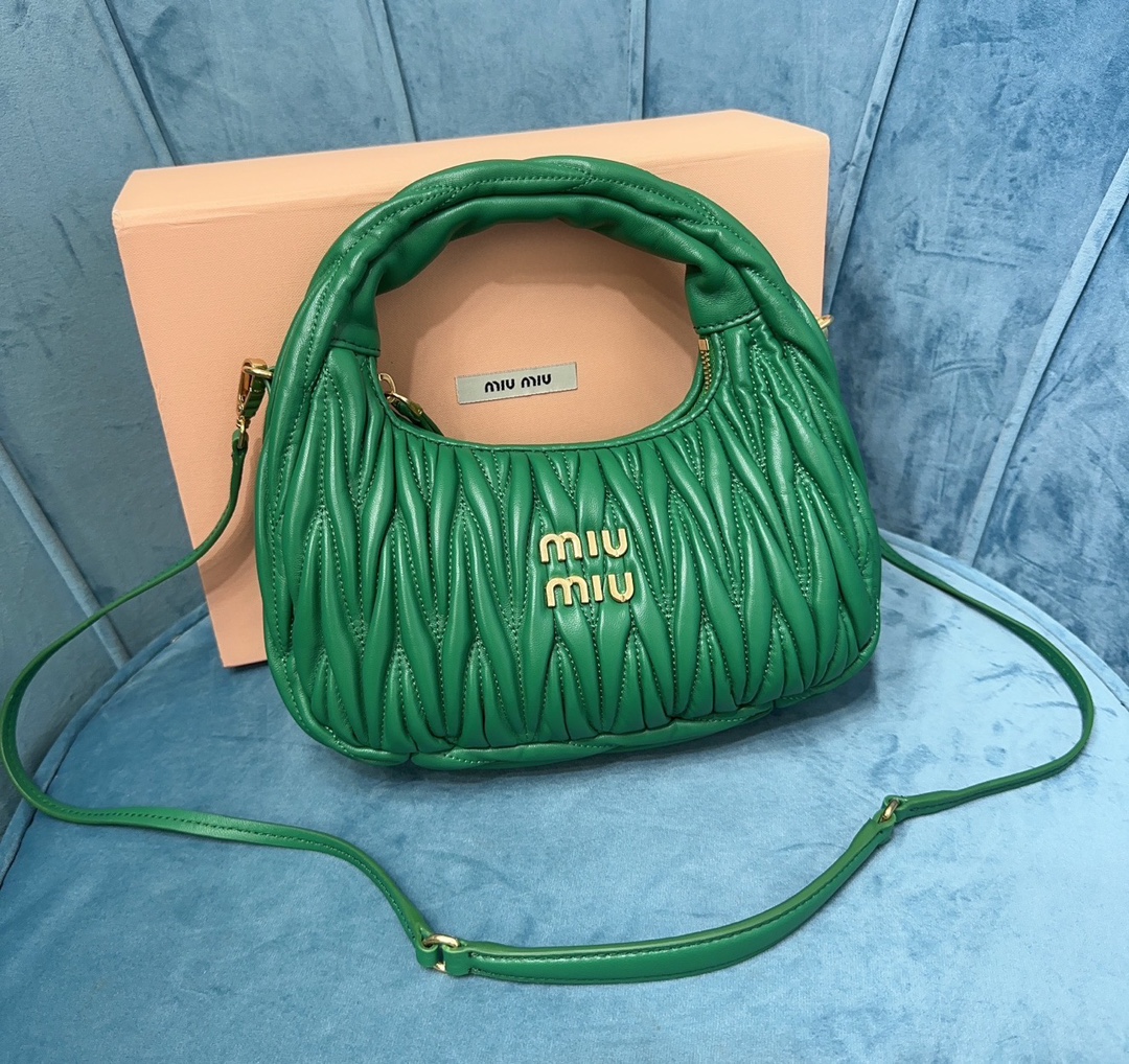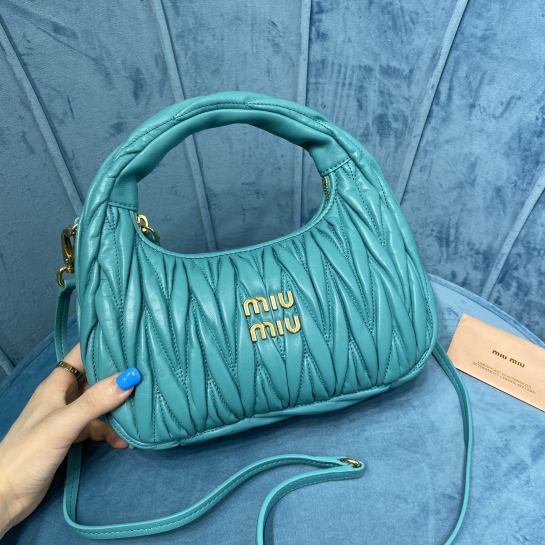 MiuMiu新品MiuWander手袋,采用进口小羊皮经典品牌标志性Matelasse纹理绣花,复古磨砂五金,利用圆孤的曲线,