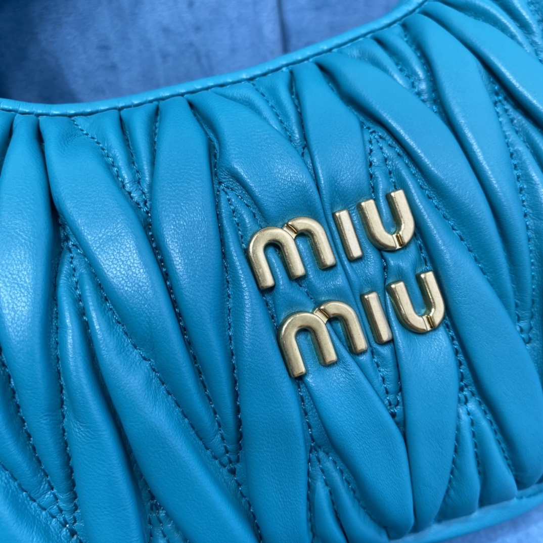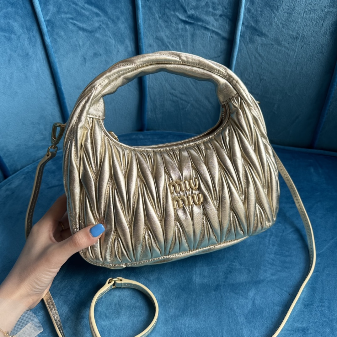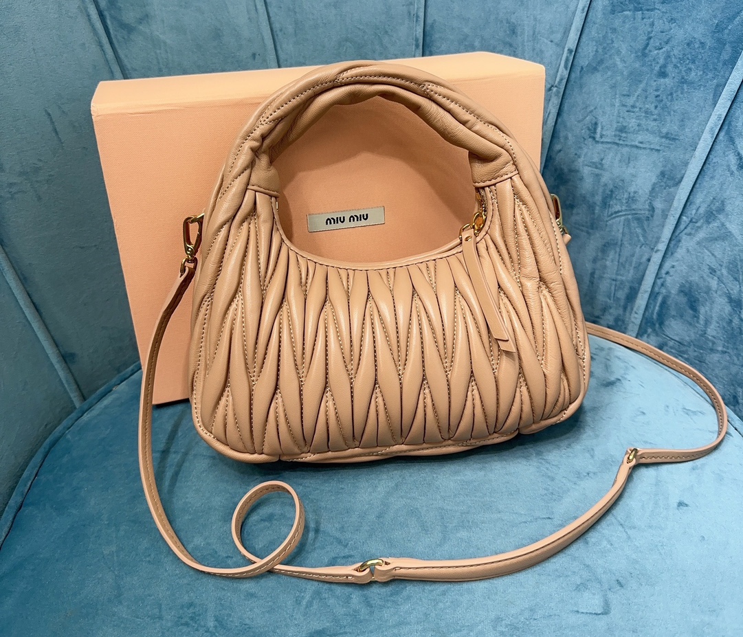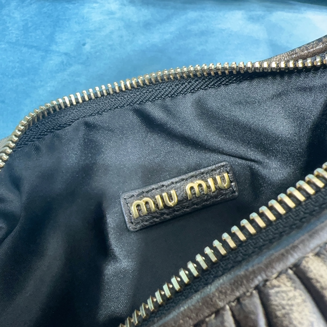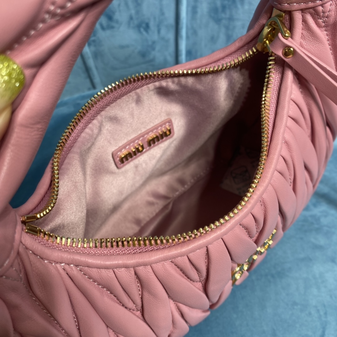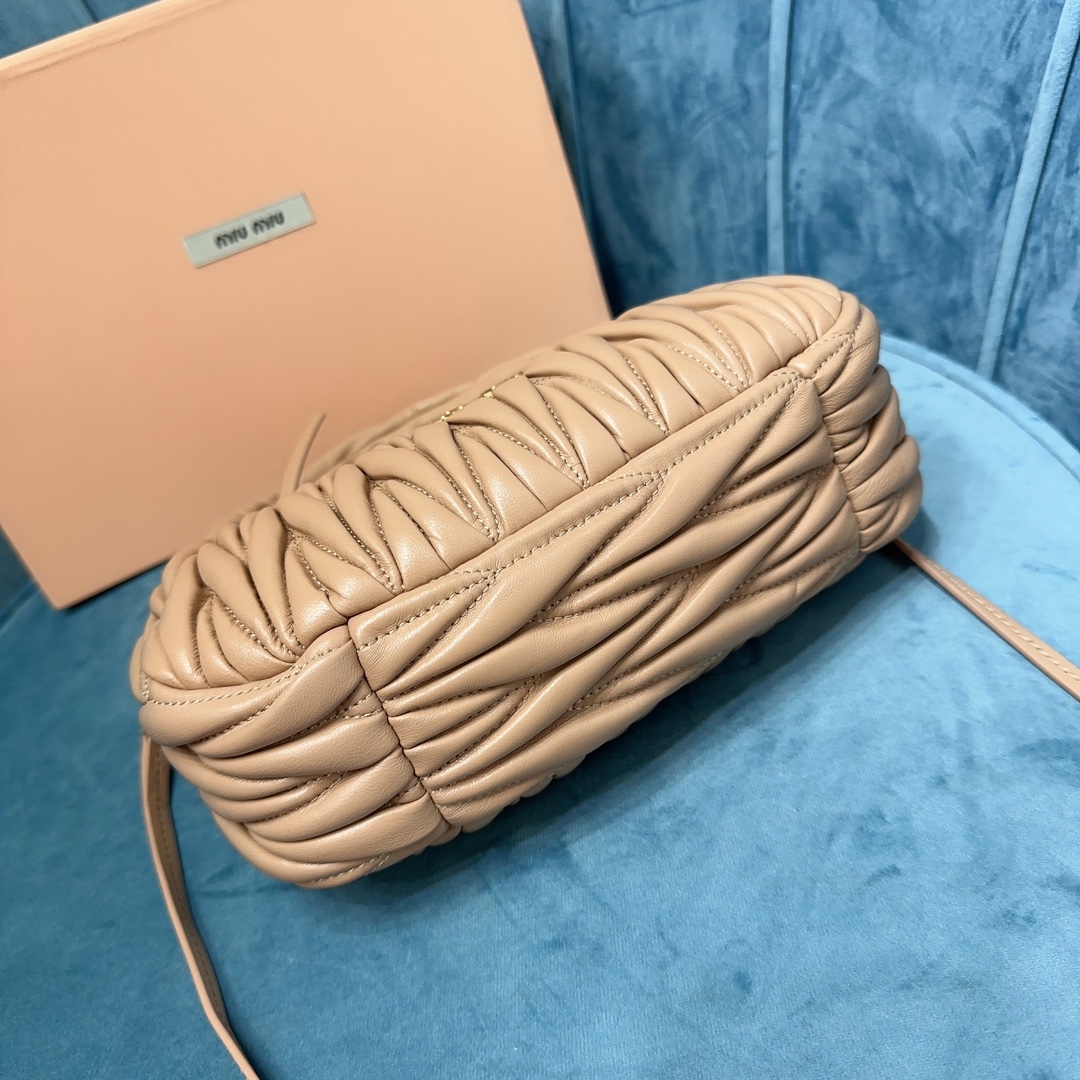 MiuMiu新品MiuWander手袋,采用进口小羊皮经典品牌标志性Matelasse纹理绣花,复古磨砂五金,利用圆孤的曲线,