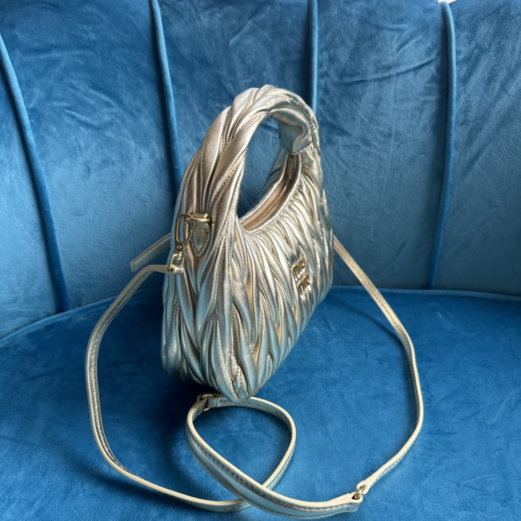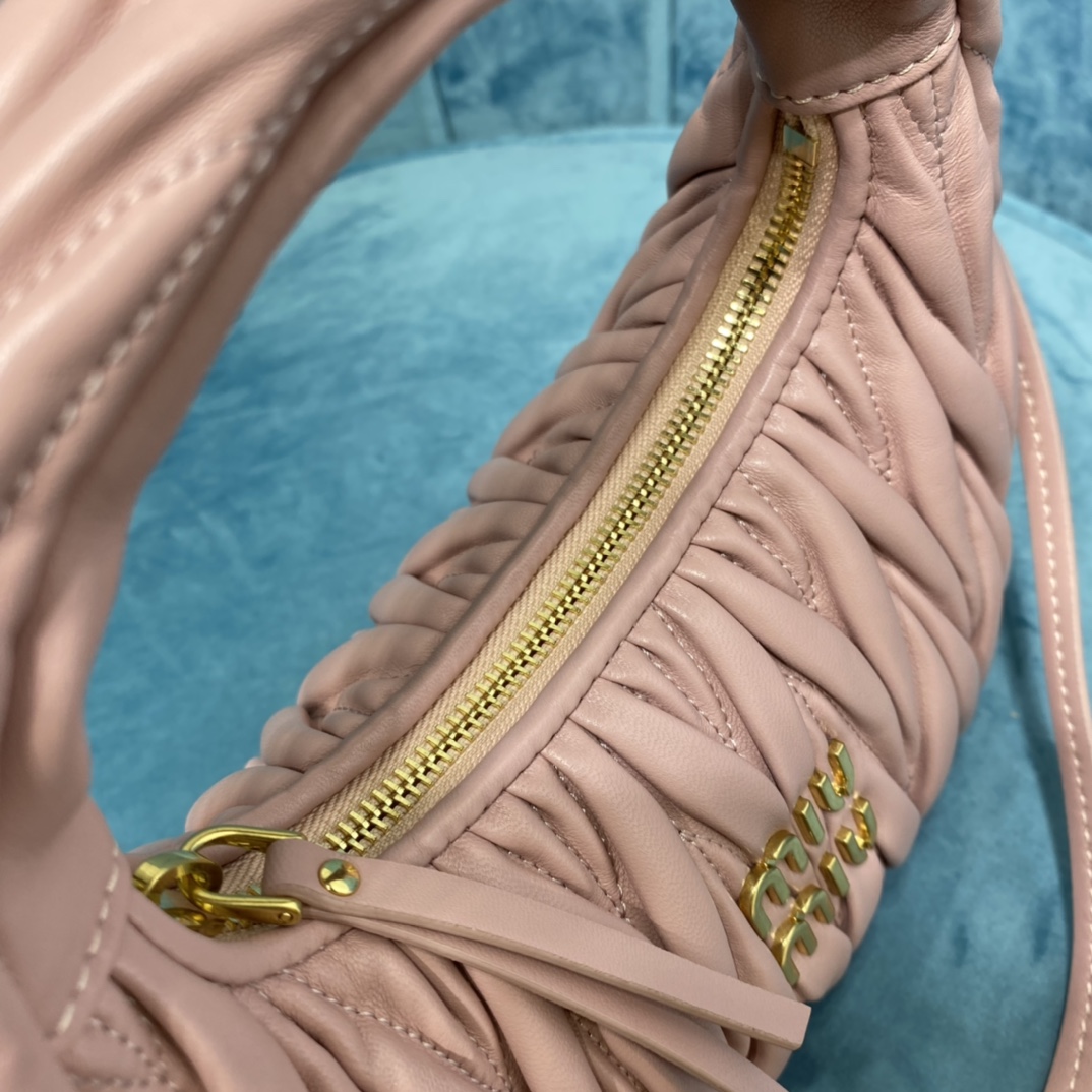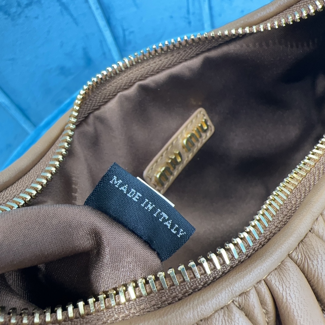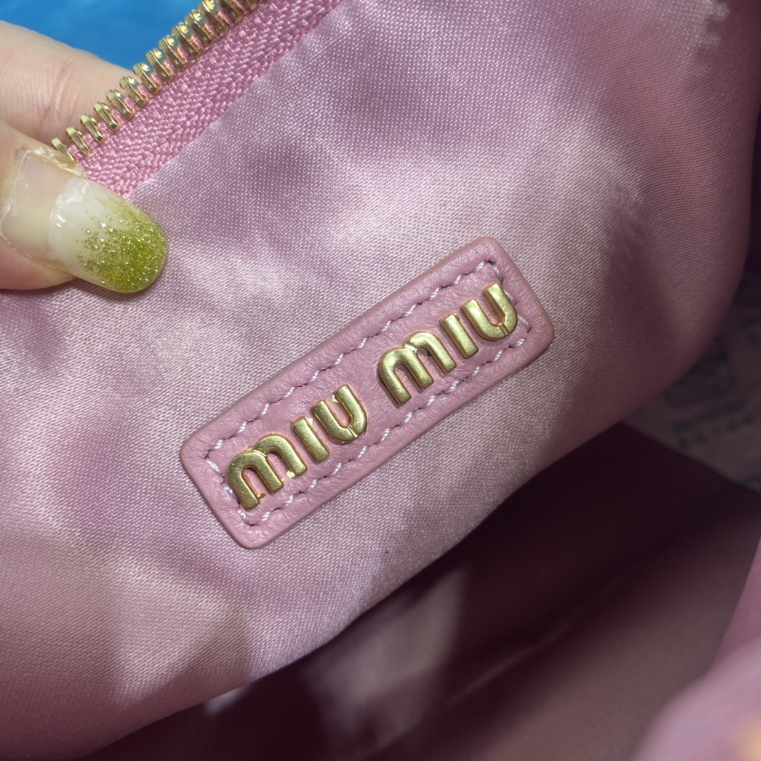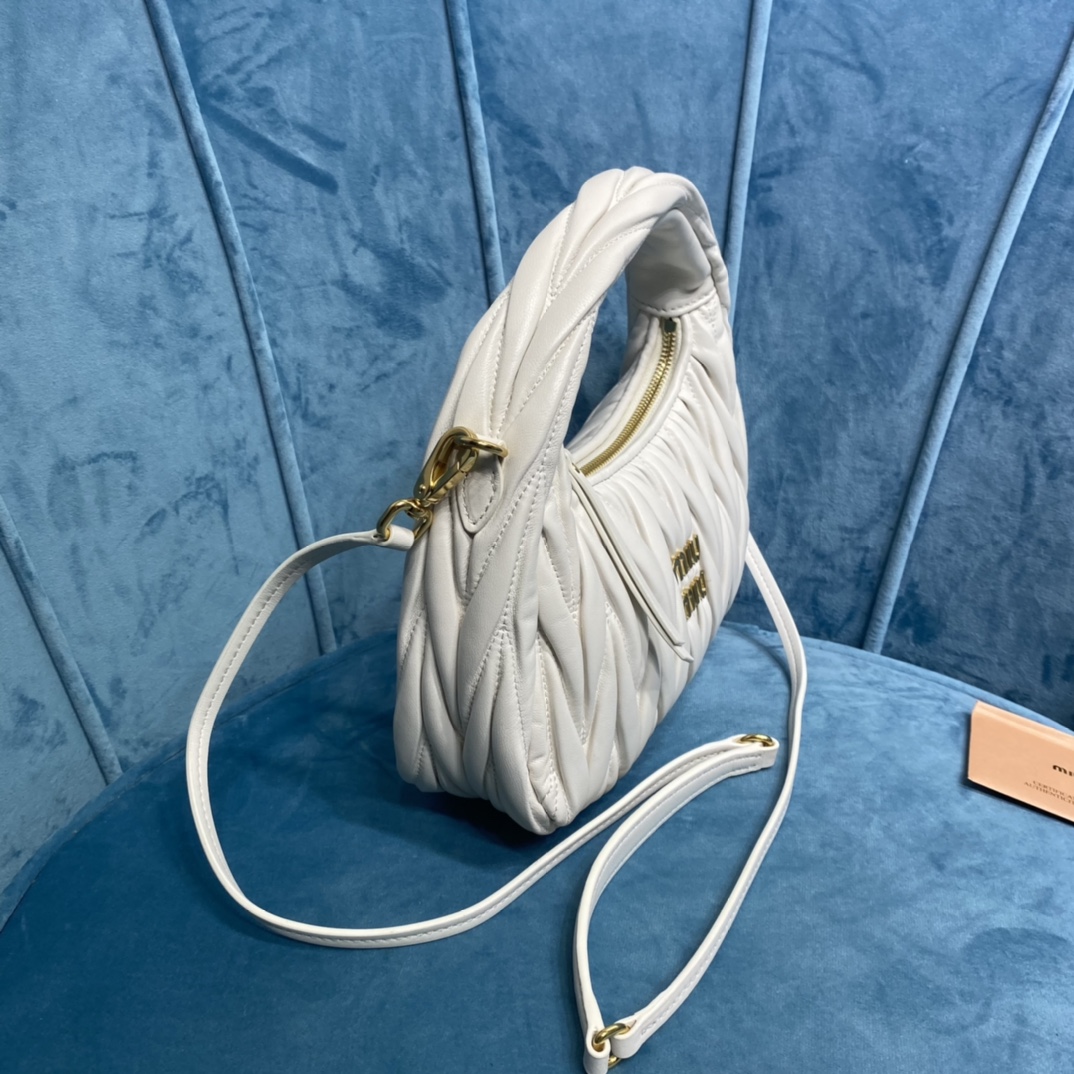 MiuMiu新品MiuWander手袋,采用进口小羊皮经典品牌标志性Matelasse纹理绣花,复古磨砂五金,利用圆孤的曲线,