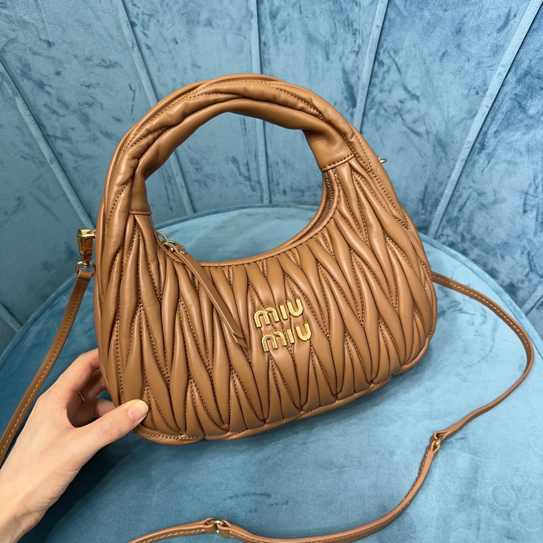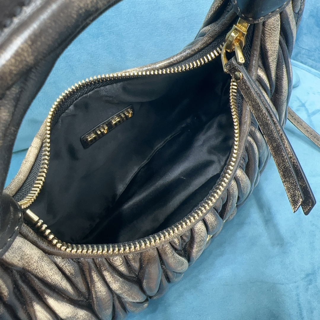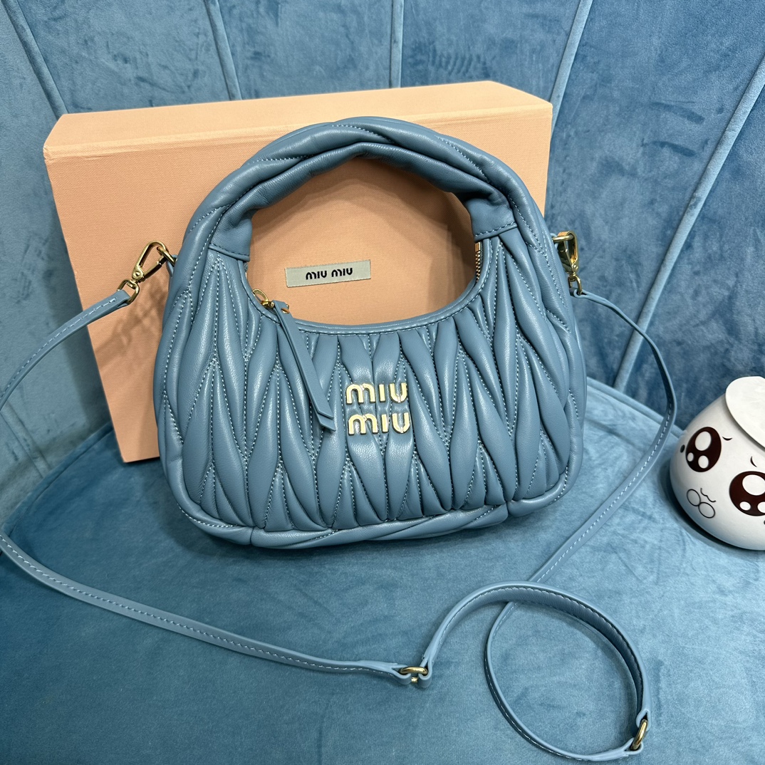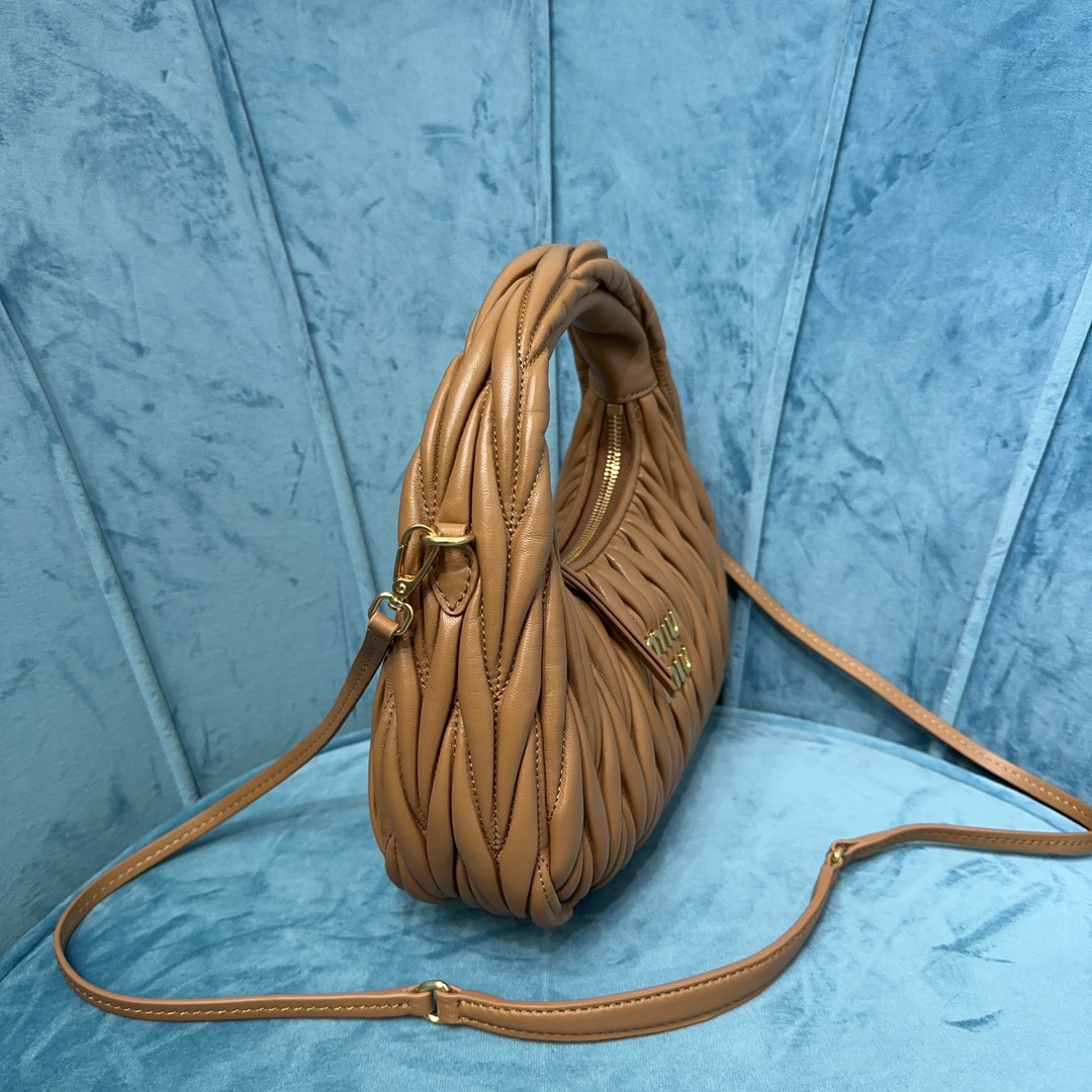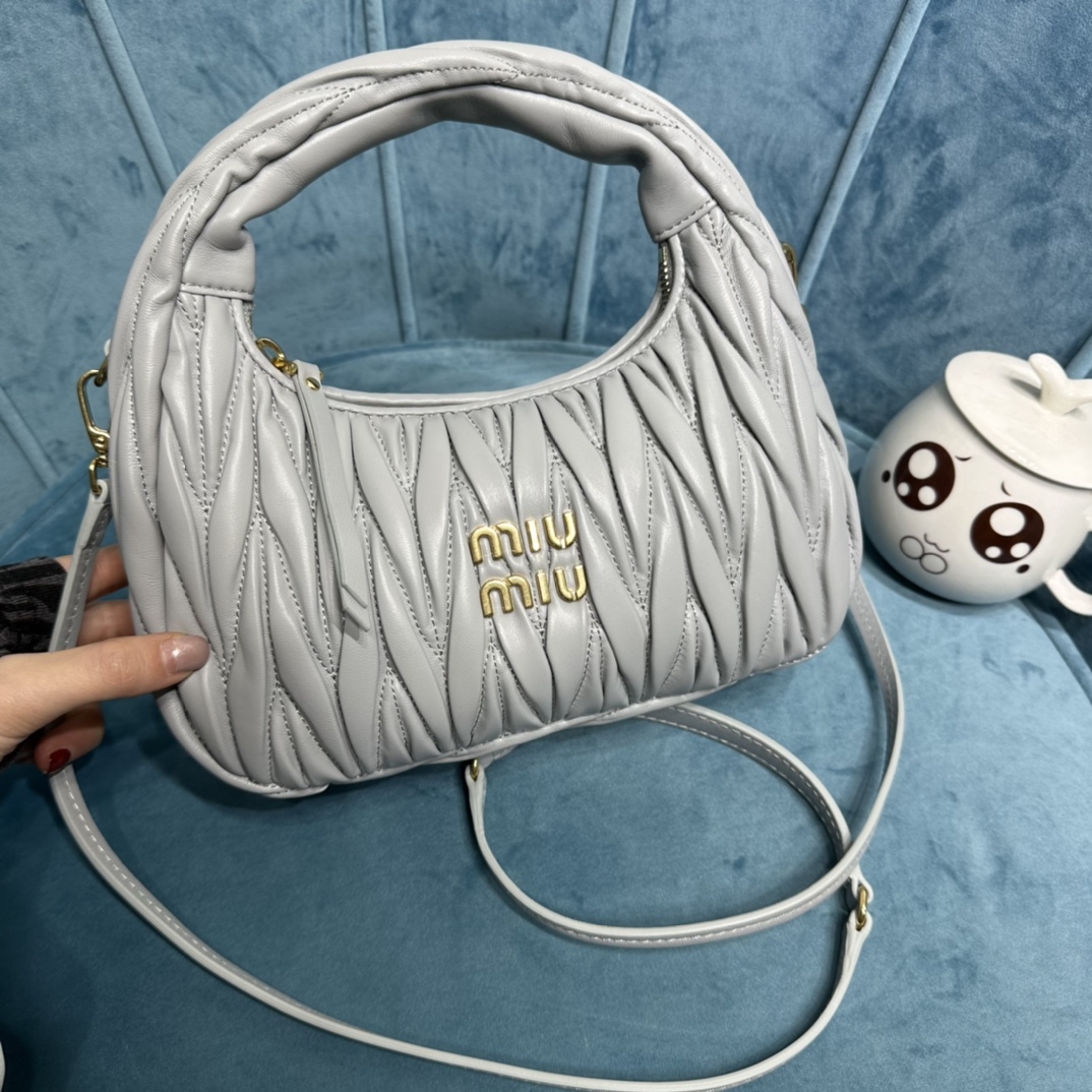 MiuMiu新品MiuWander手袋,采用进口小羊皮经典品牌标志性Matelasse纹理绣花,复古磨砂五金,利用圆孤的曲线,
