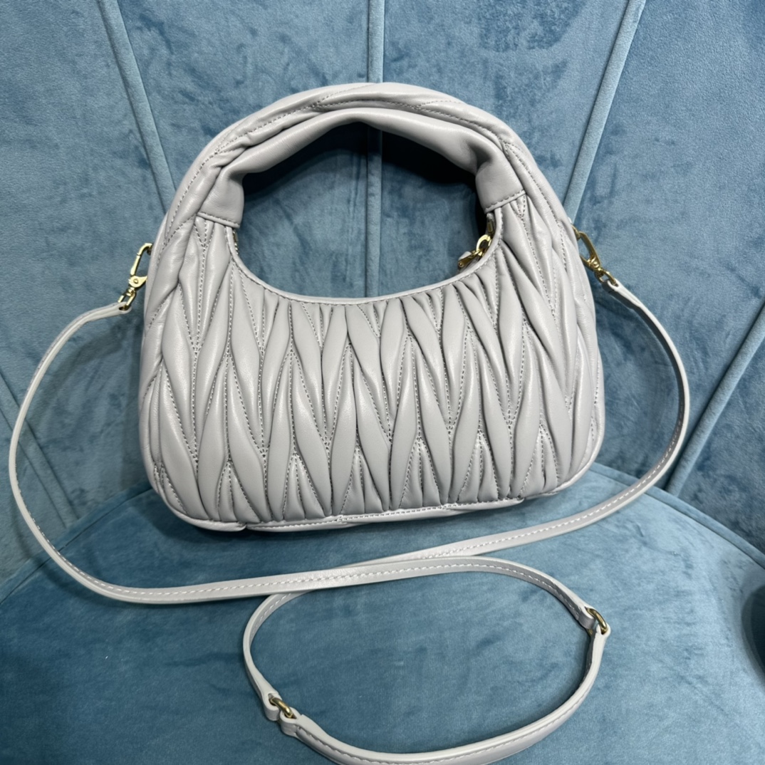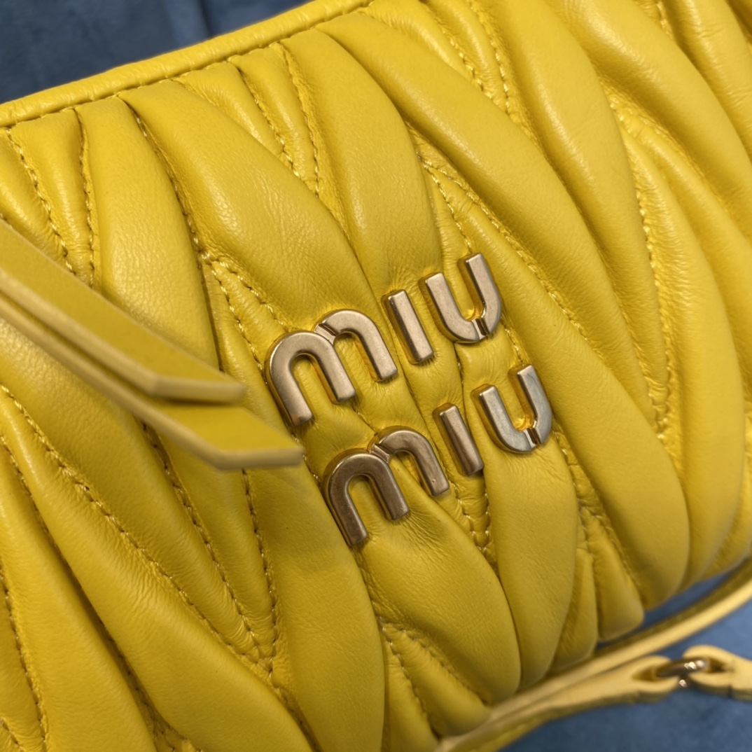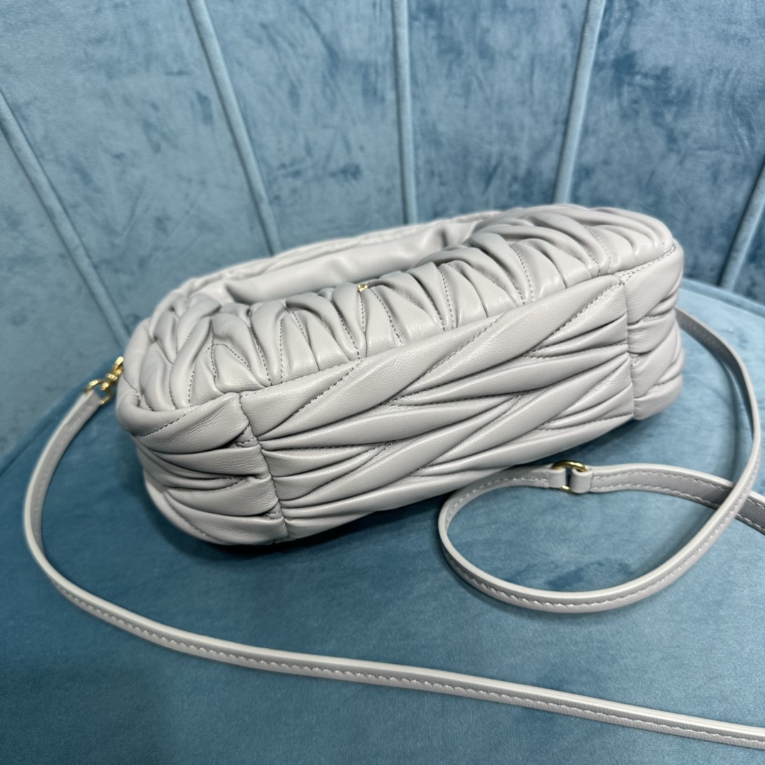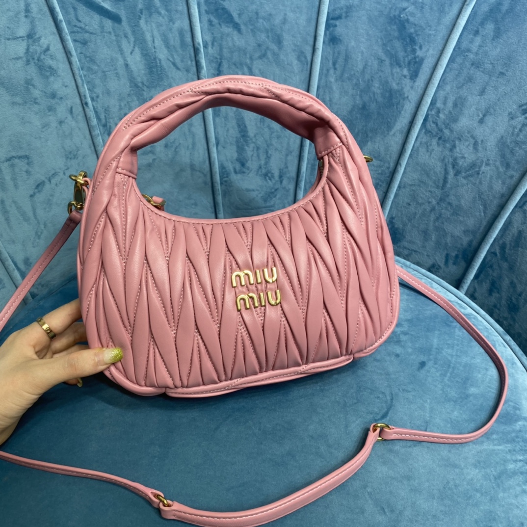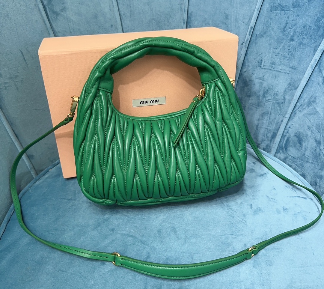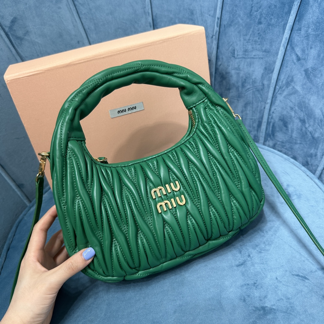 MiuMiu新品MiuWander手袋,采用进口小羊皮经典品牌标志性Matelasse纹理绣花,复古磨砂五金,利用圆孤的曲线,