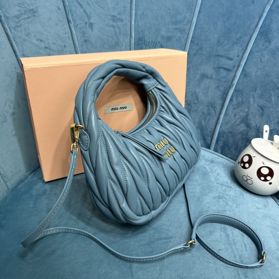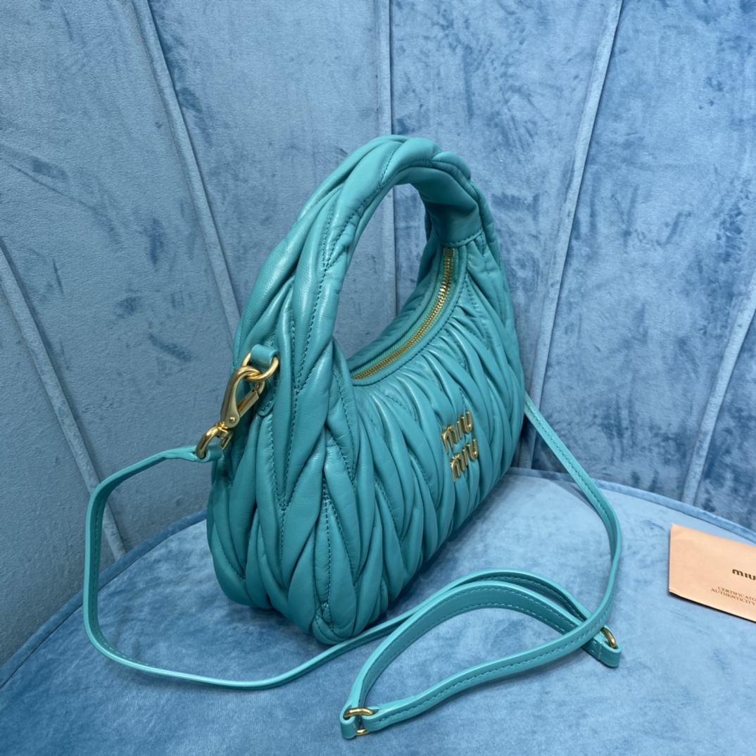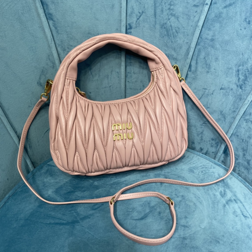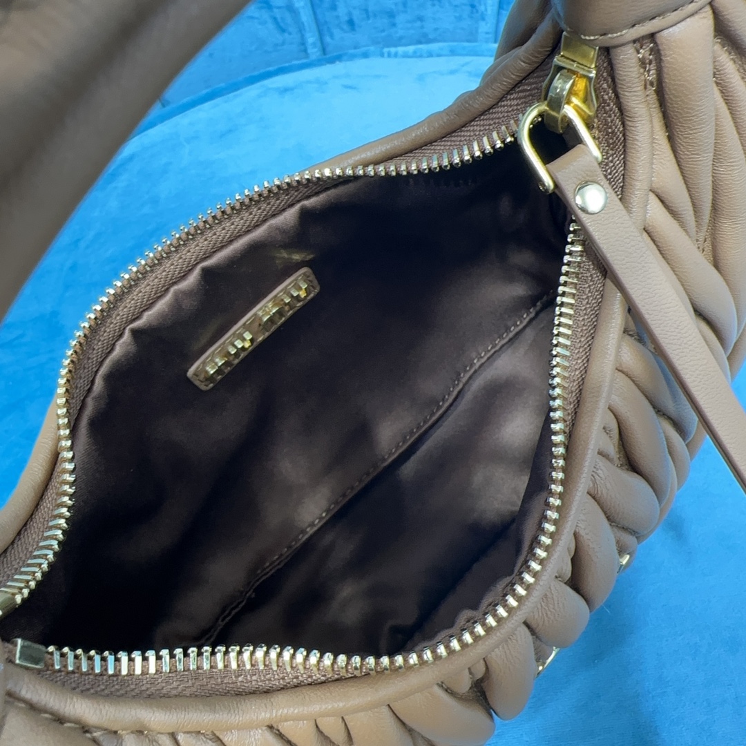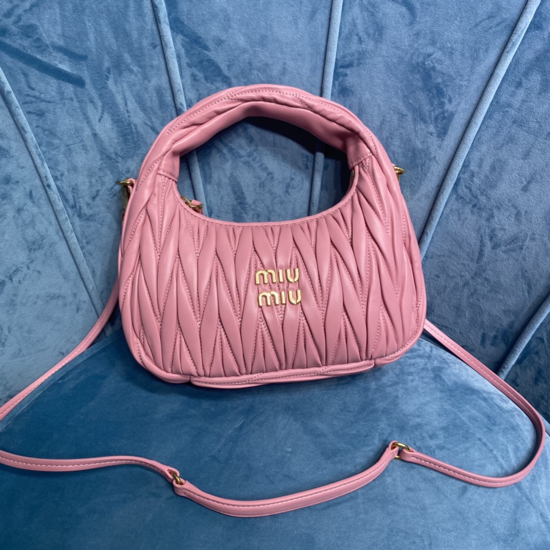 MiuMiu新品MiuWander手袋,采用进口小羊皮经典品牌标志性Matelasse纹理绣花,复古磨砂五金,利用圆孤的曲线,