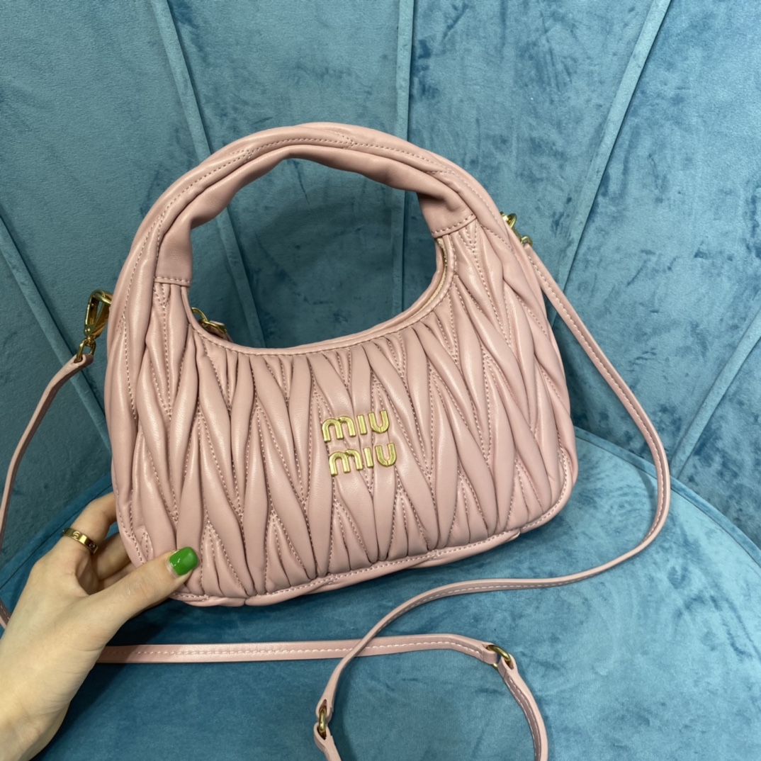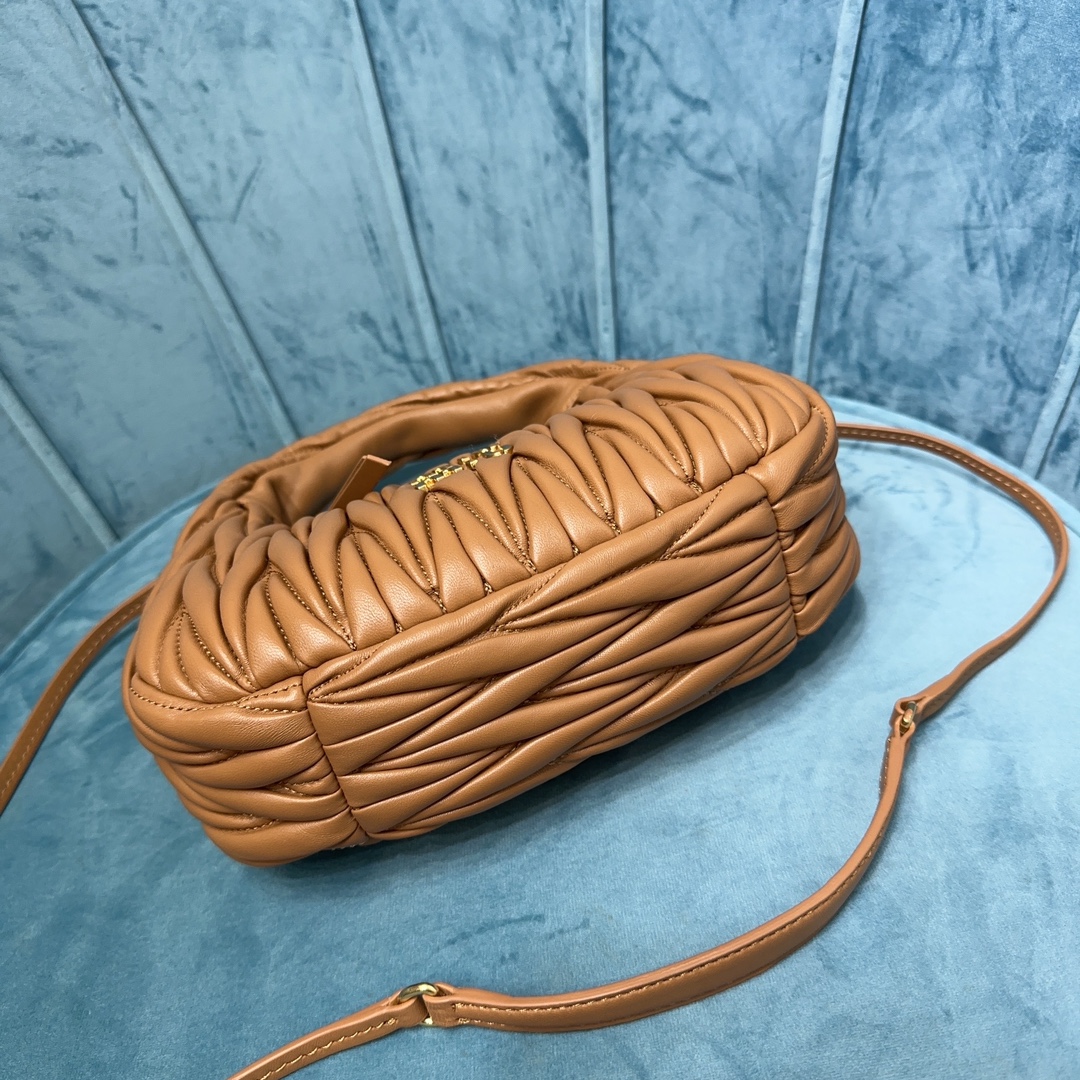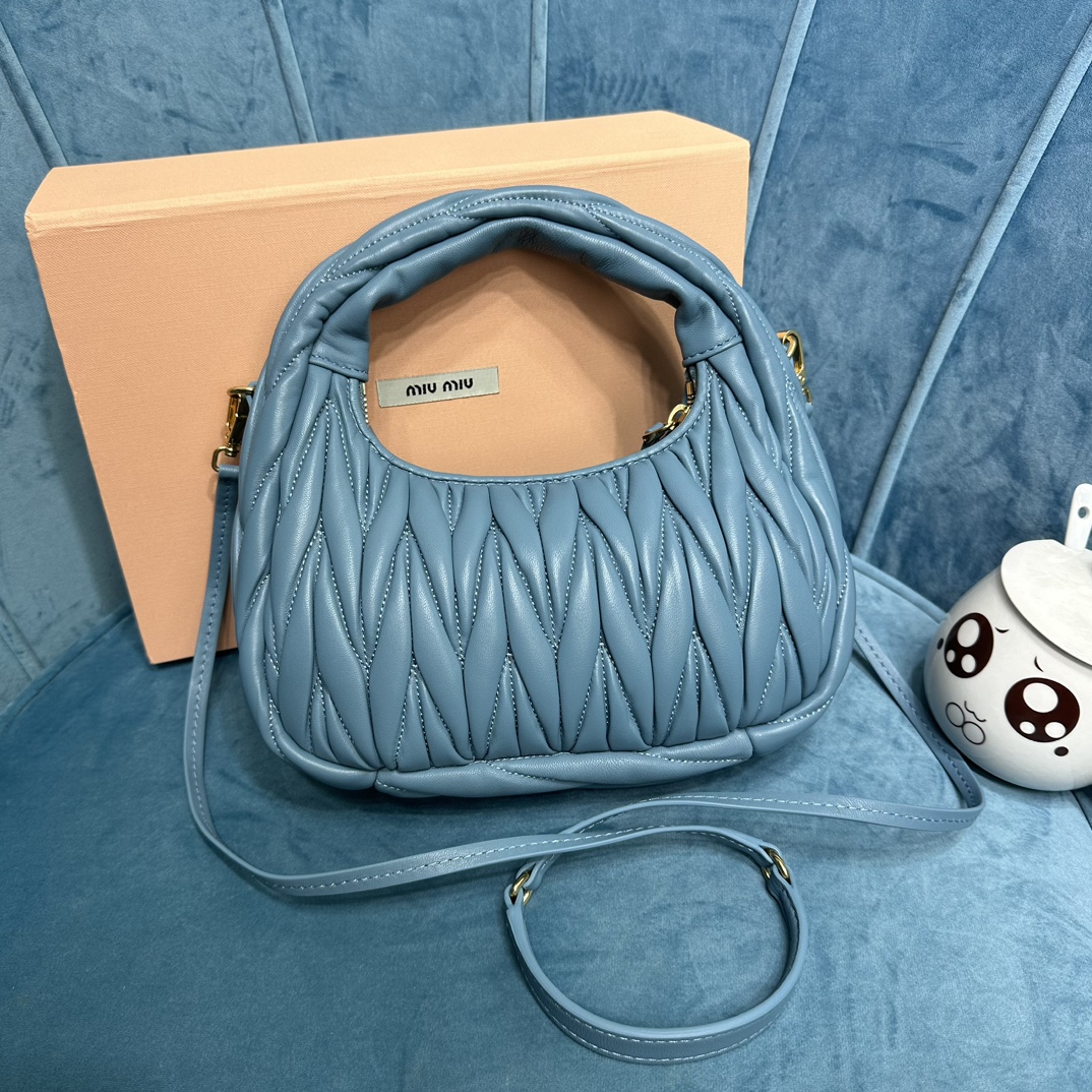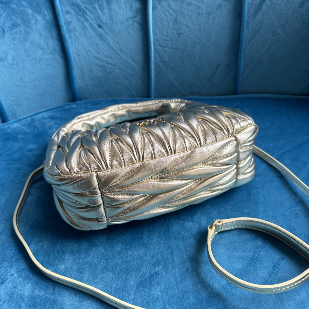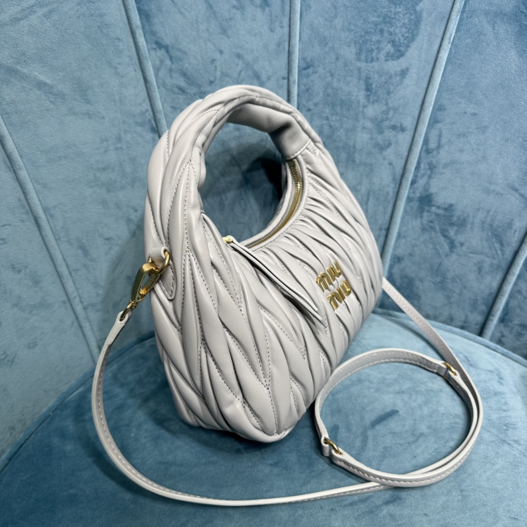 MiuMiu新品MiuWander手袋,采用进口小羊皮经典品牌标志性Matelasse纹理绣花,复古磨砂五金,利用圆孤的曲线,