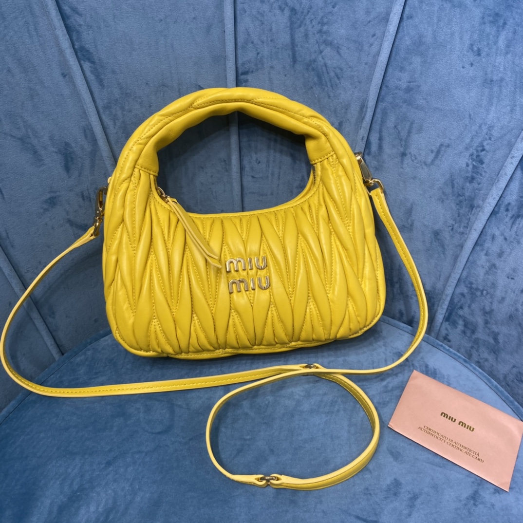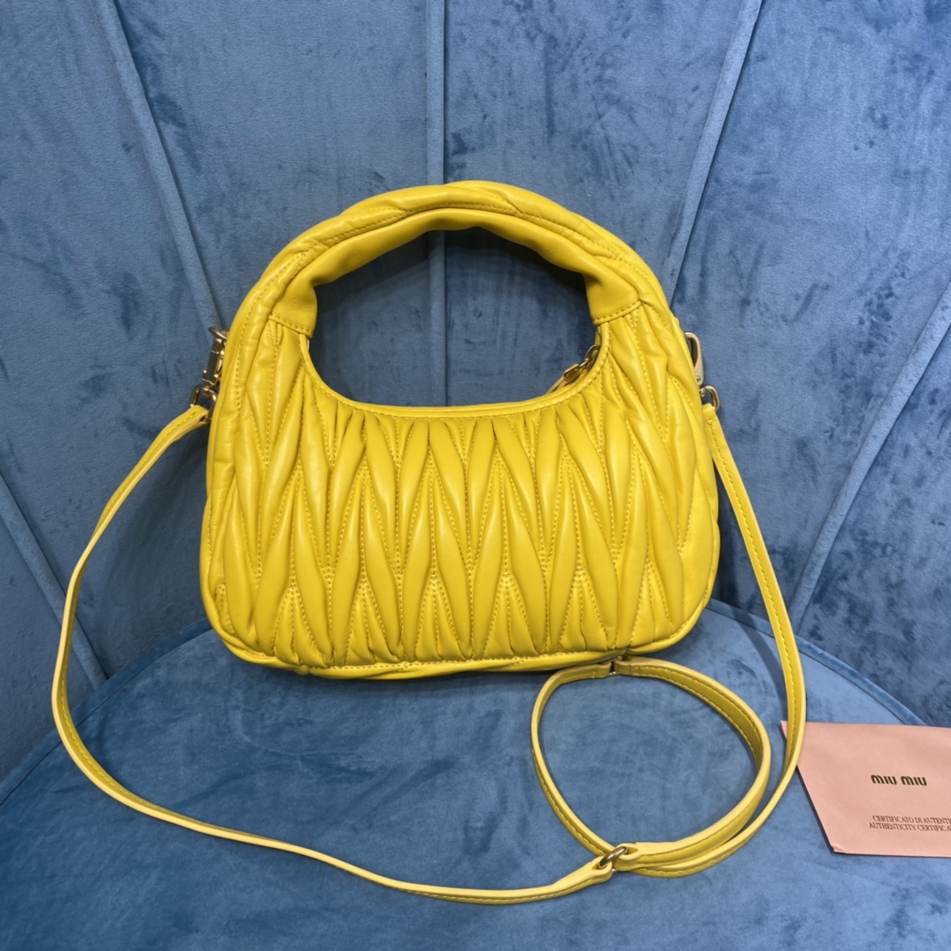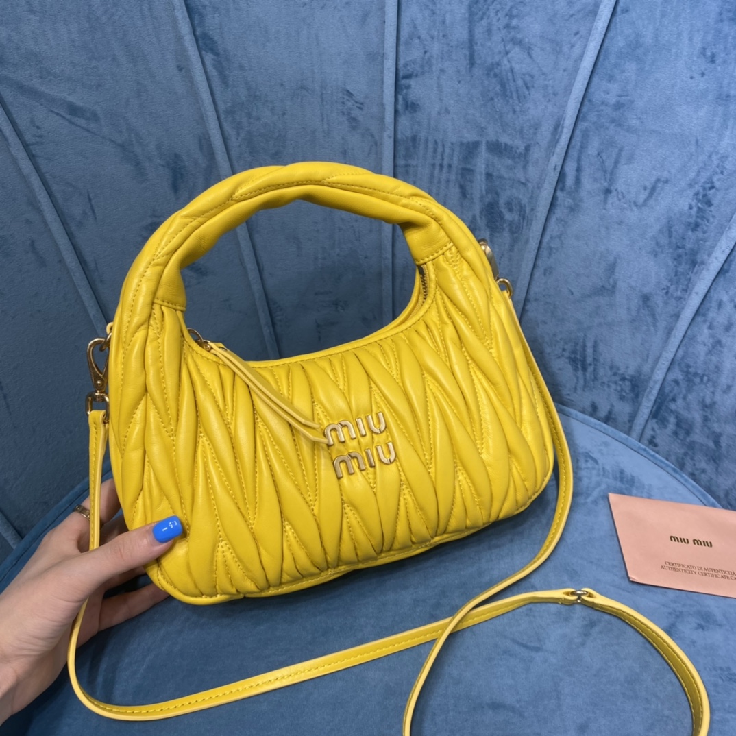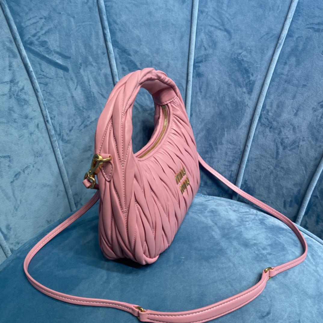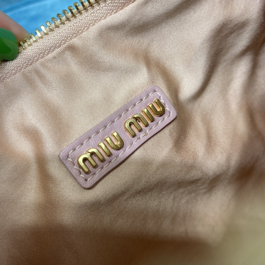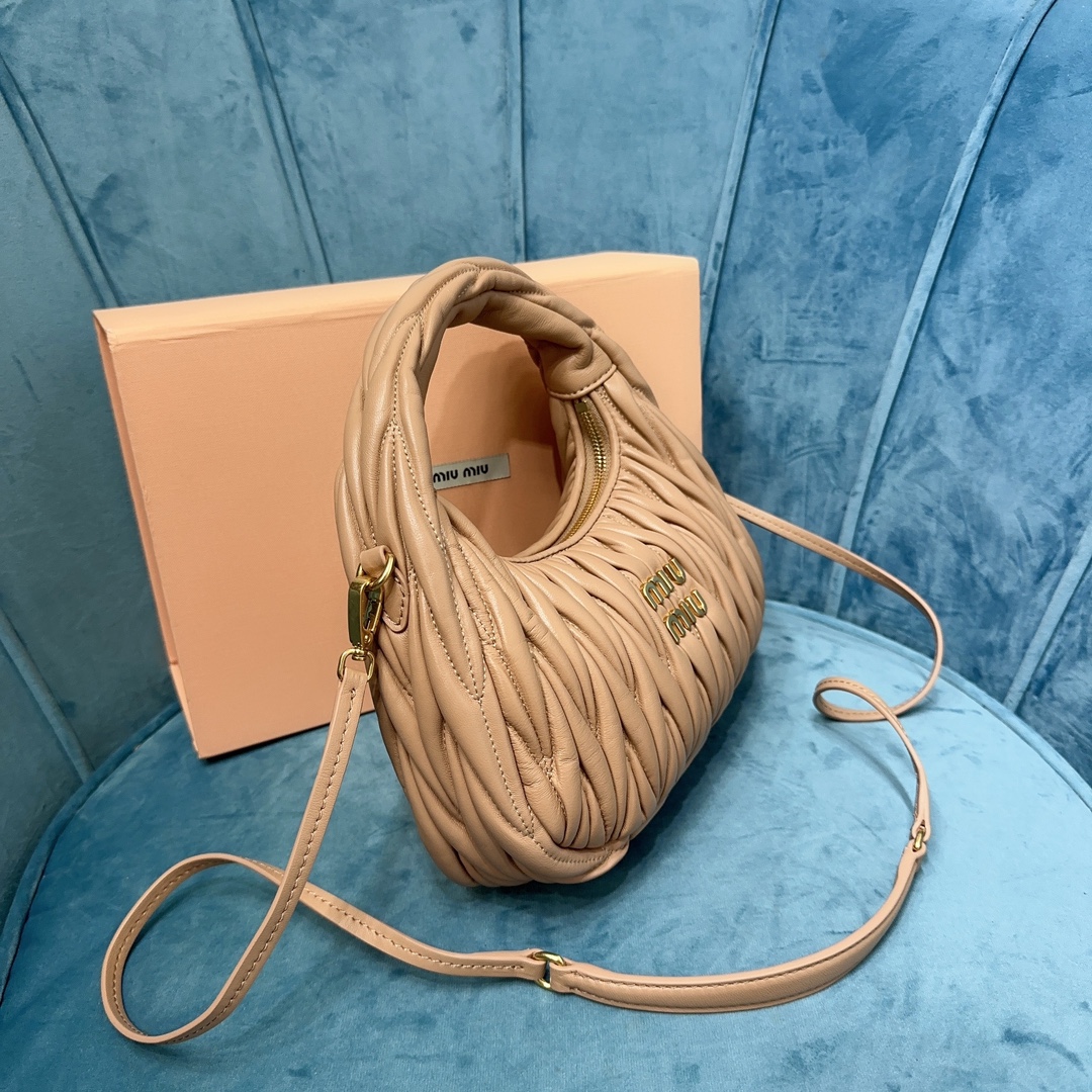 MiuMiu新品MiuWander手袋,采用进口小羊皮经典品牌标志性Matelasse纹理绣花,复古磨砂五金,利用圆孤的曲线,