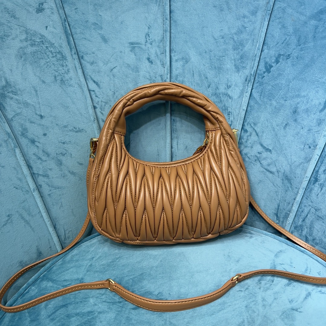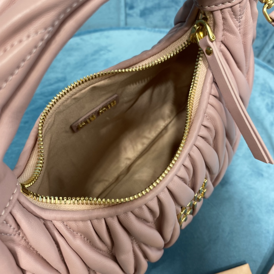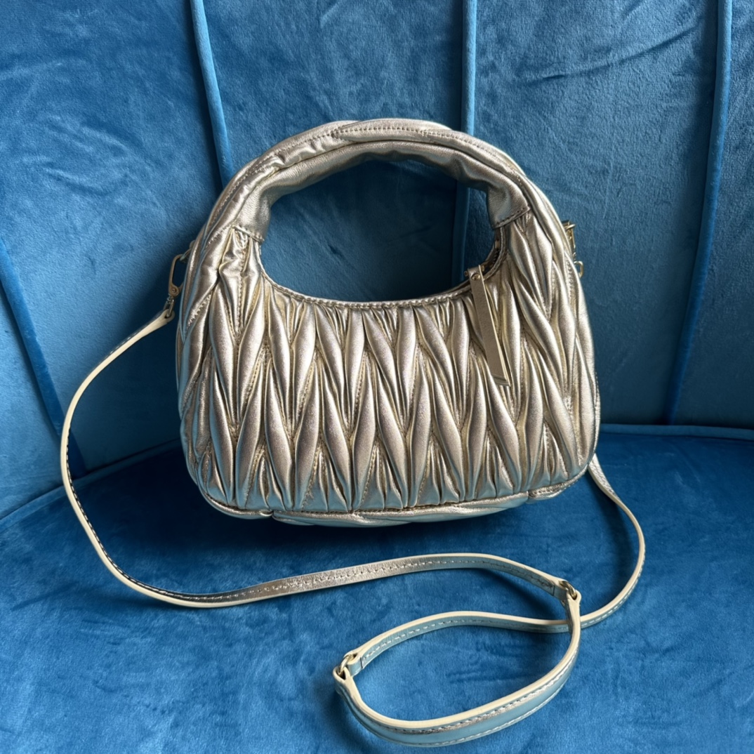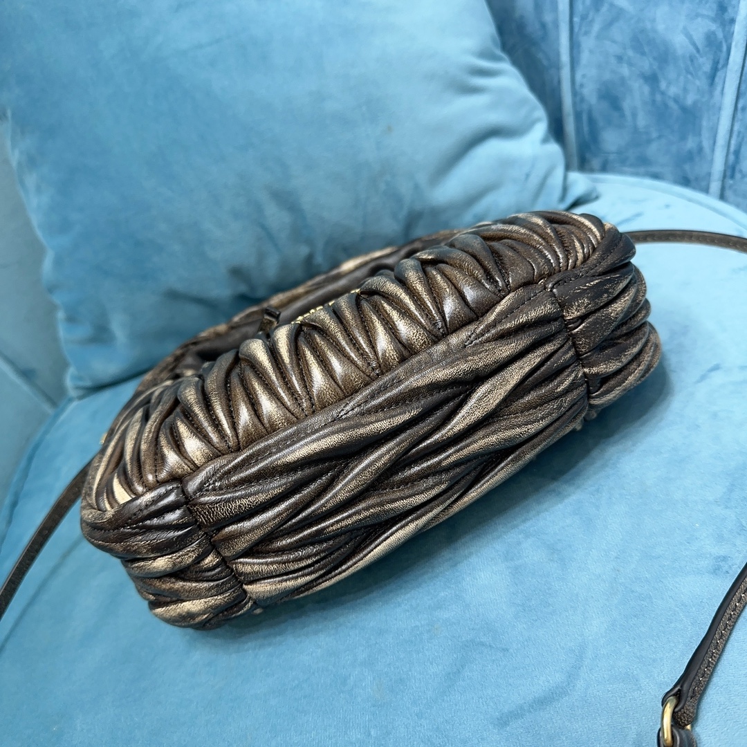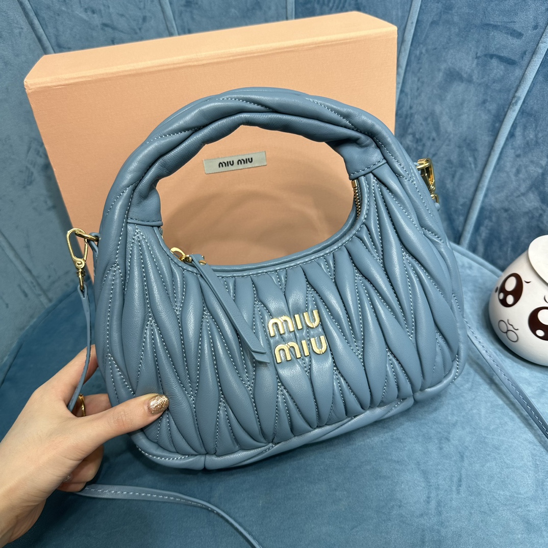 MiuMiu新品MiuWander手袋,采用进口小羊皮经典品牌标志性Matelasse纹理绣花,复古磨砂五金,利用圆孤的曲线,