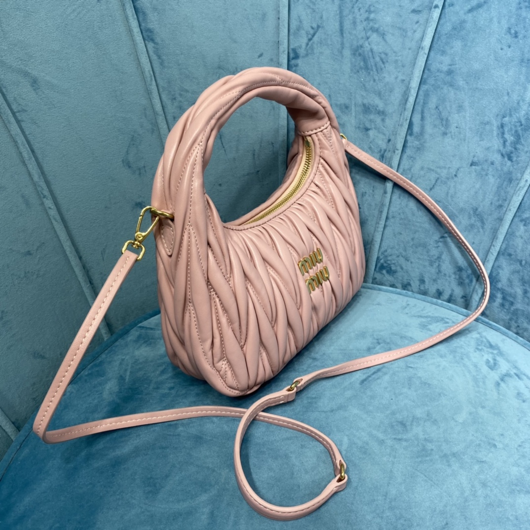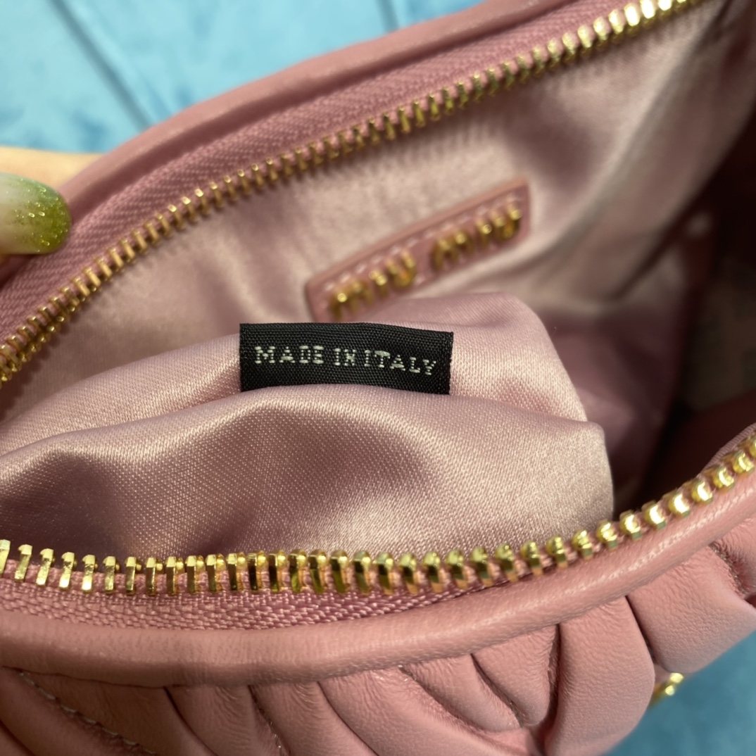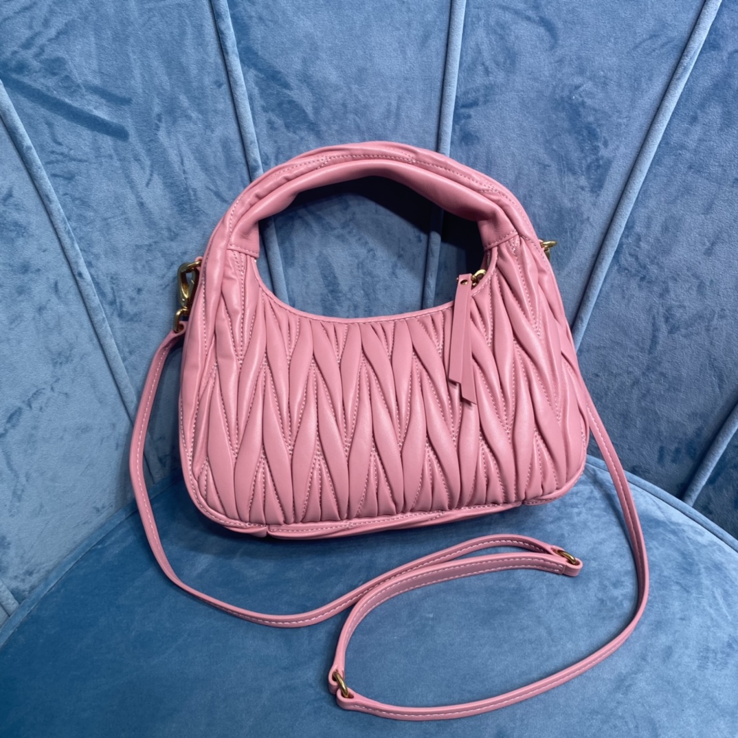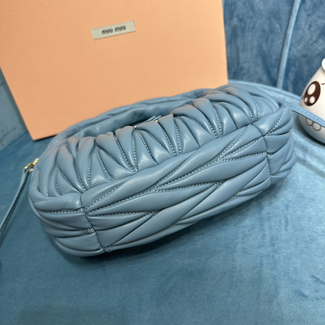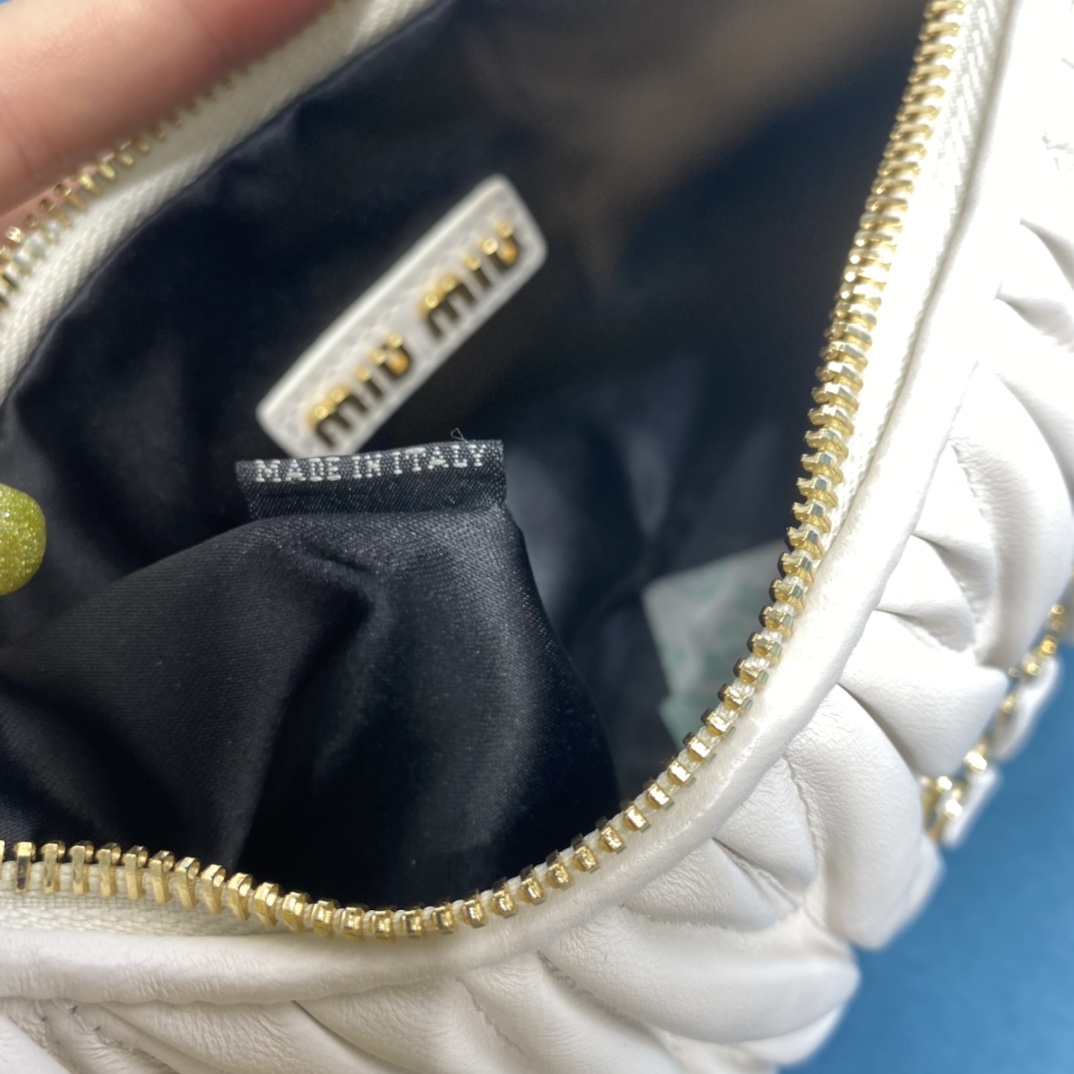 MiuMiu新品MiuWander手袋,采用进口小羊皮经典品牌标志性Matelasse纹理绣花,复古磨砂五金,利用圆孤的曲线,