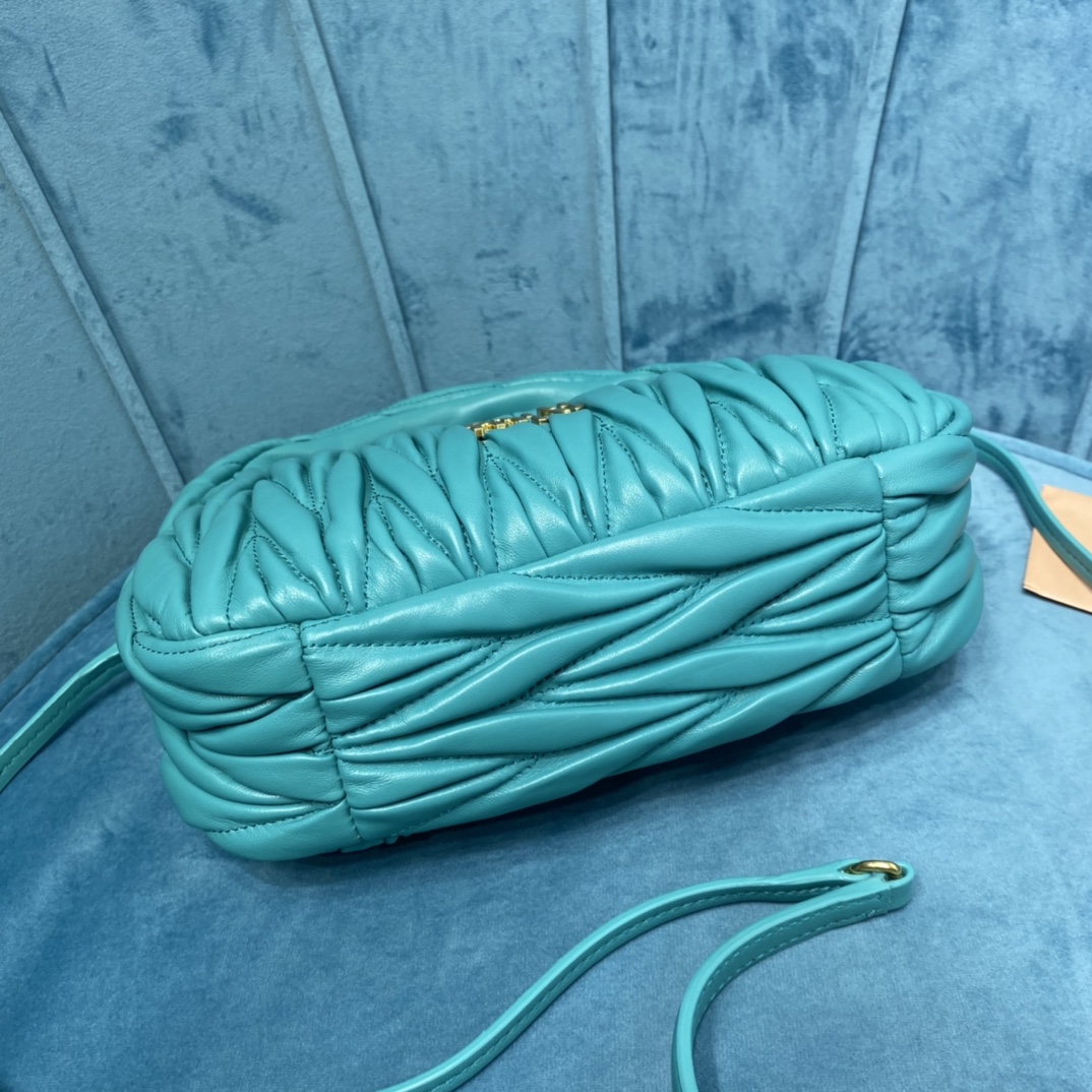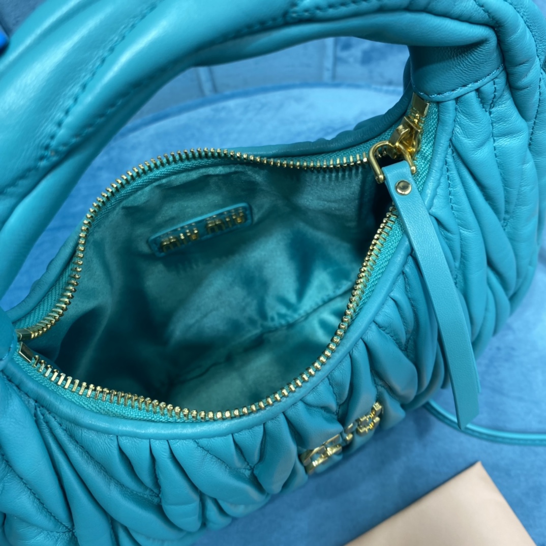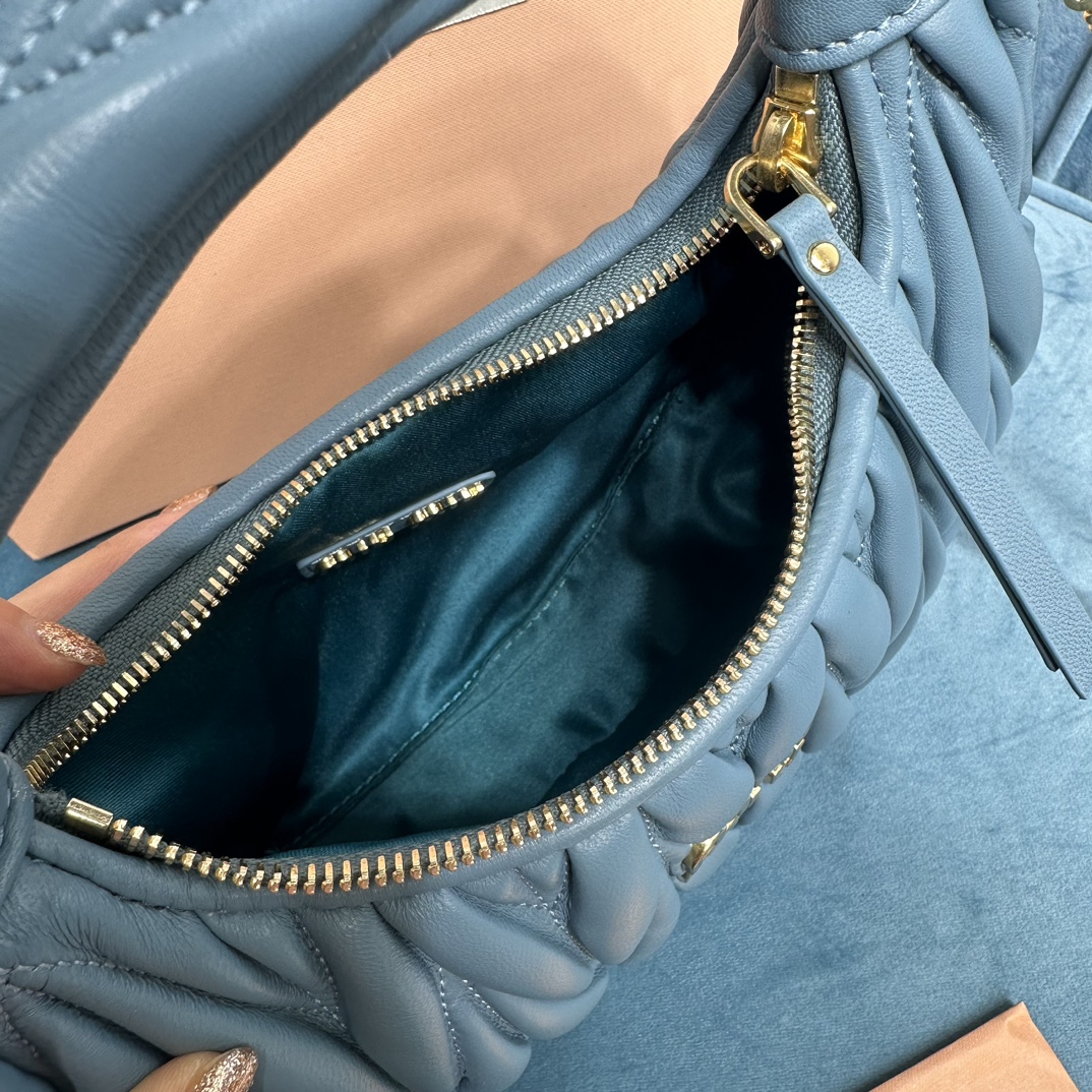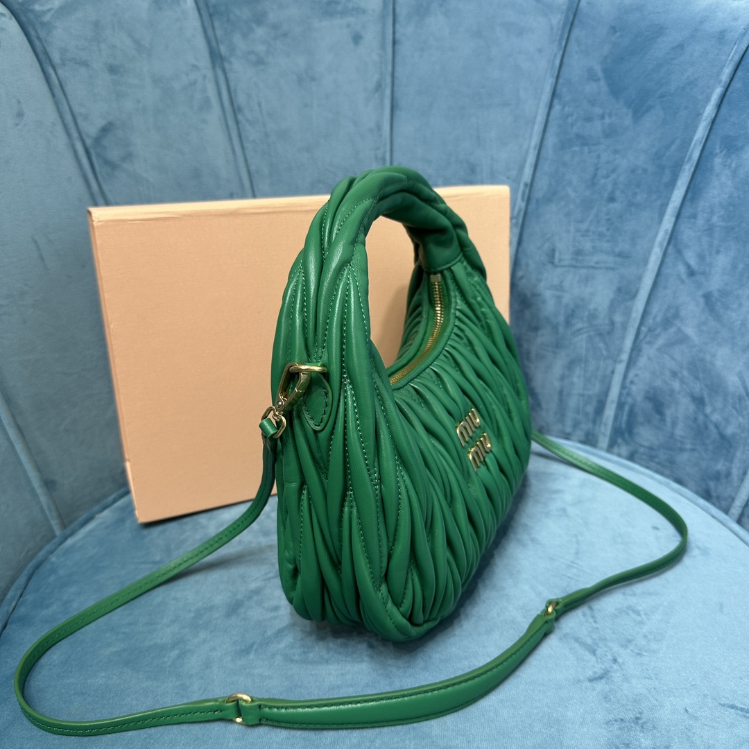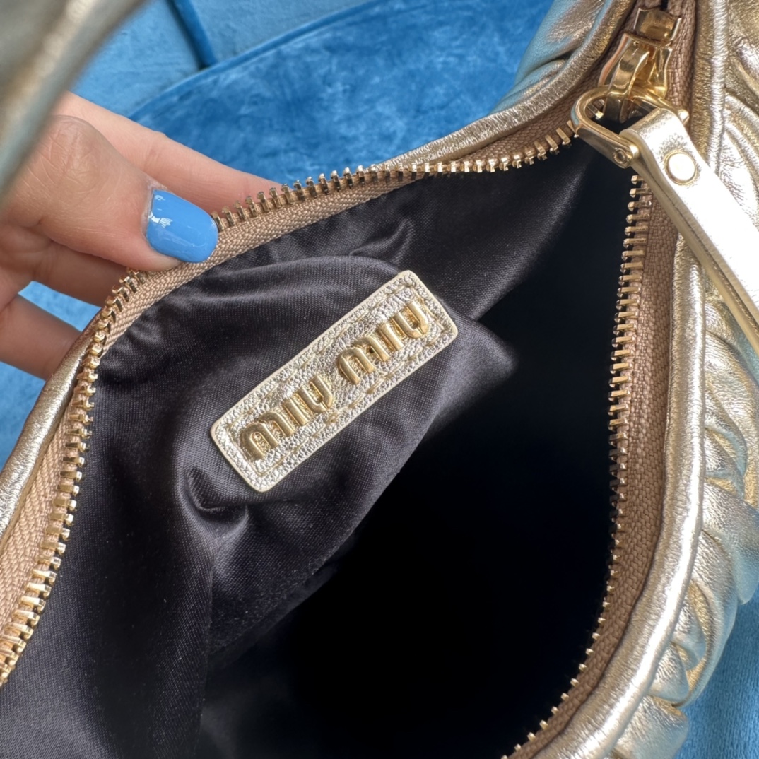 MiuMiu新品MiuWander手袋,采用进口小羊皮经典品牌标志性Matelasse纹理绣花,复古磨砂五金,利用圆孤的曲线,
