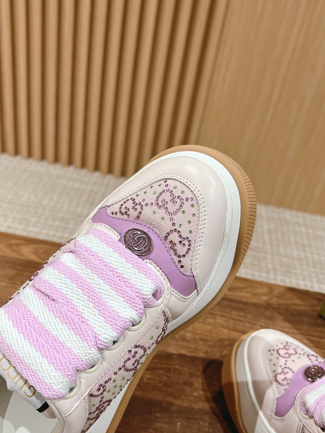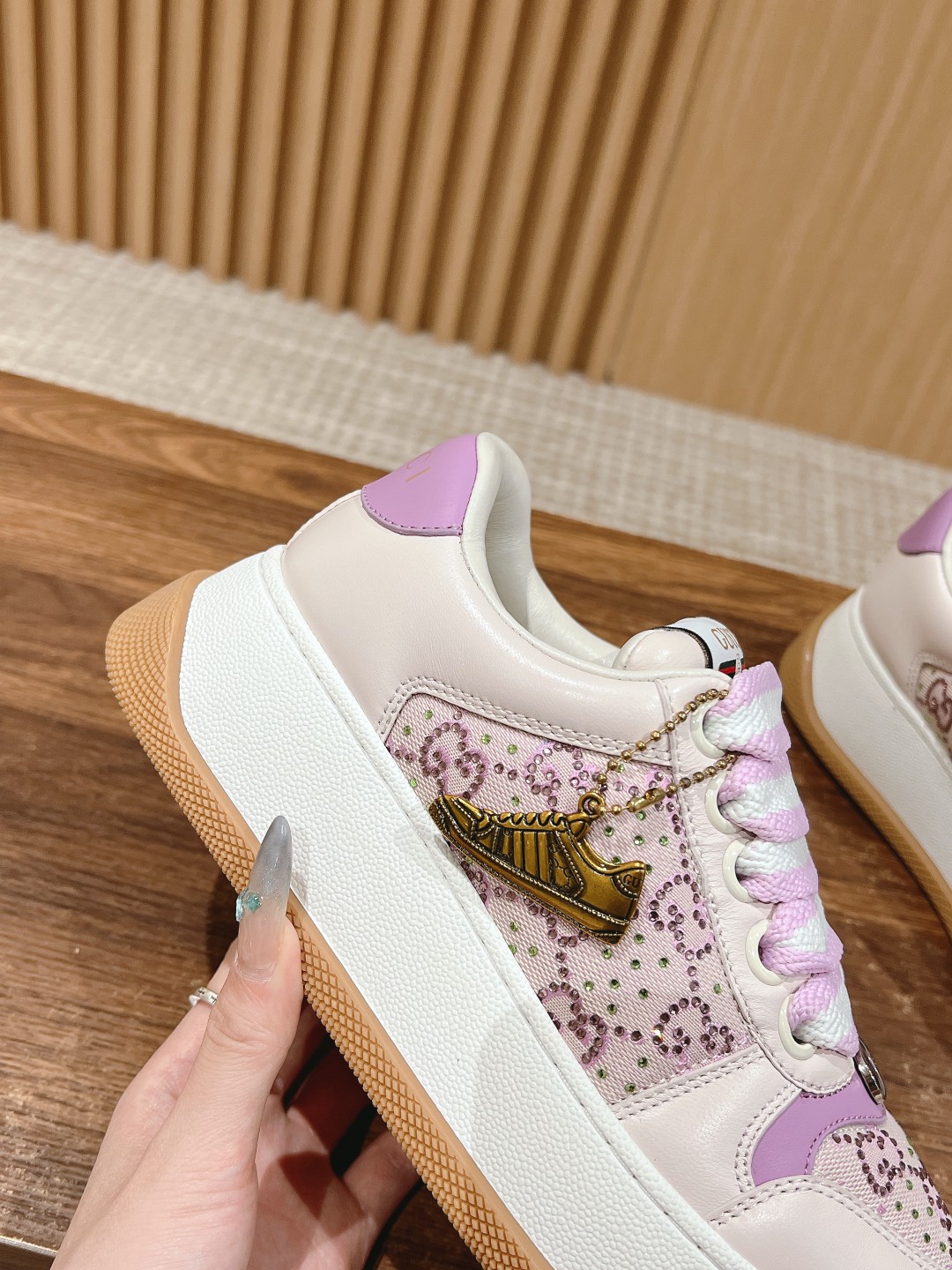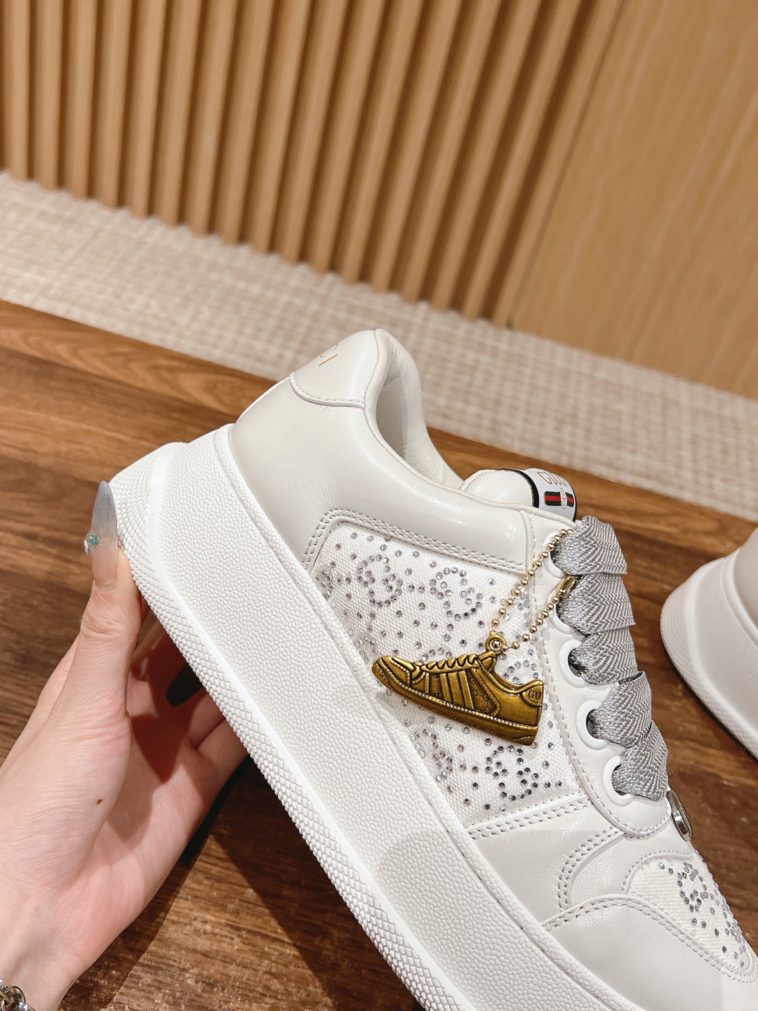 鞋面擦色牛皮拼接经典双G布面料,羊皮内里,垫脚乳胶注塑一体,私模6cm厚TPU双色底