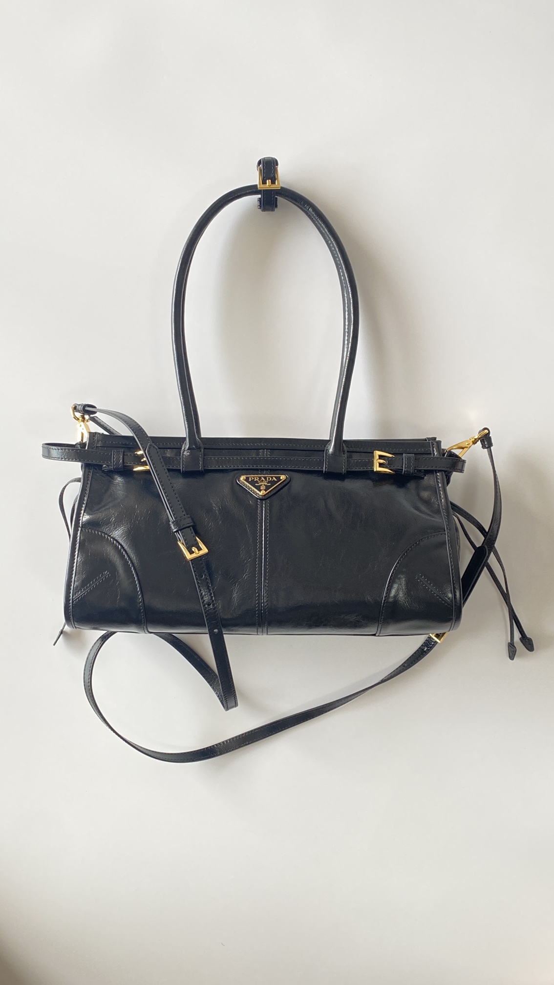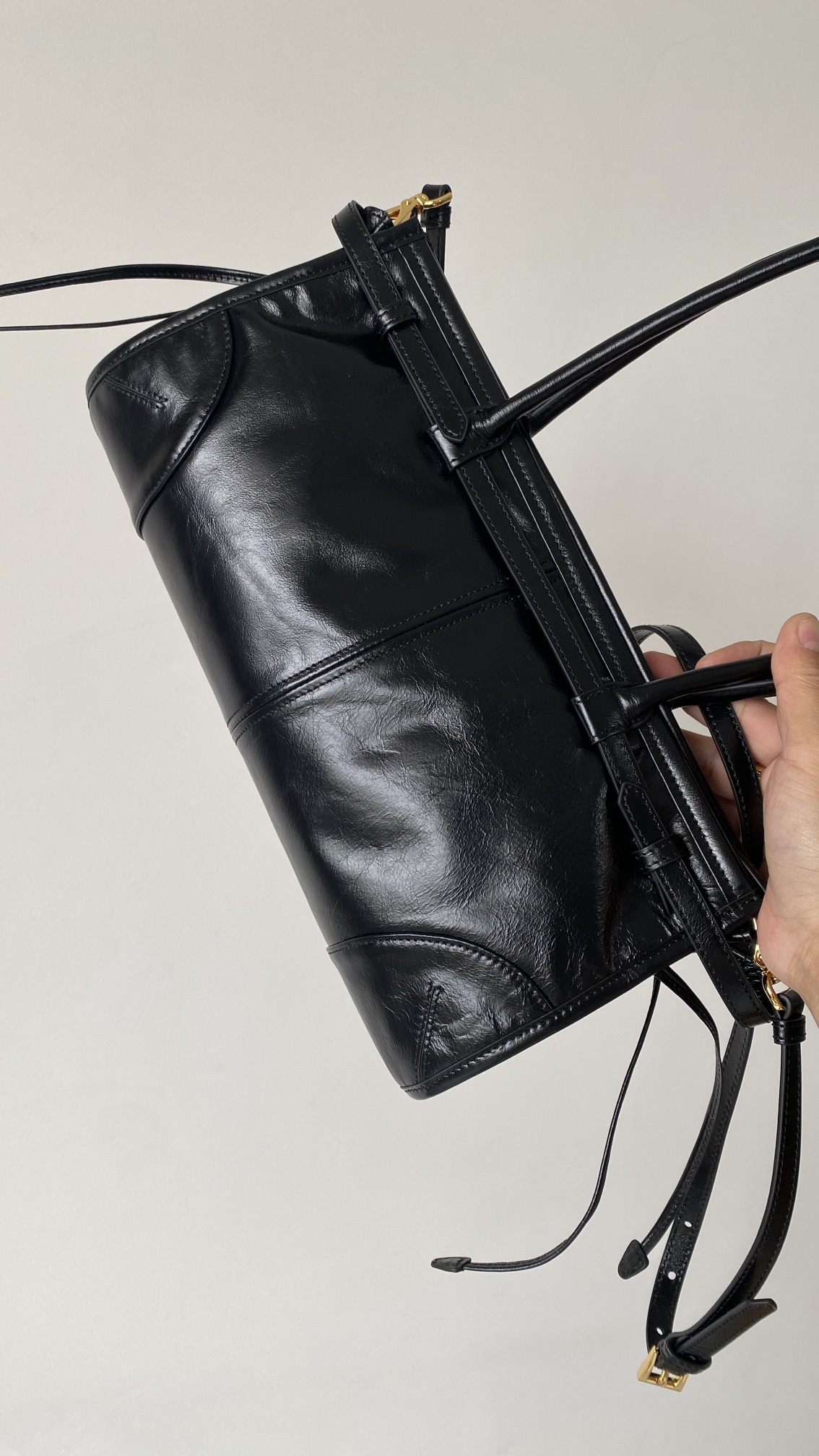 一款具有现代魅力的皮质手提包,既优雅又实用的设计。精致油蜡皮制作,皮质轻盈柔软,自重很轻。宽敞、高利用率的风格,配有金色金属件。设有可拆卸可调节肩带,可提供多种佩戴方式。搪瓷三角徽标增添了品牌标志性
