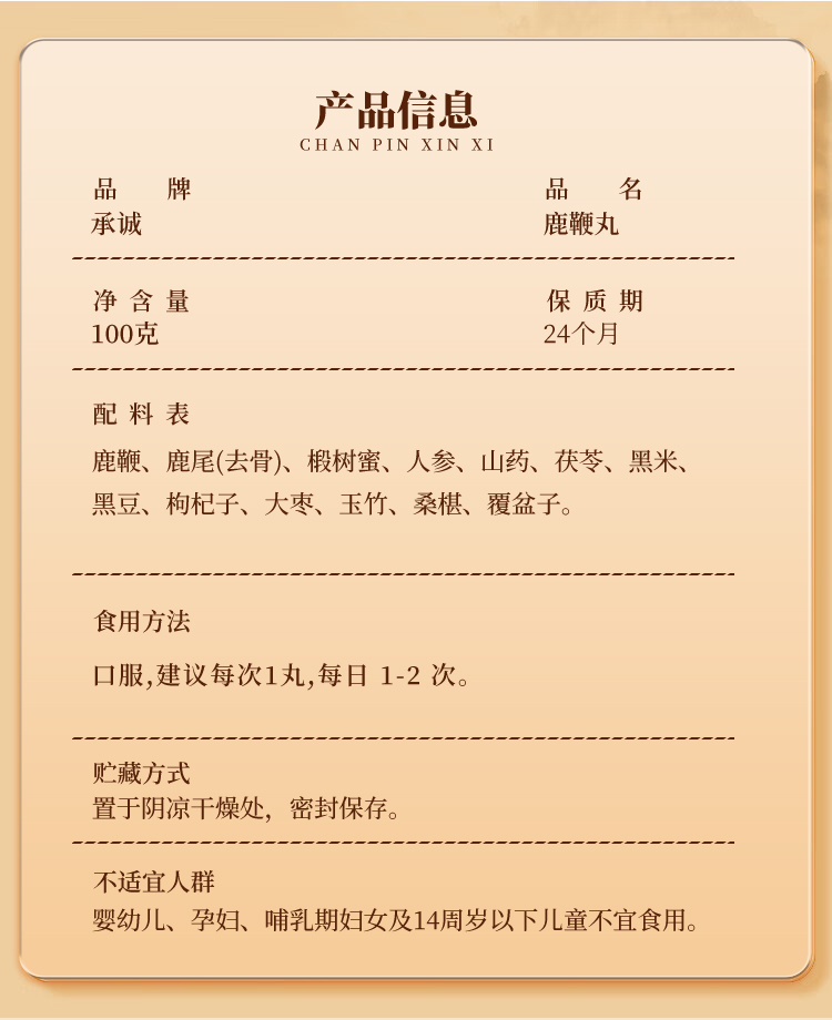 承诚成年壮鹿鹿鞭丸100g(5g*20粒) 商品缩略图0 承诚成年壮鹿鹿鞭丸100g(5g*20粒) 商品缩略图1 承诚成年壮鹿鹿鞭丸100g(5g*20粒) 商品缩略图2 承诚成年壮鹿鹿鞭丸100g(5g*20粒) 商品缩略图3 承诚成年壮鹿鹿鞭丸100g(5g*20粒) 商品缩略图4