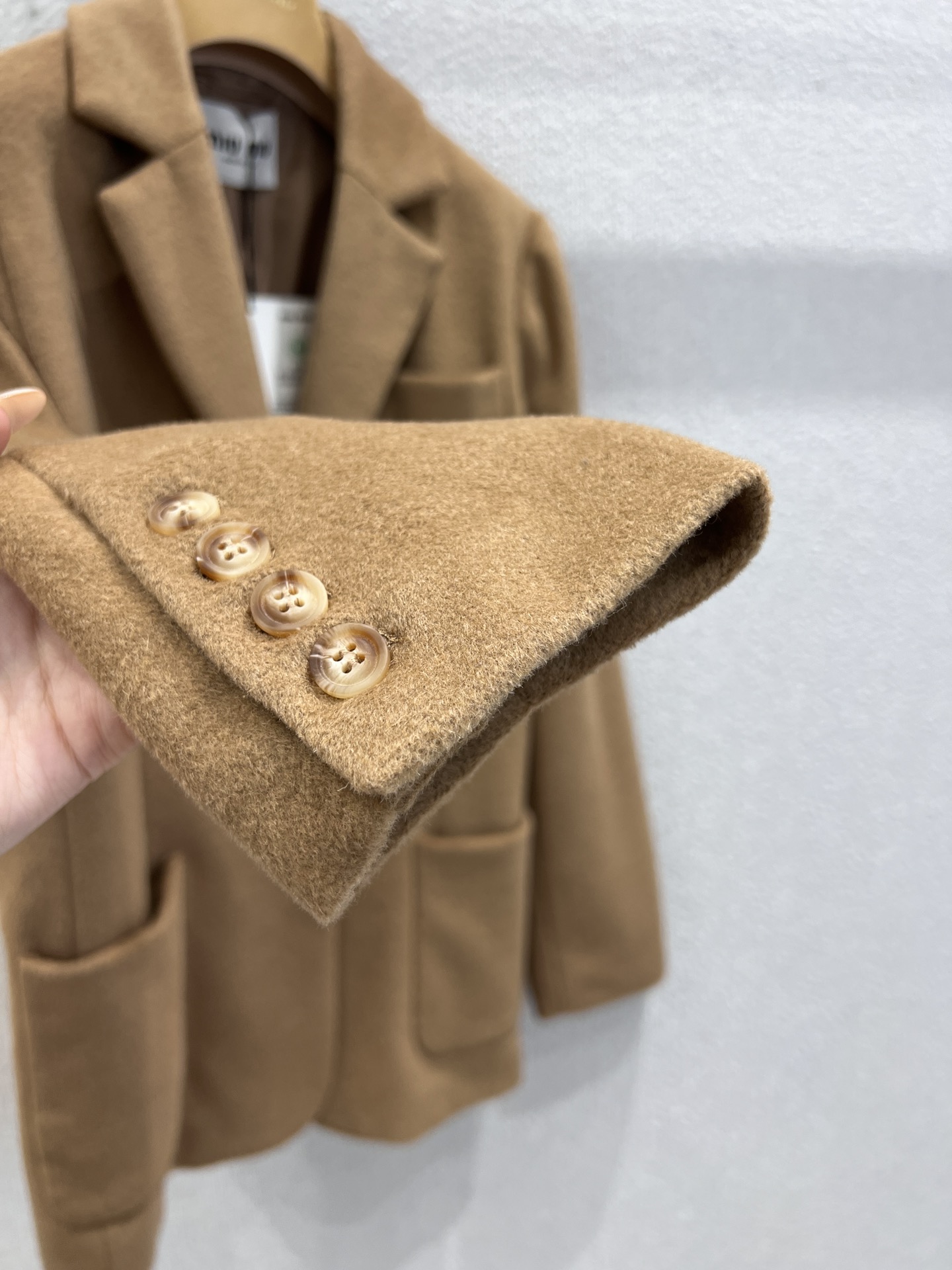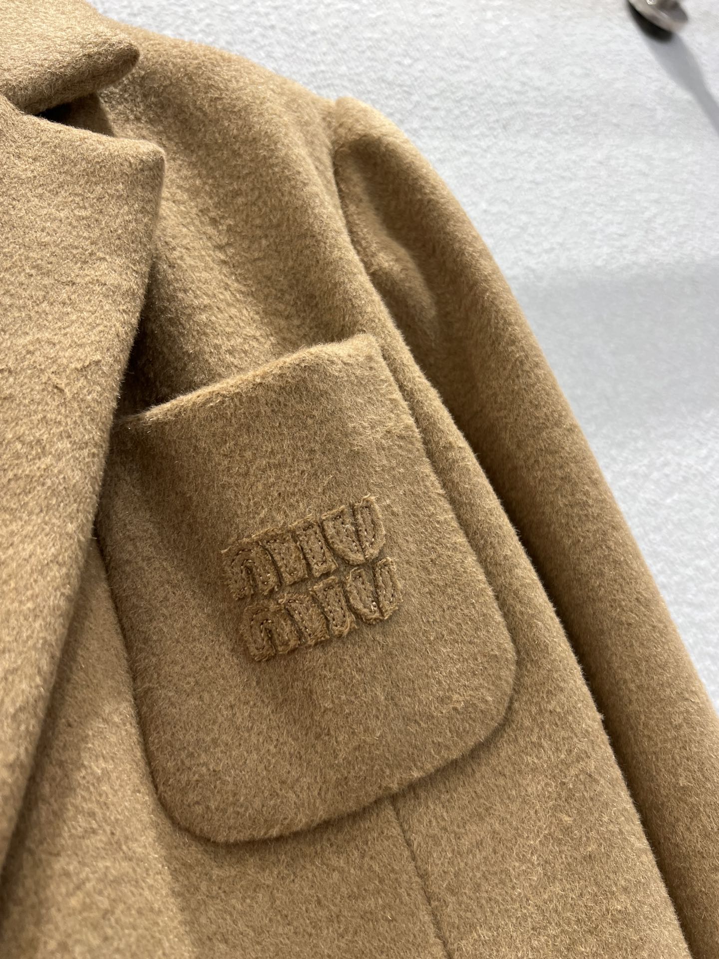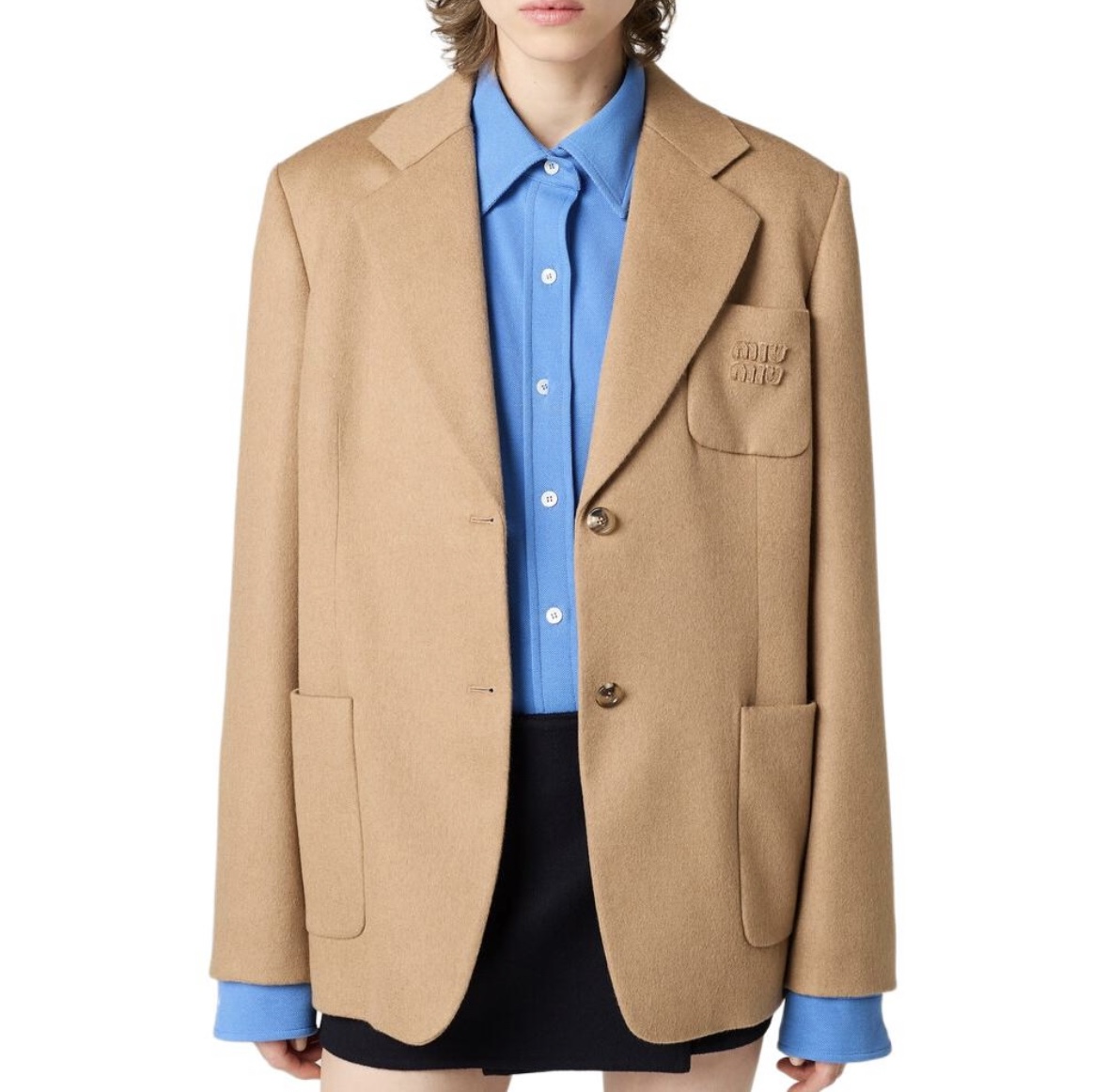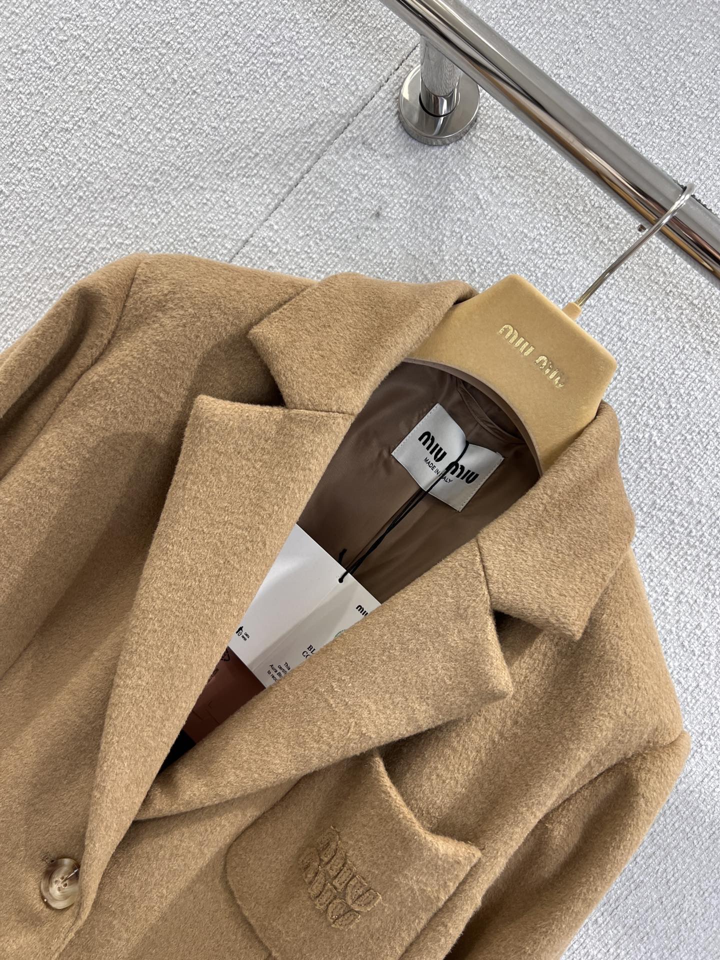 MiuMi* 25FW秋冬新款 贴布绣翻领西装外套丨⚠独家yb开发!高版出品!驼色羊毛面料自带高级质感,经典翻领+双排扣设计是通勤装的优雅底色,而胸口的品牌贴布绣细节,又悄悄泄露了Miu式少女的俏皮心思。宽松剪裁弱化了西装的正式感,却在随性中保留了“上东区大小姐”的慵懒贵气,无论是单穿还是叠搭,都能轻松拿捏风格层次。