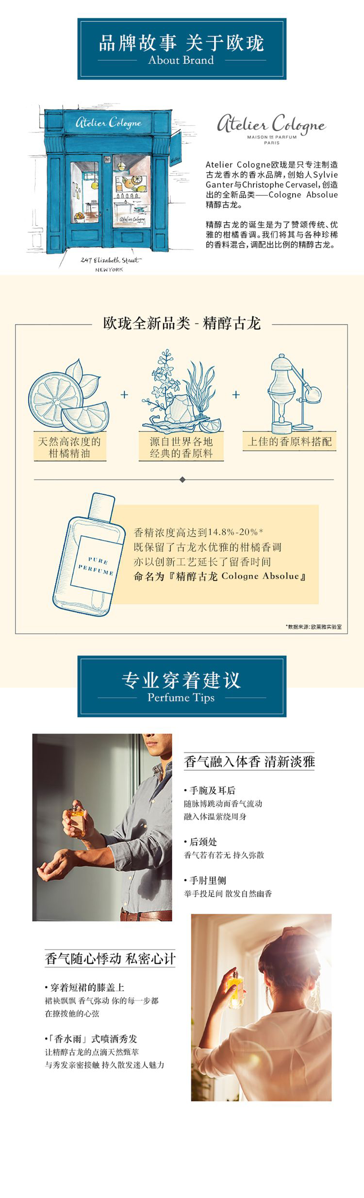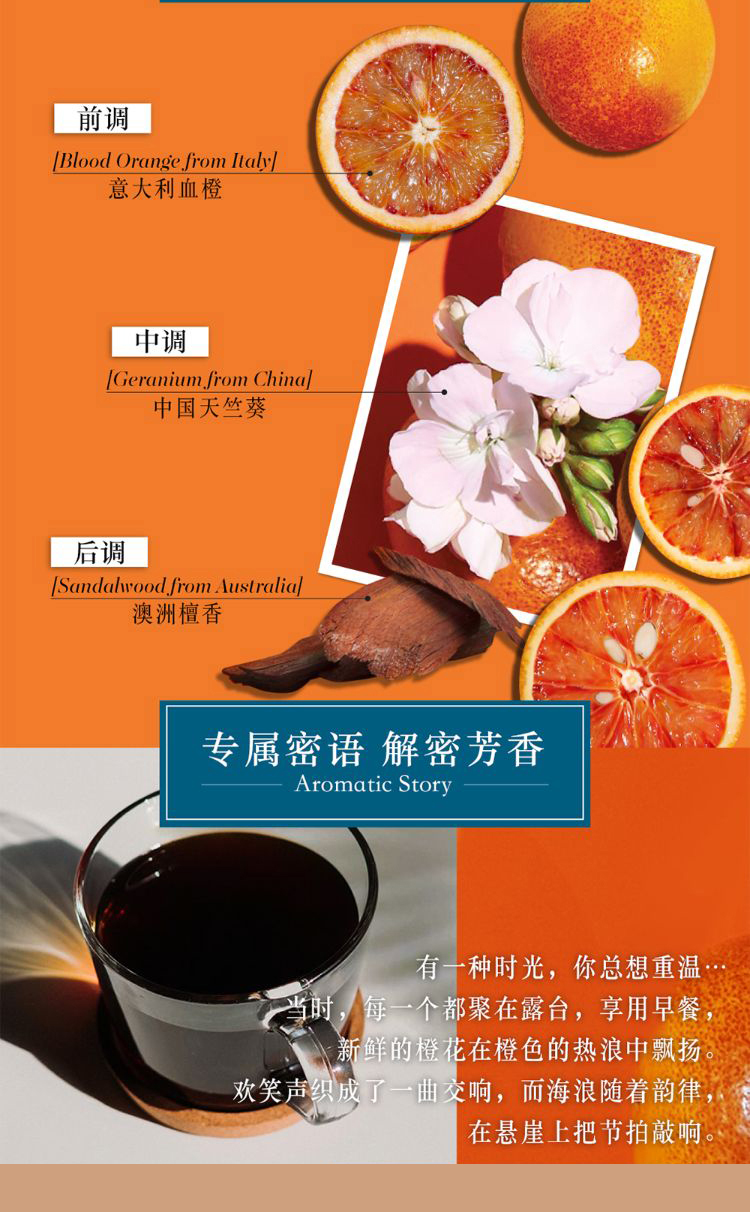 前调:意大利血橙;中调:中国天竺葵;后调:澳洲檀香;赤霞橘光,清爽怡人的血橙味香水。将柔和海风与煦暖阳光汇聚于瓶中。犹如新鲜柑橘剥开的瞬间,整个人都被包裹在满溢橘香之中。就让自己在这沁人心脾的迷人芬芳中沉醉……让这款赤霞橙光血橙味香水的柑橘清香营造出充满欢悦与清沁的和谐均衡。欧珑这款超凡柑橘味香水作品引领你踏上追寻阳光的想像之旅,邀请你坐在柑橘树下,细细观察果实自然成熟过程中的微妙色泽变化。这款中性精醇古龙是最经典的柑橘调香水之一,将花香调与意大利血橙、中国天竺葵和澳大利亚檀香相结合,带来性感迷人的感官体验