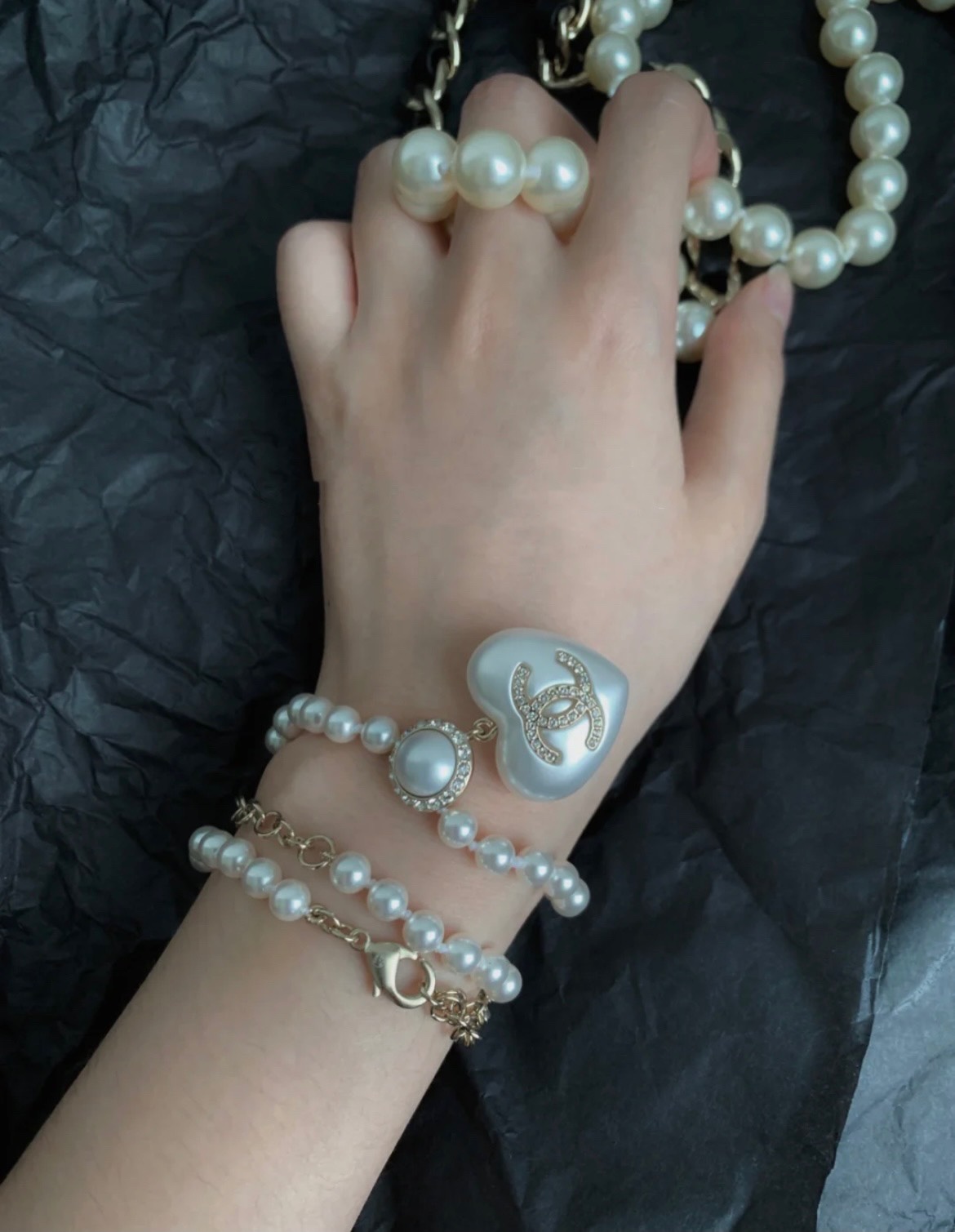 什么也不需要说,看图片即可感受出那种质感,特定的心形配件,颗颗施华洛珍珠色泽光感无懈可击!来,闭眼整套入,请自觉补脑它的完美,强烈呼吁每一个宝宝都必须自留