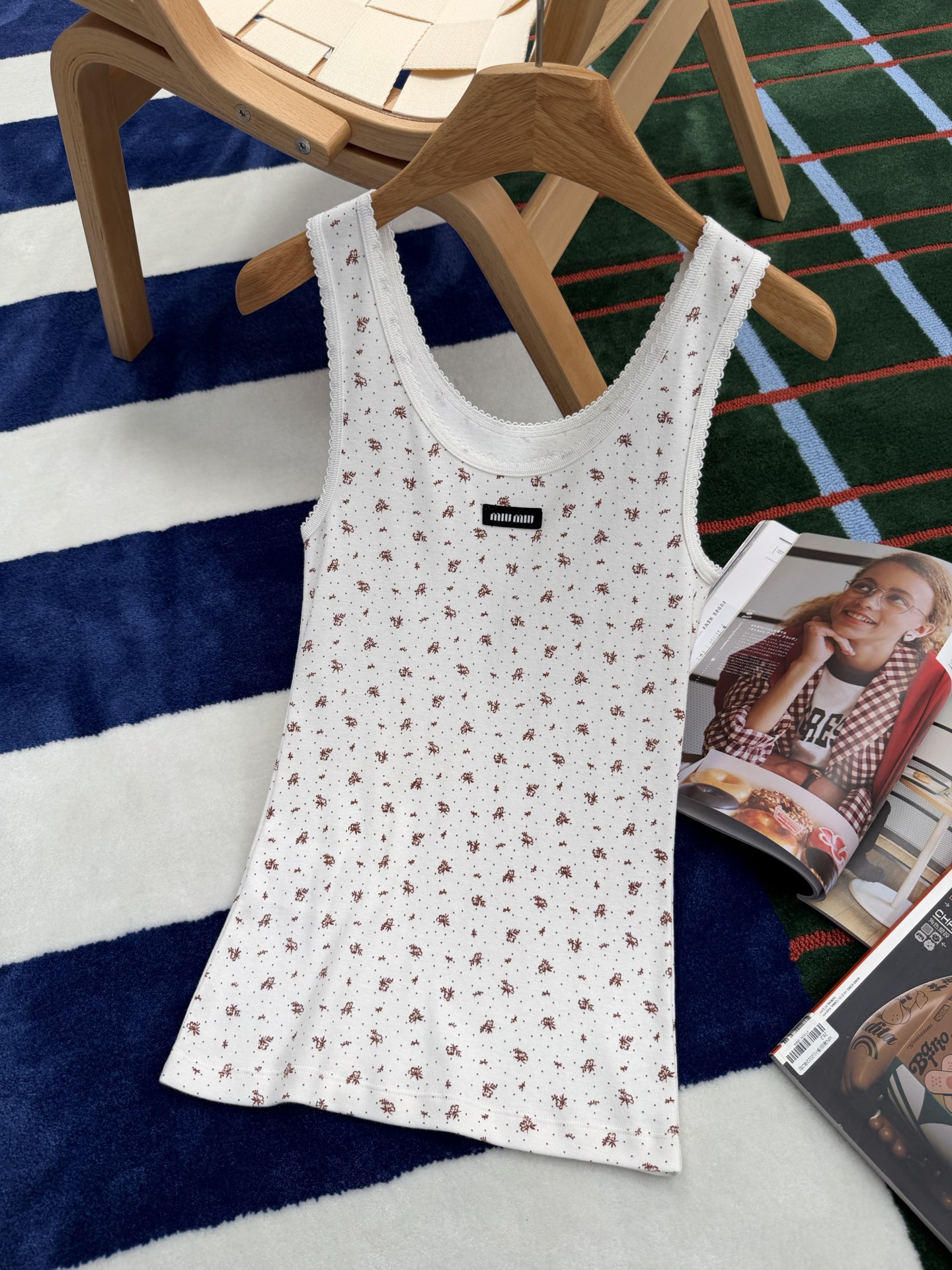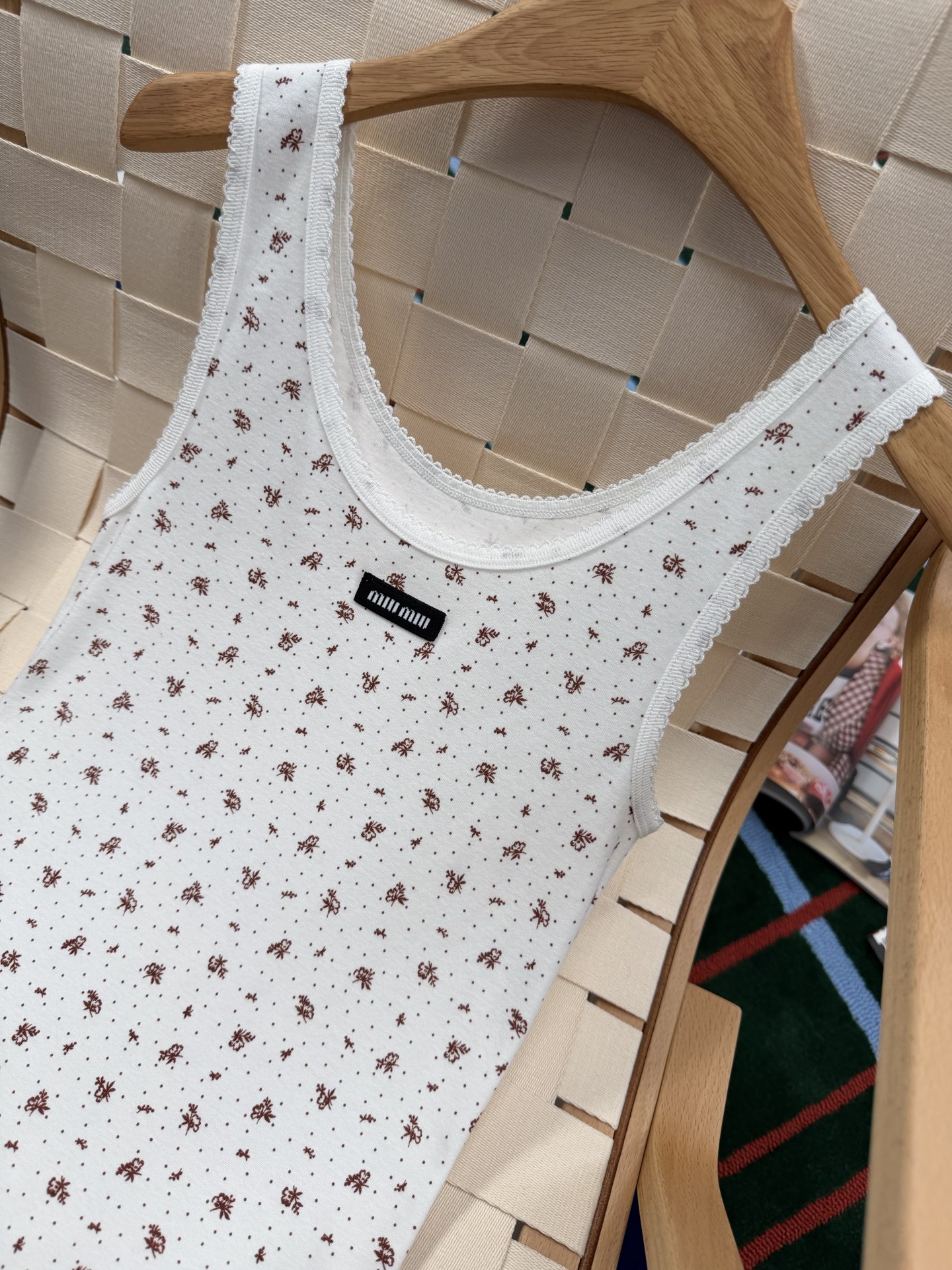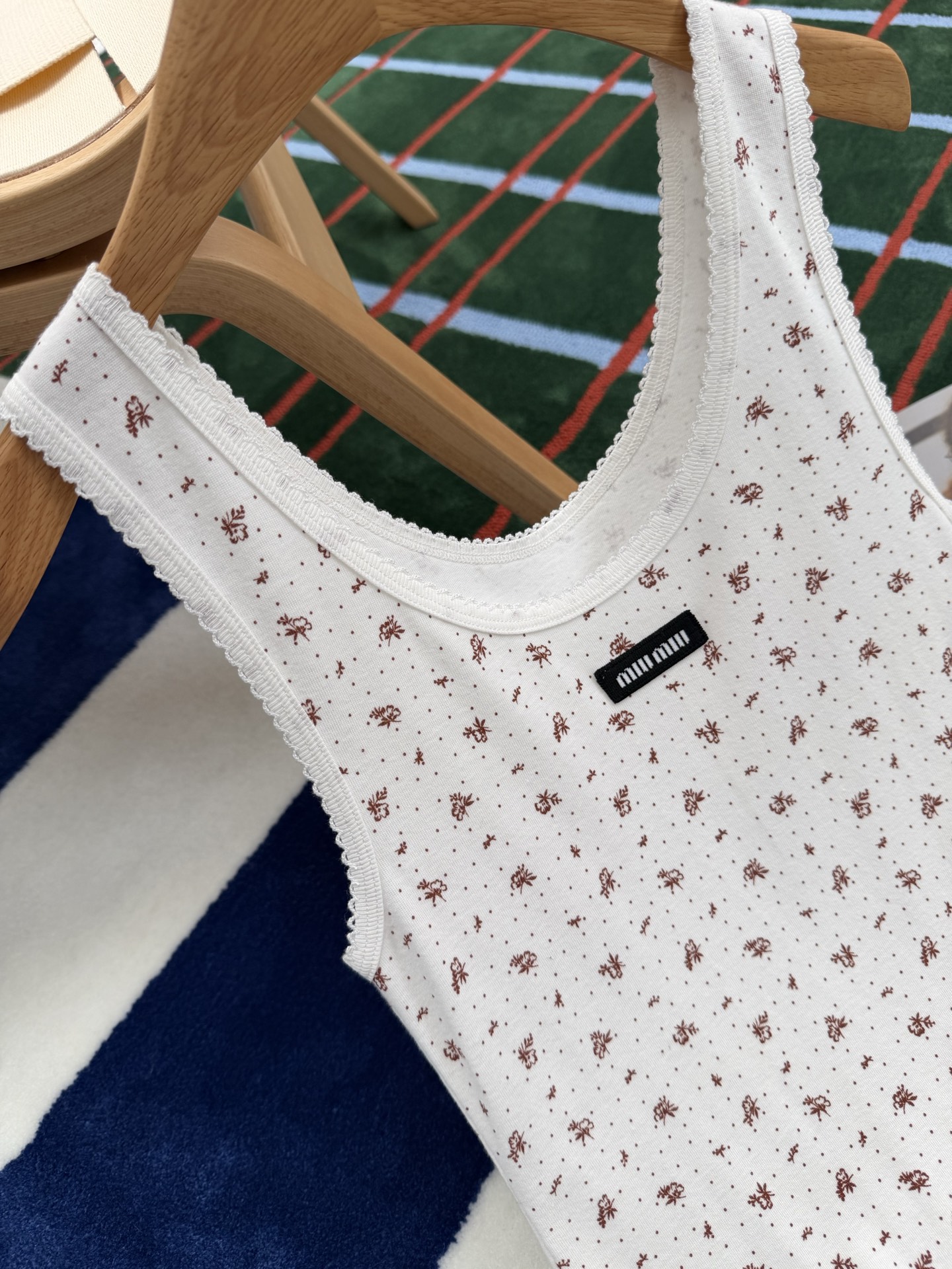 Holiday系列碎花背心, 新品上线,整件背心质感出众,高级感拉满, 胸前点缀精致徽标贴饰,搭配细腻蕾丝花边,细节处处见匠心, 面料选用讲究,肌理细腻,轻松穿出高级氛围感~单穿时尽显柔美与性感,勾勒迷人气质,作为内搭也超吸睛,微微露出的蕾丝与碎花元素,瞬间点亮整体造型,法式慵懒风情轻松拿捏😜 无论是日常出街还是约会聚会,都是不容错过的搭配利器!衣橱必备单品✅ 码数SML