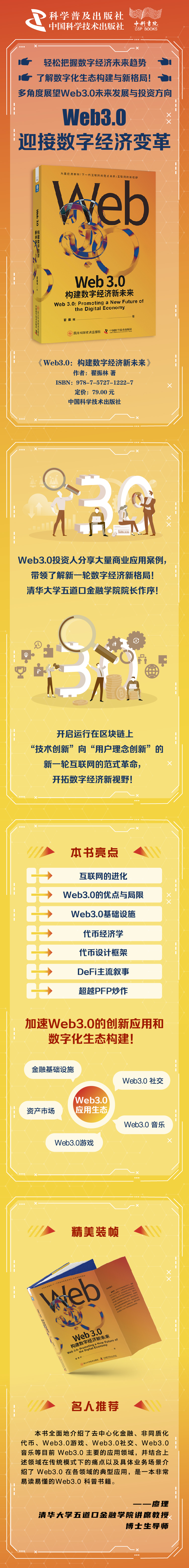 本书是作者团队依托其丰富的 Web3.0 行业研究经验与深入的行业思考,所写作的Web3.0 科普类书籍,全面地介绍了去中心化金 融、非同质化代币、Web3.0 游戏、Web3.0社交、Web3.0音乐等目前Web3.0主要的应用领域,并结合上述领域在传统模式下的痛点以及具体业务场景介绍了Web3.0在各领域的典型应用,是一本非常易读易懂的Web3.0科普书籍。