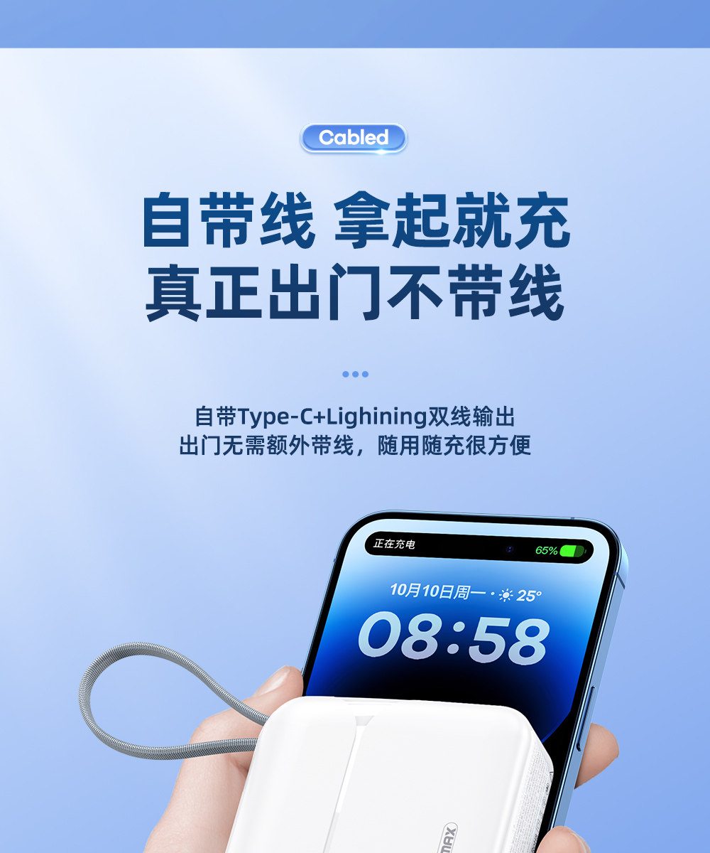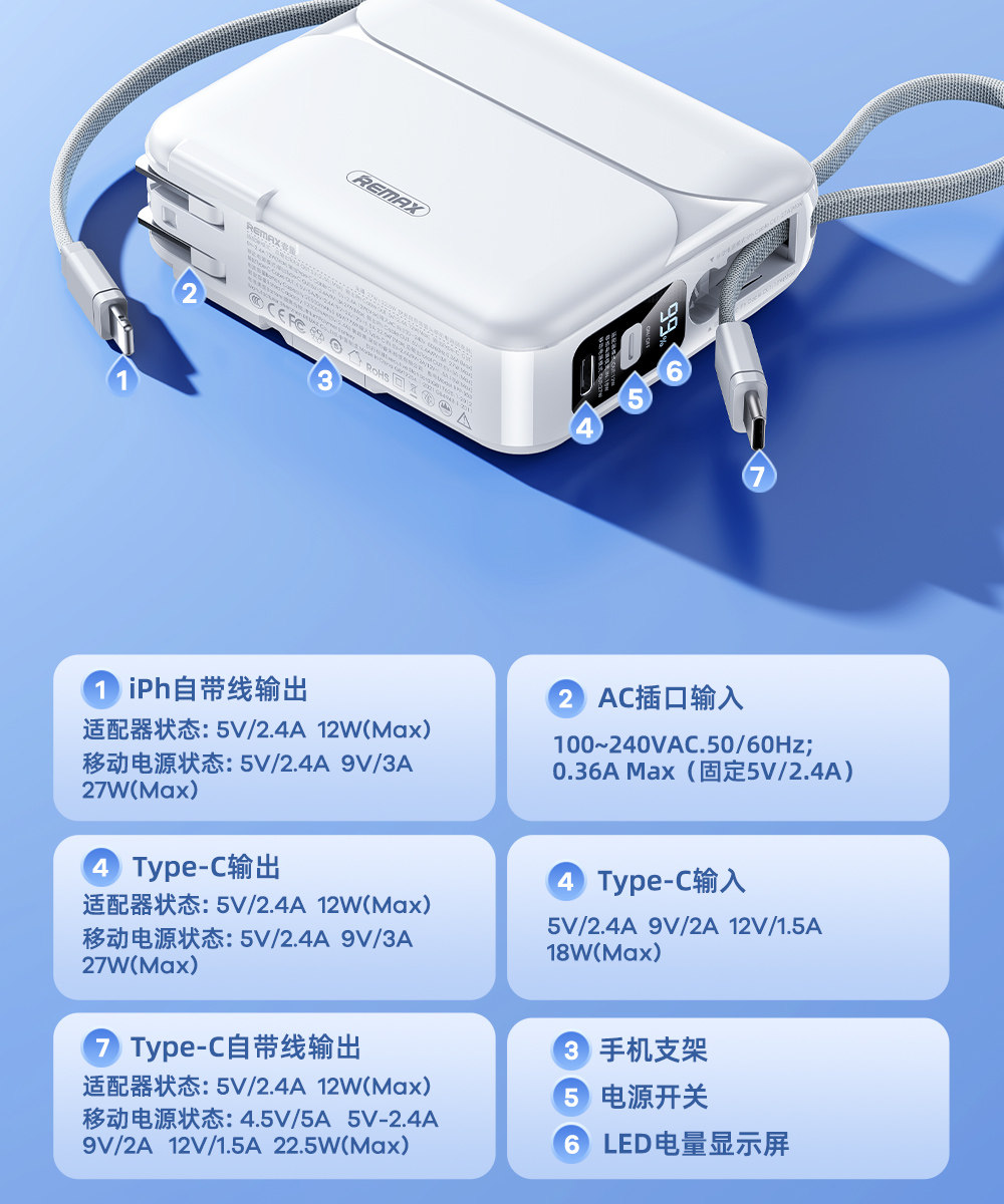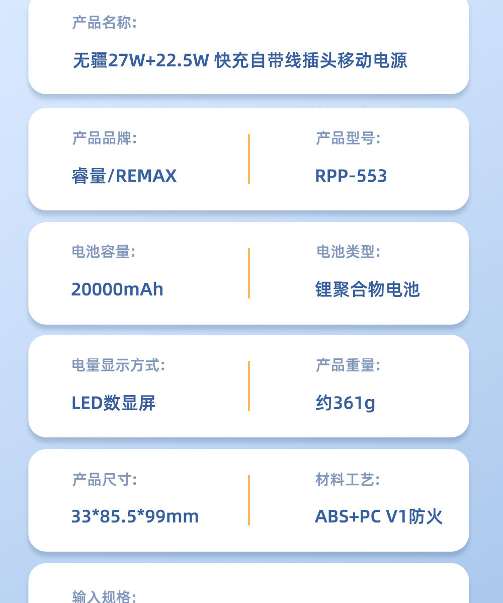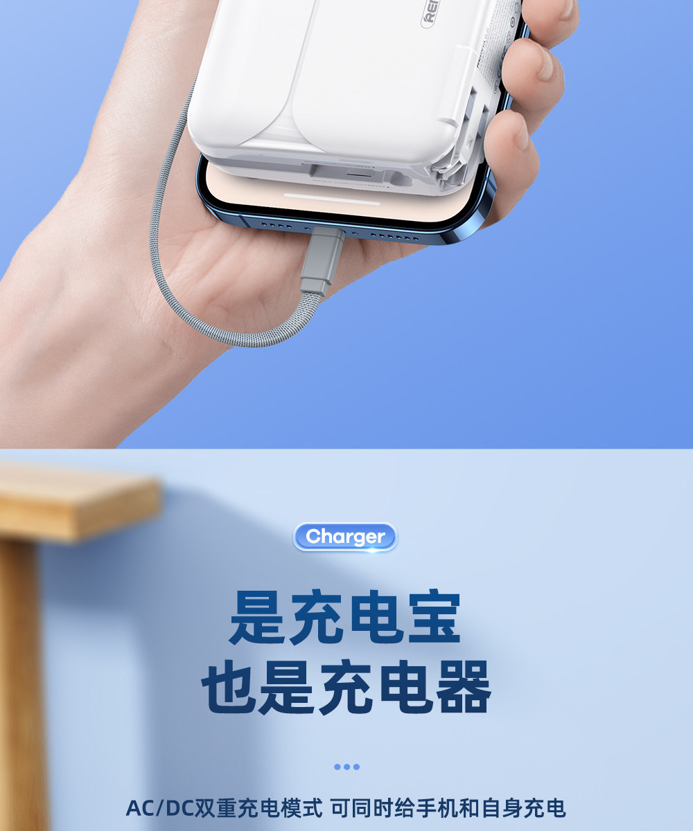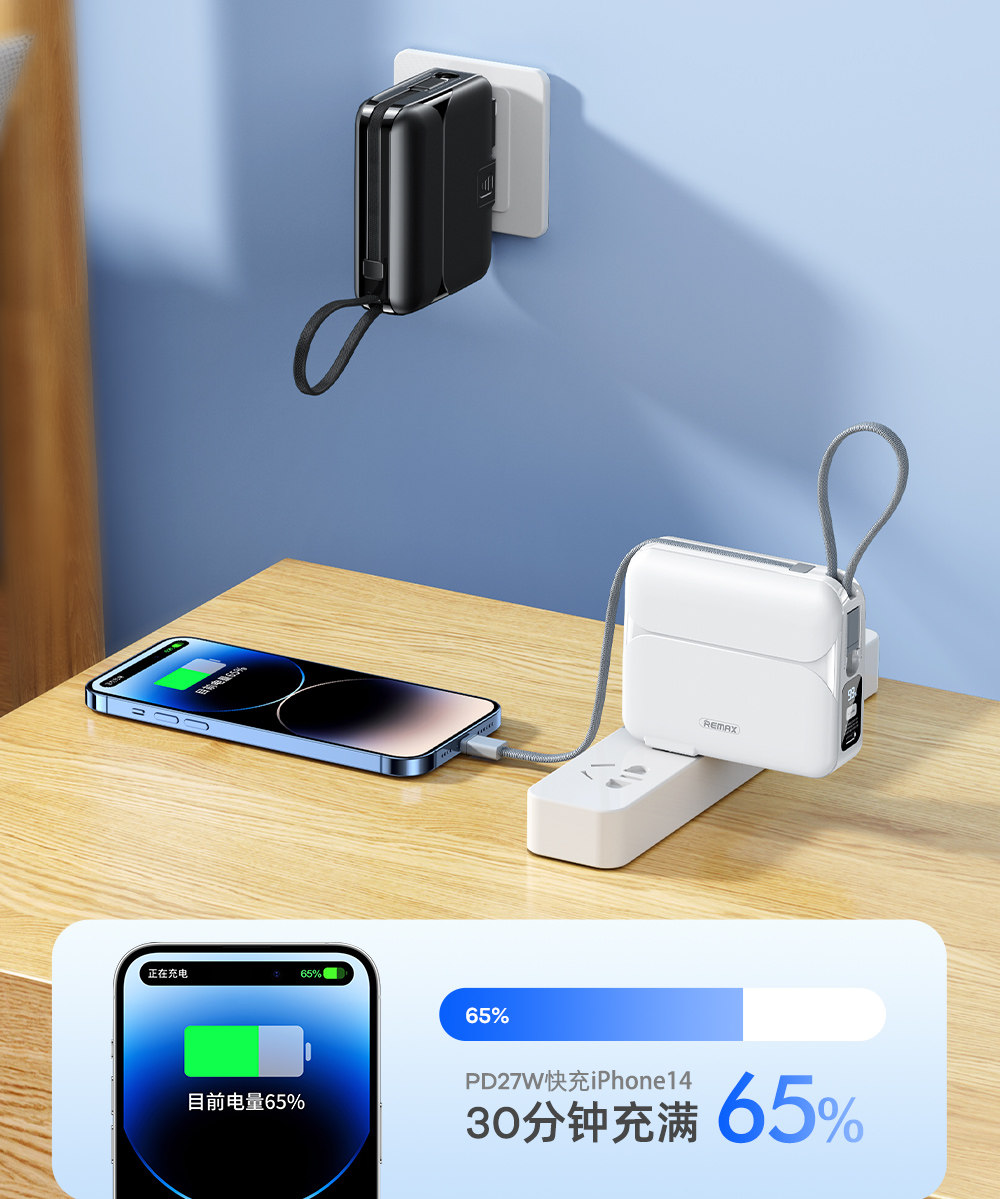 【新国标3c认证】remax睿量充电宝20000毫安自带双线27W快充