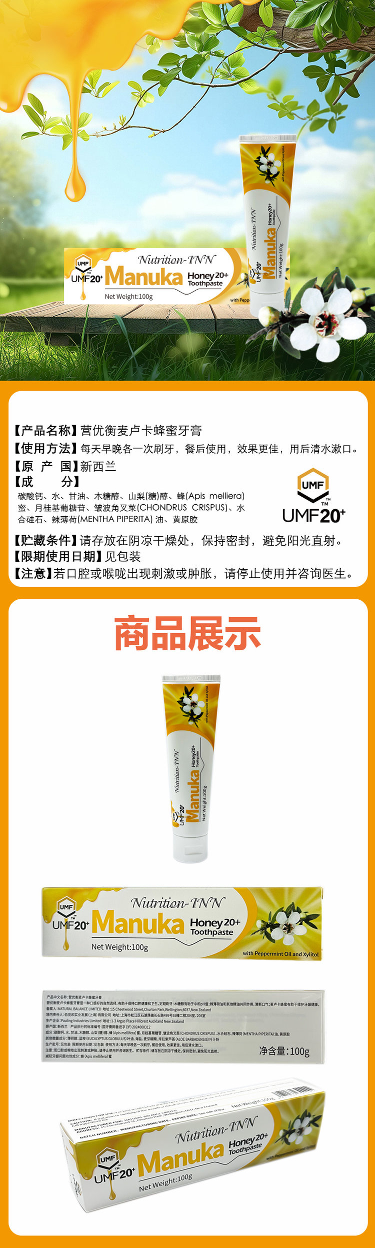 【品名】新西兰 Nutrition-INN麦卢卡蜂蜜牙膏 祛黄提亮 100g/支 【规格】100g/支 【保质期】3年 【产地】新西兰 【发货包装】独立包装 【发货地】上海 【发货快递】圆通 【补邮费地区】新疆、西藏+20元 内蒙古、宁夏、青海+12元 【发货时效】48-72小时,周末节假日顺延 |