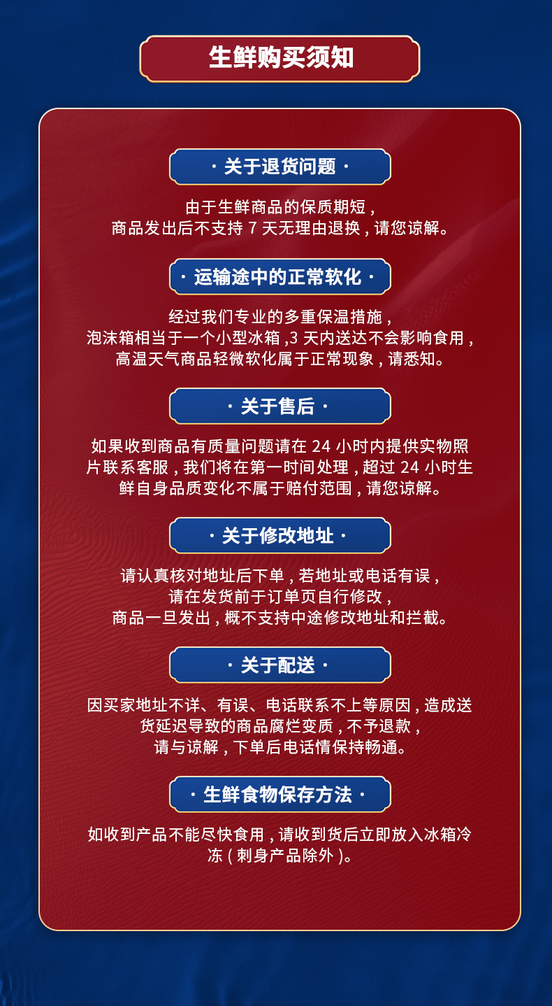 【关于售后】1.生鲜产品一旦发出后拒绝任何形式拒签/拒收!下单前一定要留对信息,介意者慎拍!收到产品后当场验货,如出现问题,请及时拍照并与我们联系,我们会第一时间处理的。2.生鲜产品每天中午9点提交订单后不允许改地址!不接受退款!发货和上传运单有24-48小时时差,没有运单/单号无物流 不代表没有发货。