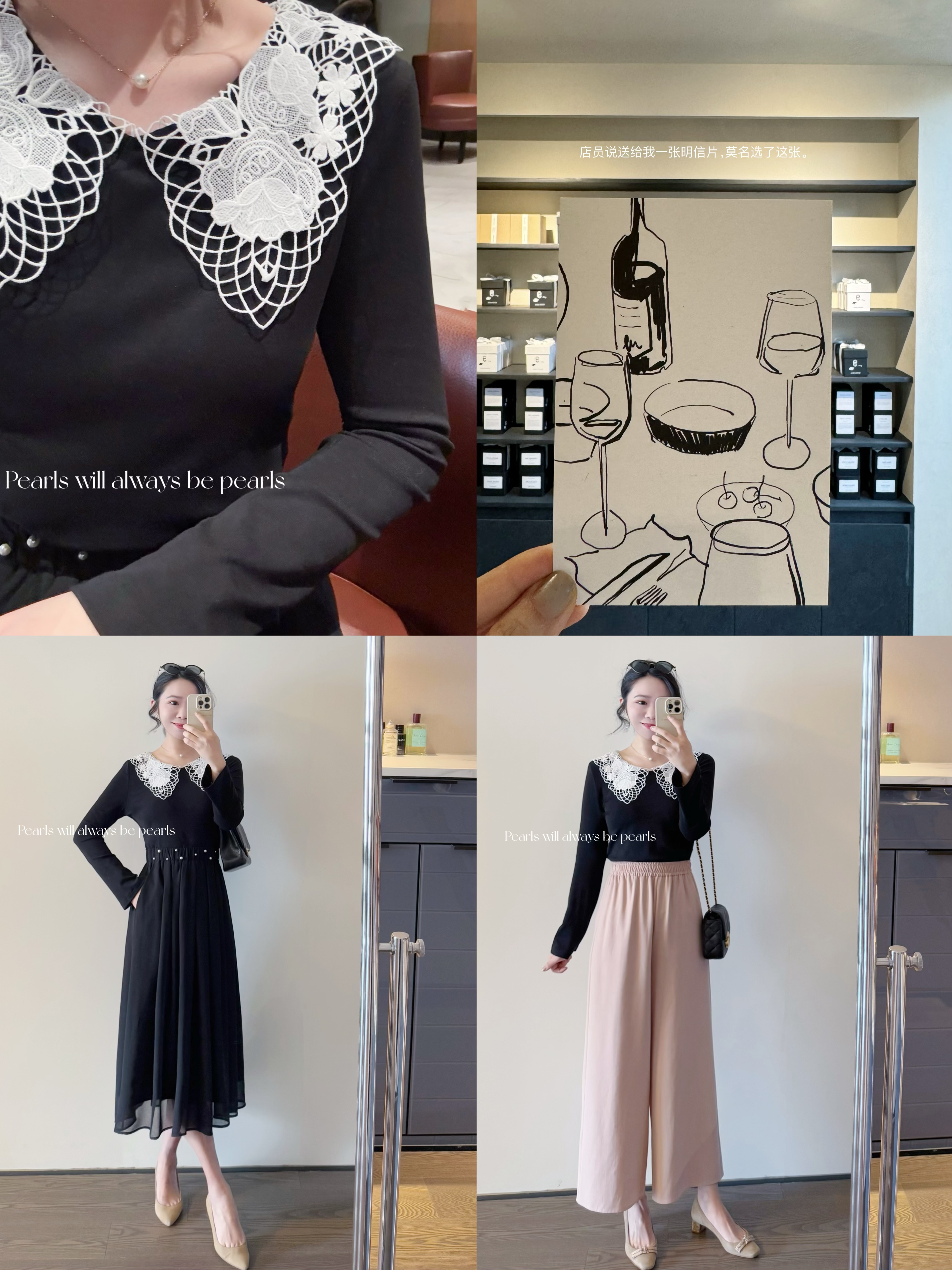 花之物语 定制精致水溶蕾丝花边点缀于衣领 修身显瘦微微喇叭袖设计T恤 黑色