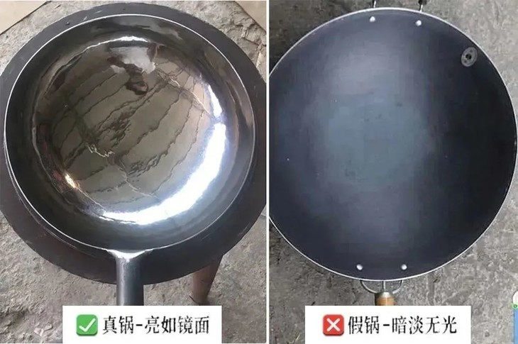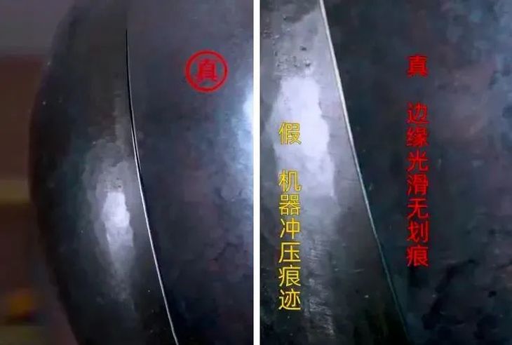 真的章丘铁锅边缘光滑无划痕,而机器锅身上总会留下冲压痕迹。