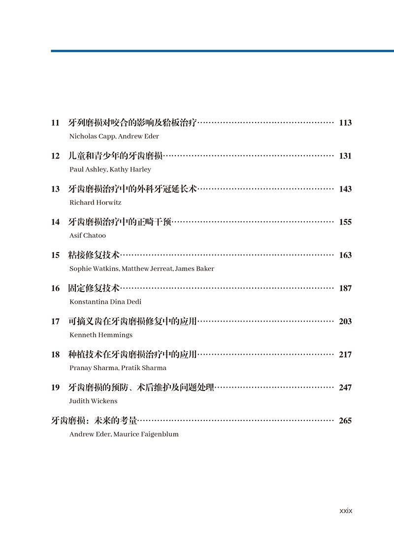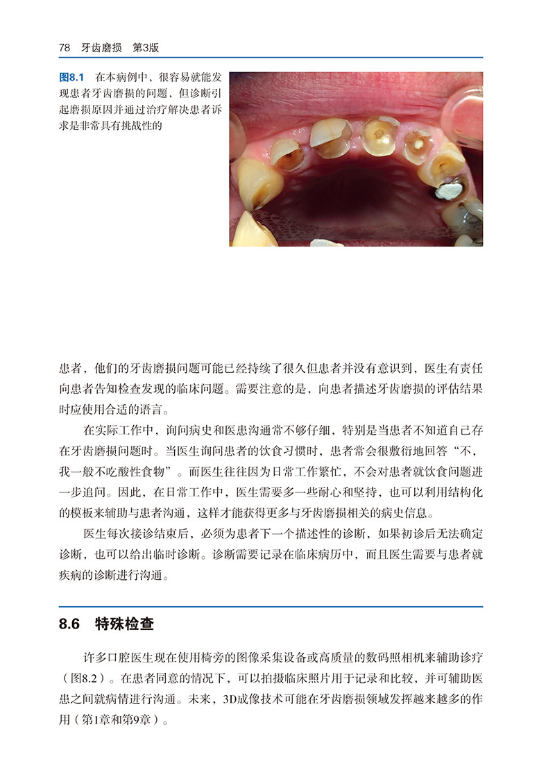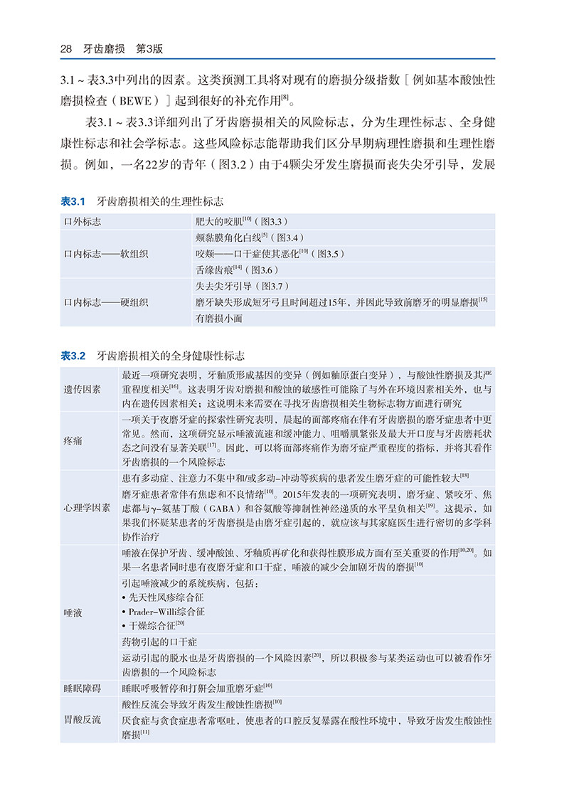 本书目前已更新至第3版,这是一本关于牙齿磨损及其临床管理的权威参考图书,内容系统、翔实,配图精美。随着人均寿命的提高、天然牙保存情况的改善,牙齿磨损已逐渐成为困扰许多患者的常见临床问题。根据英国一项近期新的调查,75%的成年人以及50%的儿童的天然牙列都存在临床可检测到的、不同类型的牙齿磨损。在这本近期新版本的图书中,作者针对牙齿磨损这一临床常见问题进行了详细和系统的阐述,能够帮助临床医生通过适当的技术辨别引起酸蚀、磨损、磨耗的病因,并指导医生为患者制订和提供合适的综合治疗管理方案。临床工作中,当医生遇到与牙齿磨损诊断、预防控制和综合治疗管理方案制订有关的难题时,都可以通过阅读本书获得适当的指导。在本书中,作者不但更新了之前的章节,还邀请了数名英国和欧洲其他知名的相关领域专家编写了全新的章节内容,介绍了牙齿磨损领域的新进展。因此,本书不但适合临床医生学习,也能为正在学习的口腔医学生提供很大帮助。