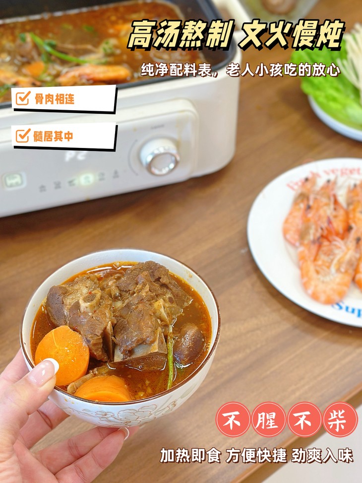 必须夸夸它的便捷性!打工人下班累到瘫,根本没力气做饭,这个羊蝎子简直是救星🌟 不用焯水、不用炒料,连锅都不用换,拆袋加热就能吃。真材实料不掺假,肉量扎实看得见,性价比直接甩外面馆子十条街!
