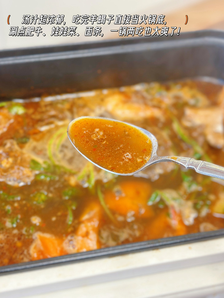 最绝的是它的汤汁!醇厚浓郁,带着羊蝎子的鲜和卤料的香,吃完肉直接倒进火锅里,涮肥牛、娃娃菜、金针菇、手擀面… 秒变羊蝎子火锅局!汤底鲜到掉眉毛,连涮三碗面都不够,一锅两吃简直是懒人福音!