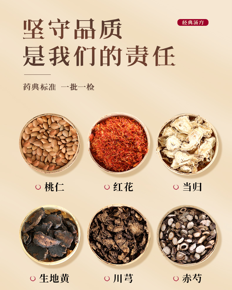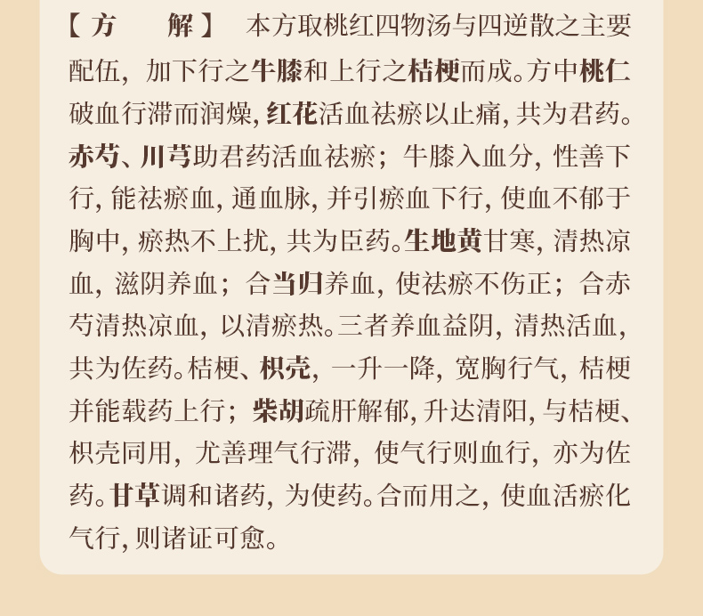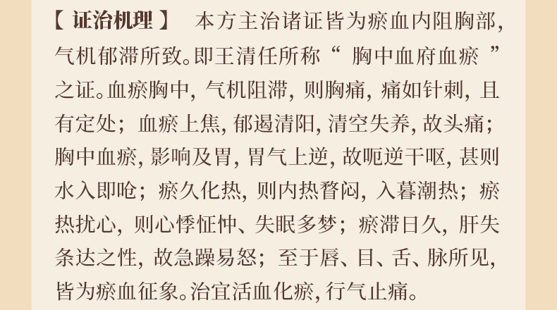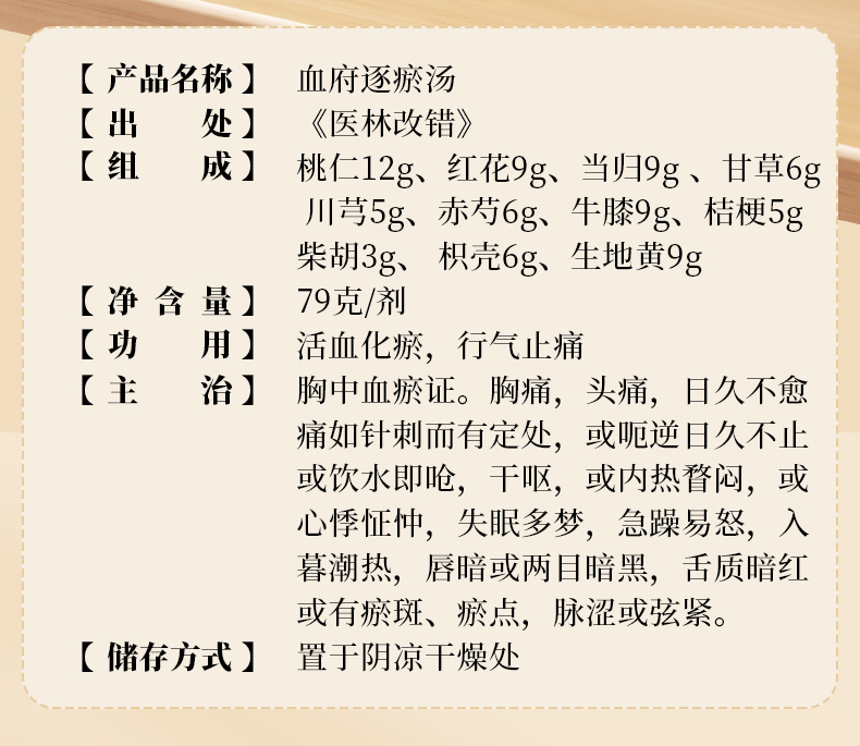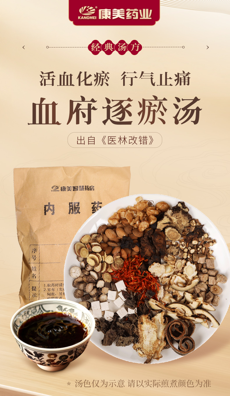 血府逐瘀汤79g/剂 (桃仁/红花/当归/生地黄/川芎/赤芍/牛膝/桔梗/柴胡/枳/甘草)出自《医林改错》