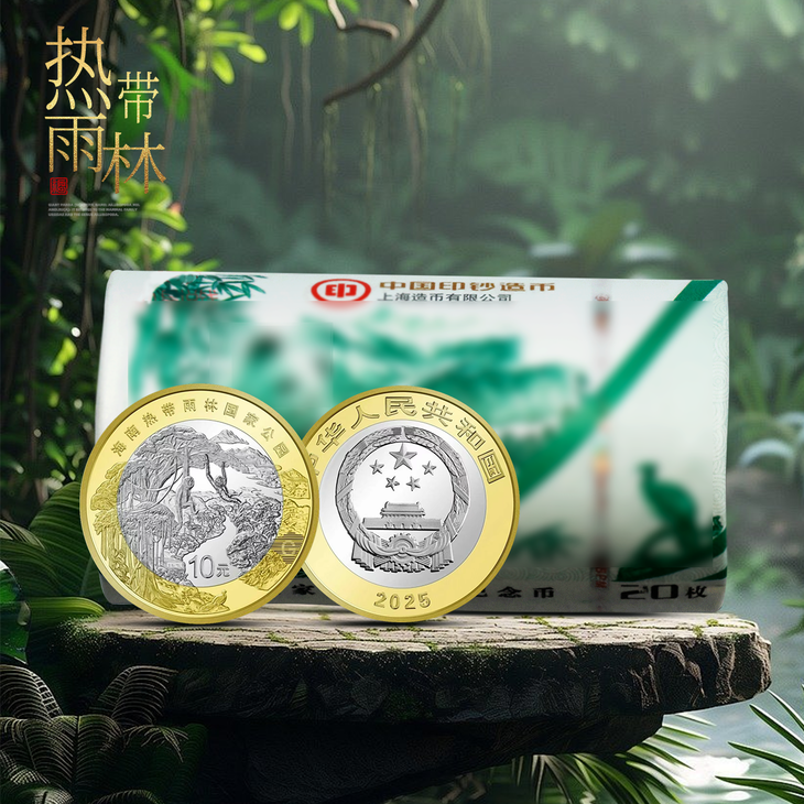 海南热带雨林国家公园,面额为10元,直径27毫米,材质为双色铜合金,发行数量为5000万枚。与现行流通人民币职能相同,与同面额人民币等值流通。