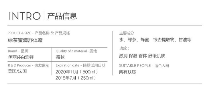 美国 伊丽莎白雅顿 绿茶蜜滴舒体霜500ml 新日期 香港直邮 包装随机