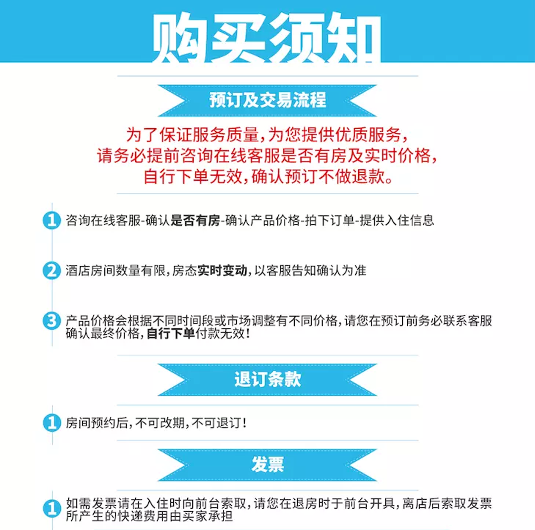 3、【取消规则】预订成功或入住后不更改不取消(不可抗因素除外,例如:生病、台风等,请提供证明申请),如非不可抗拒的客观原因减少或取消或提前退房,将扣取全额房费。