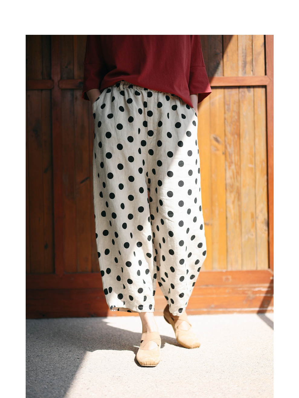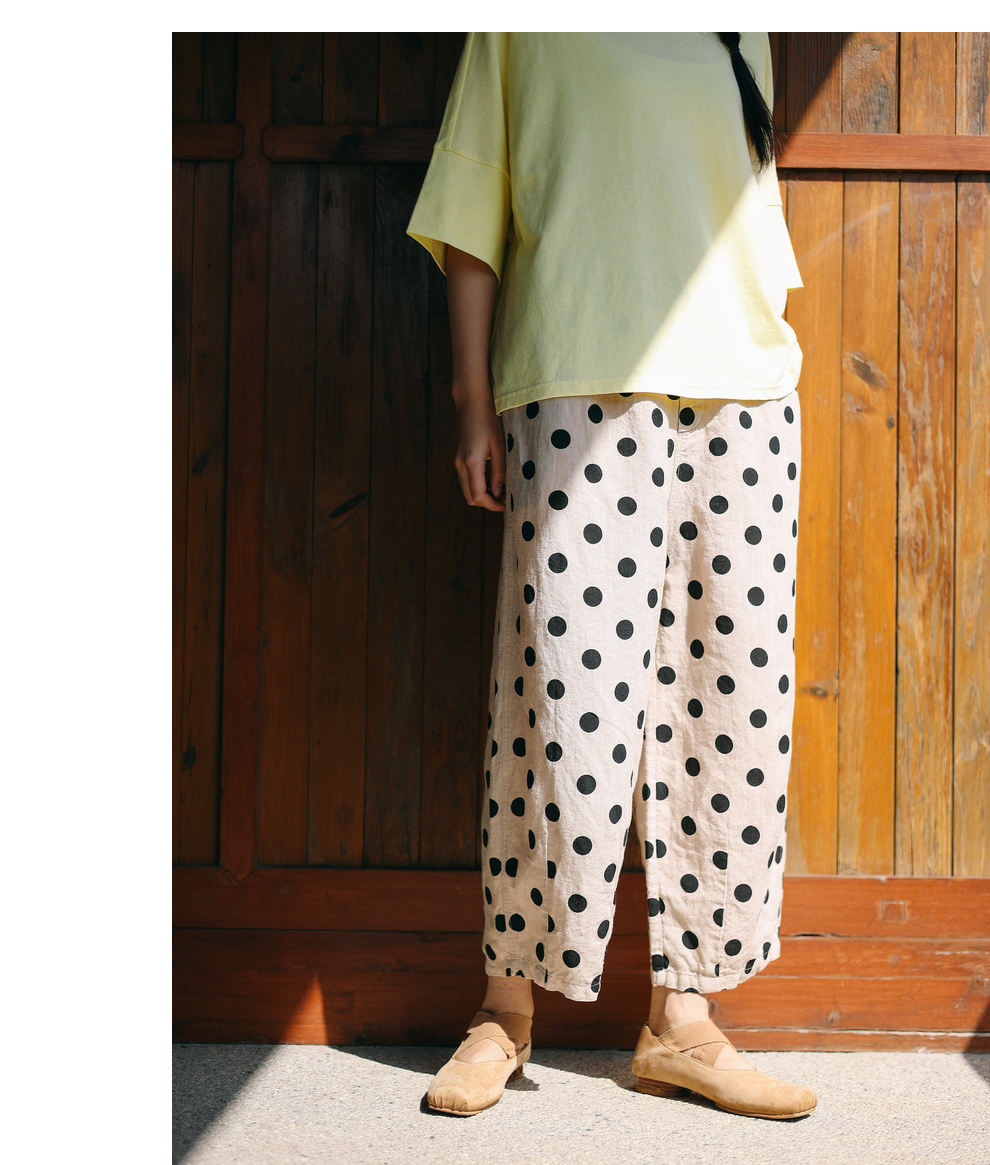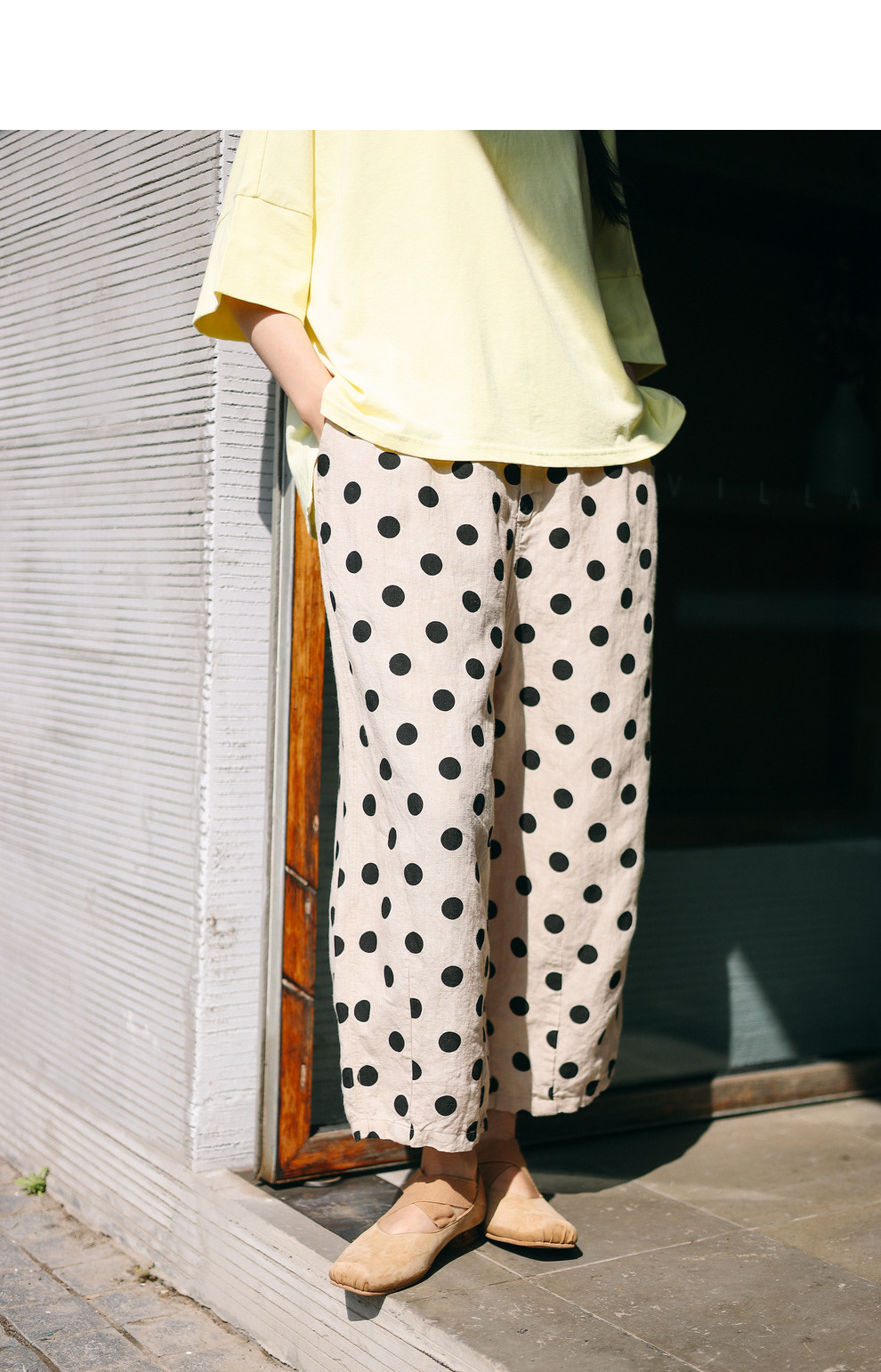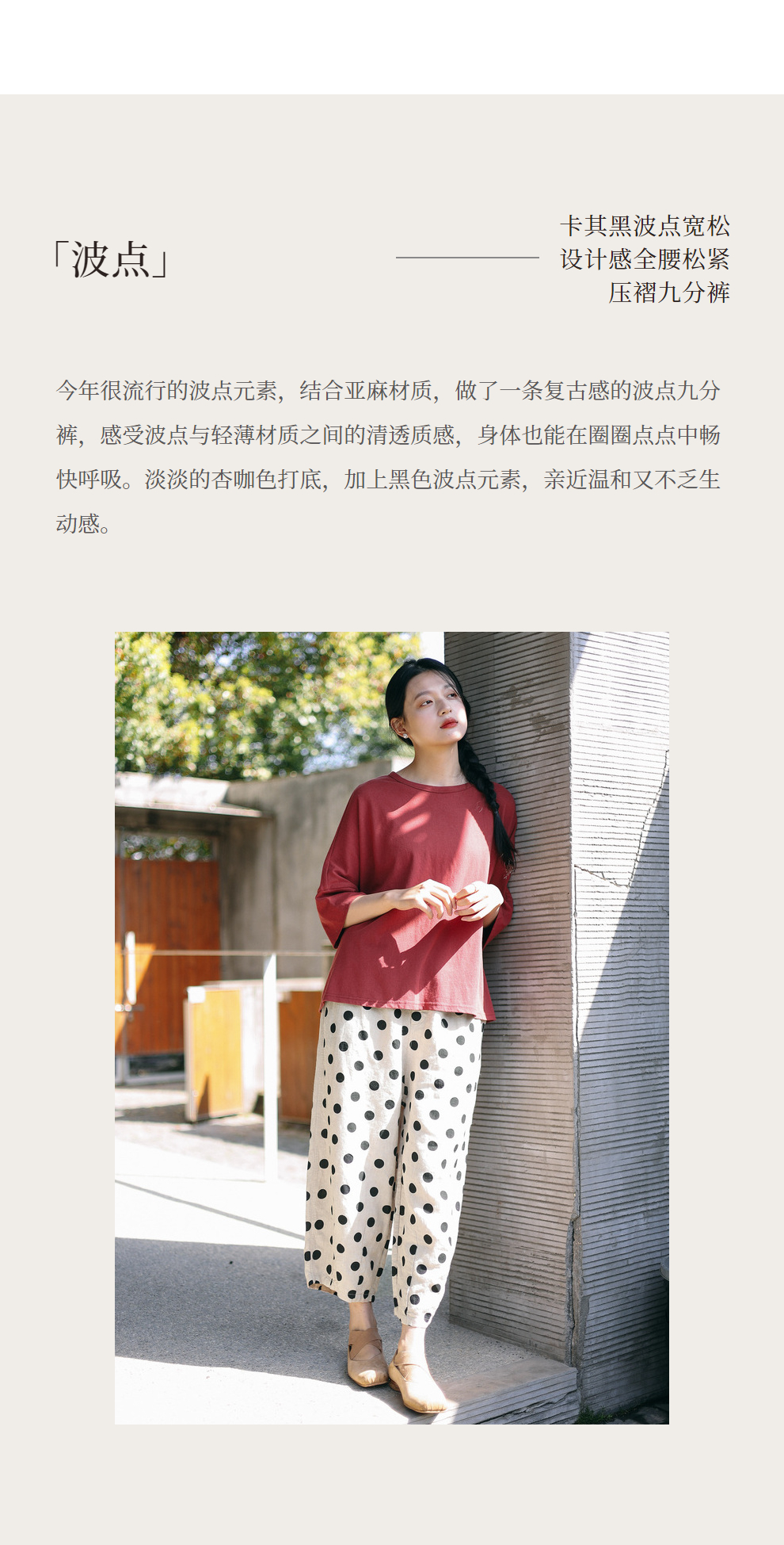 * 绽放283朵/亚麻卡其黑波点休闲宽松直筒设计感全腰松紧压褶九分裤