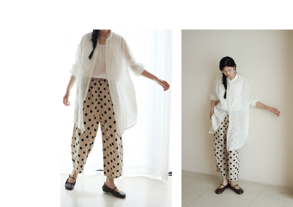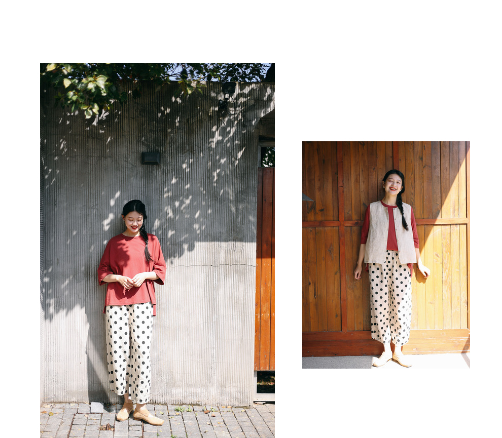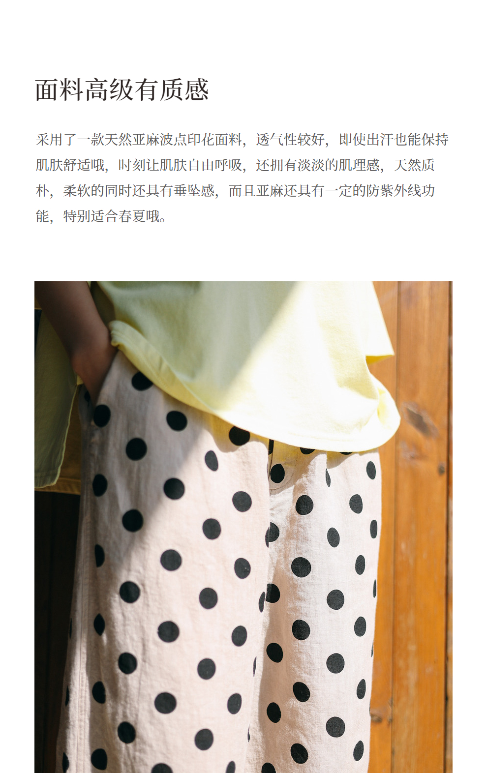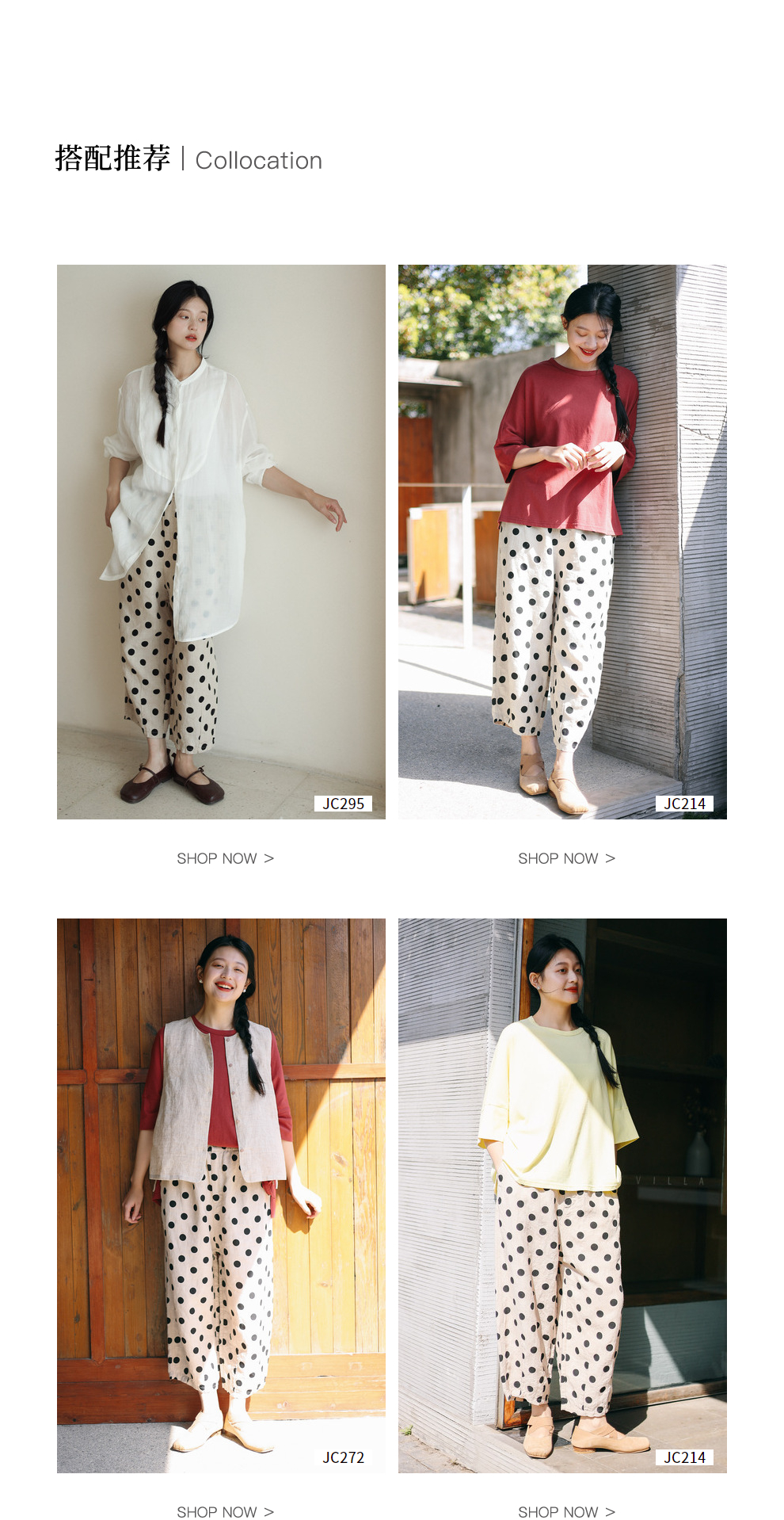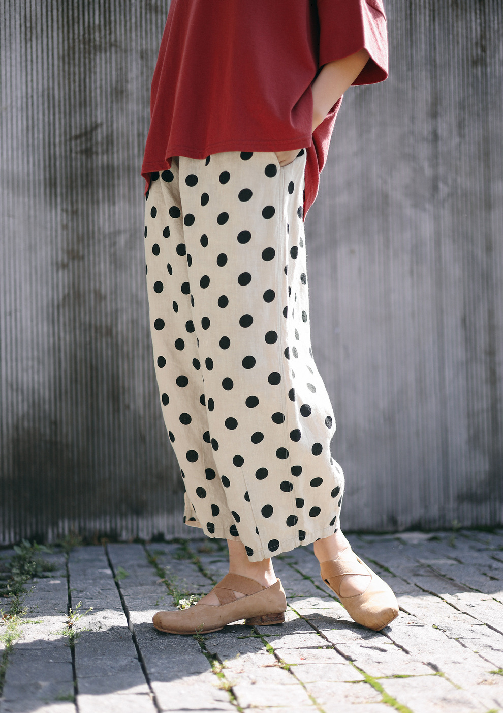 * 绽放283朵/亚麻卡其黑波点休闲宽松直筒设计感全腰松紧压褶九分裤