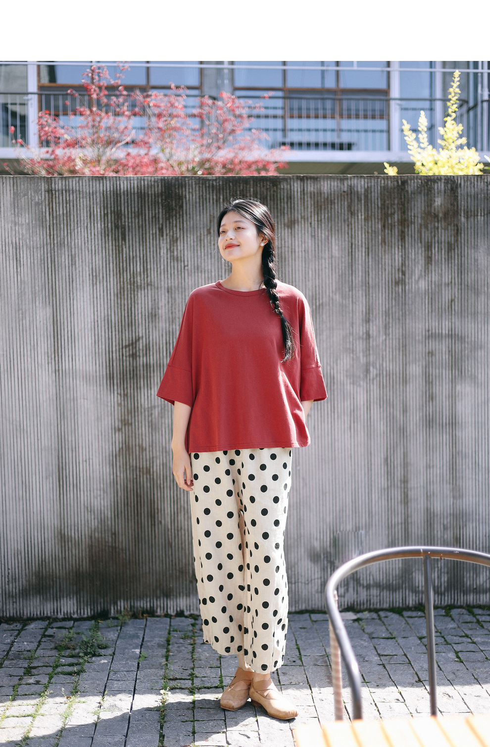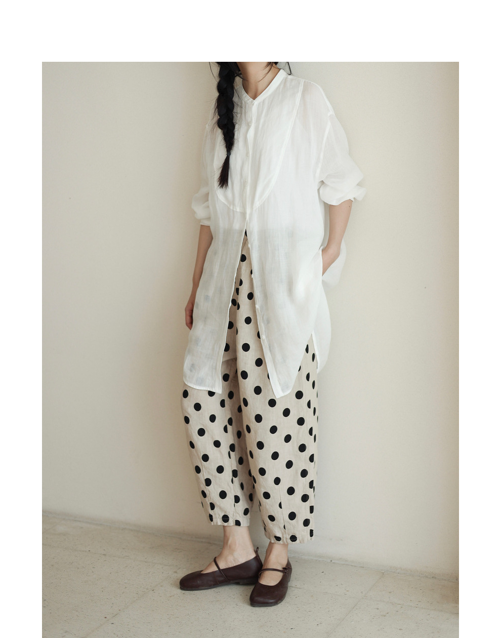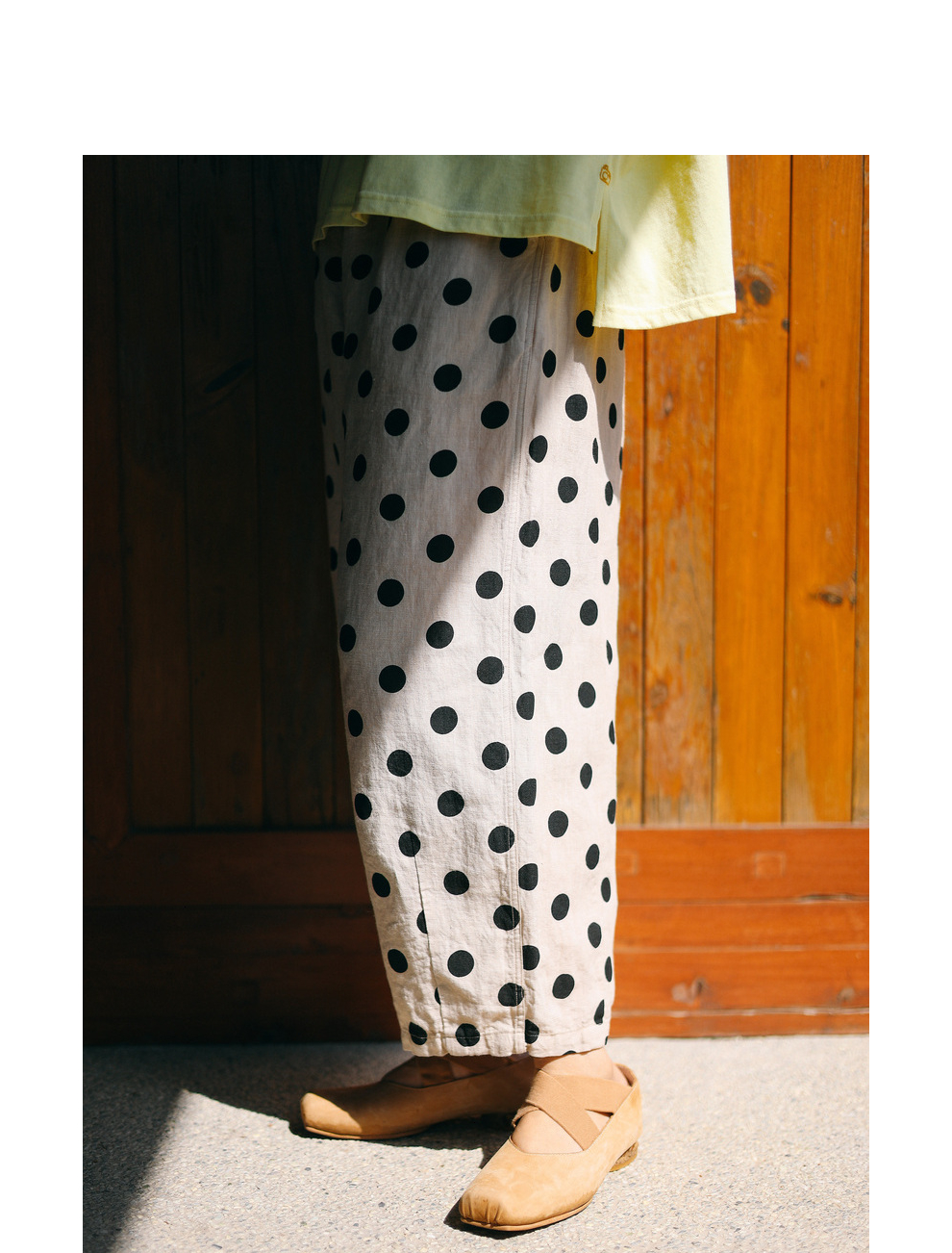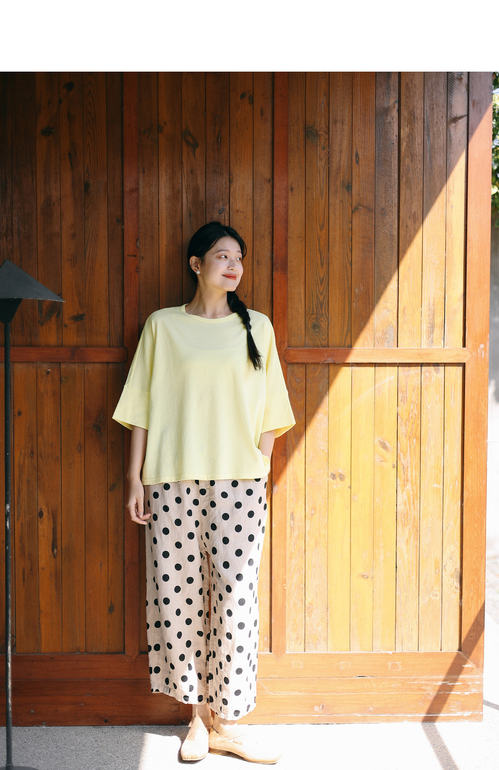 * 绽放283朵/亚麻卡其黑波点休闲宽松直筒设计感全腰松紧压褶九分裤