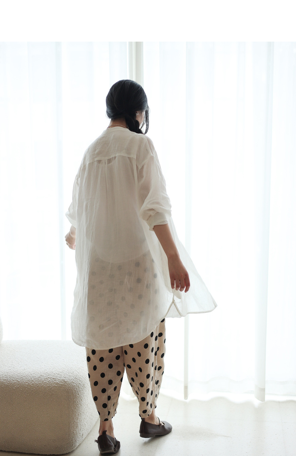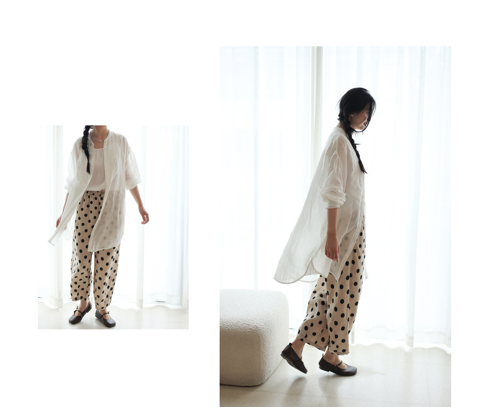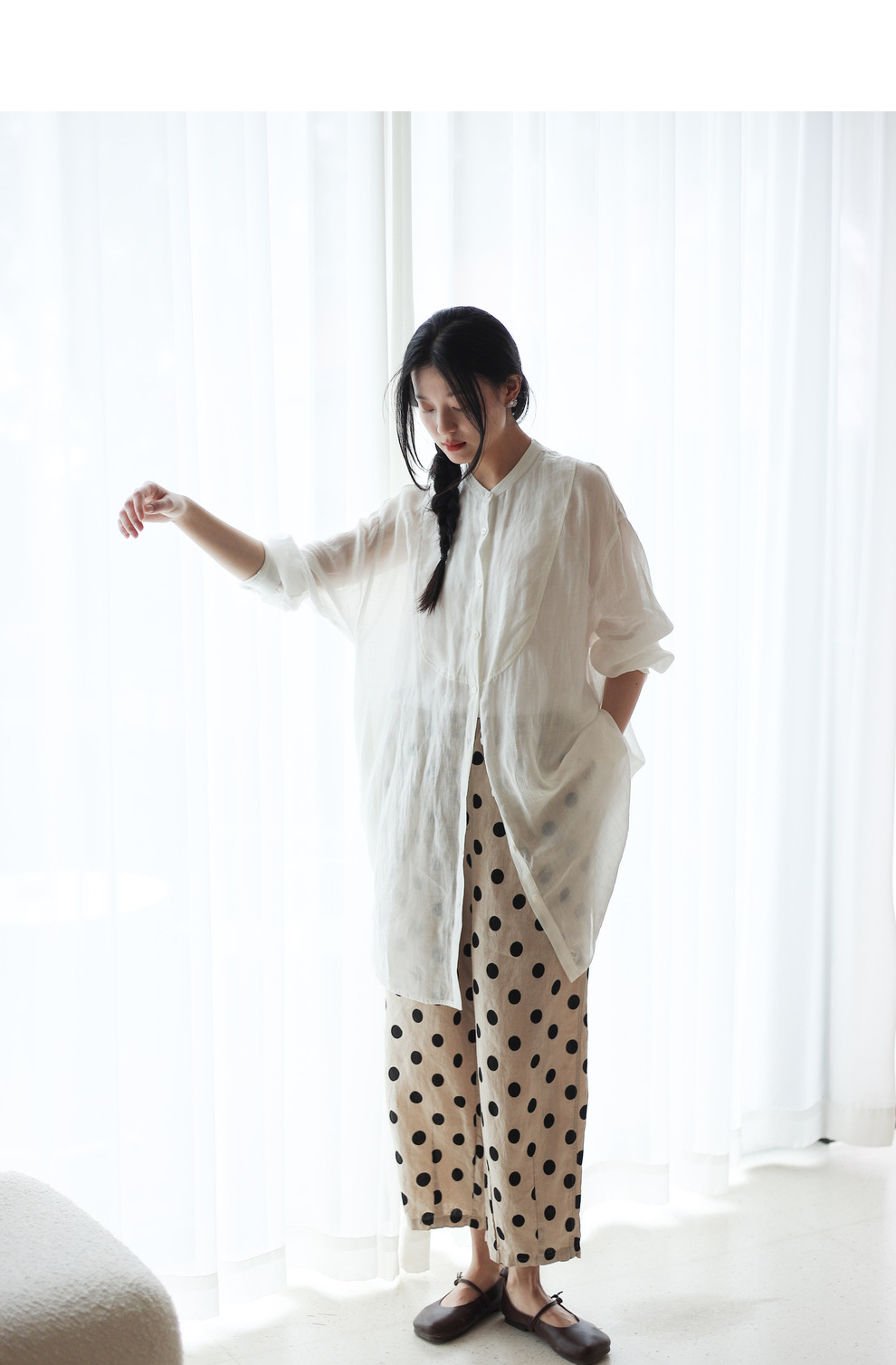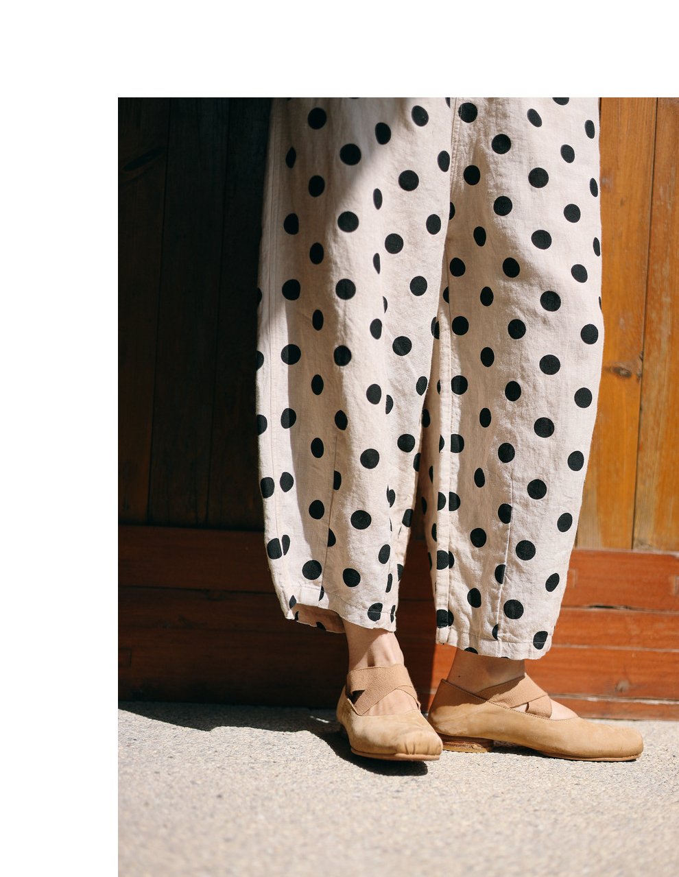 * 绽放283朵/亚麻卡其黑波点休闲宽松直筒设计感全腰松紧压褶九分裤