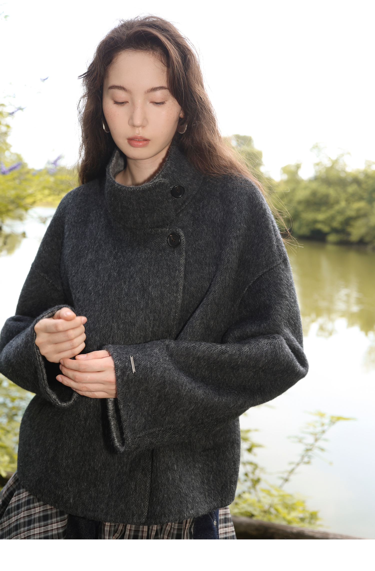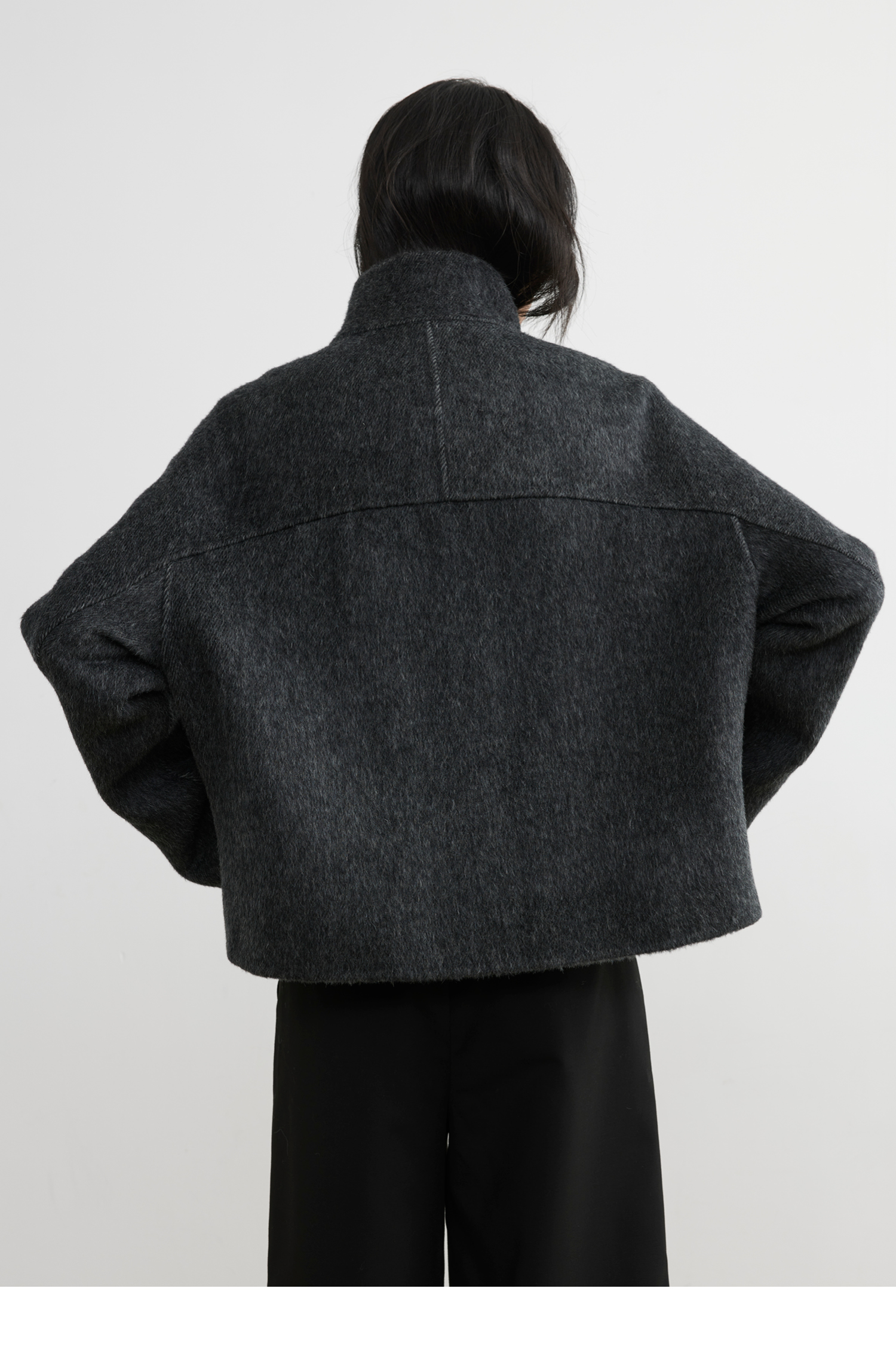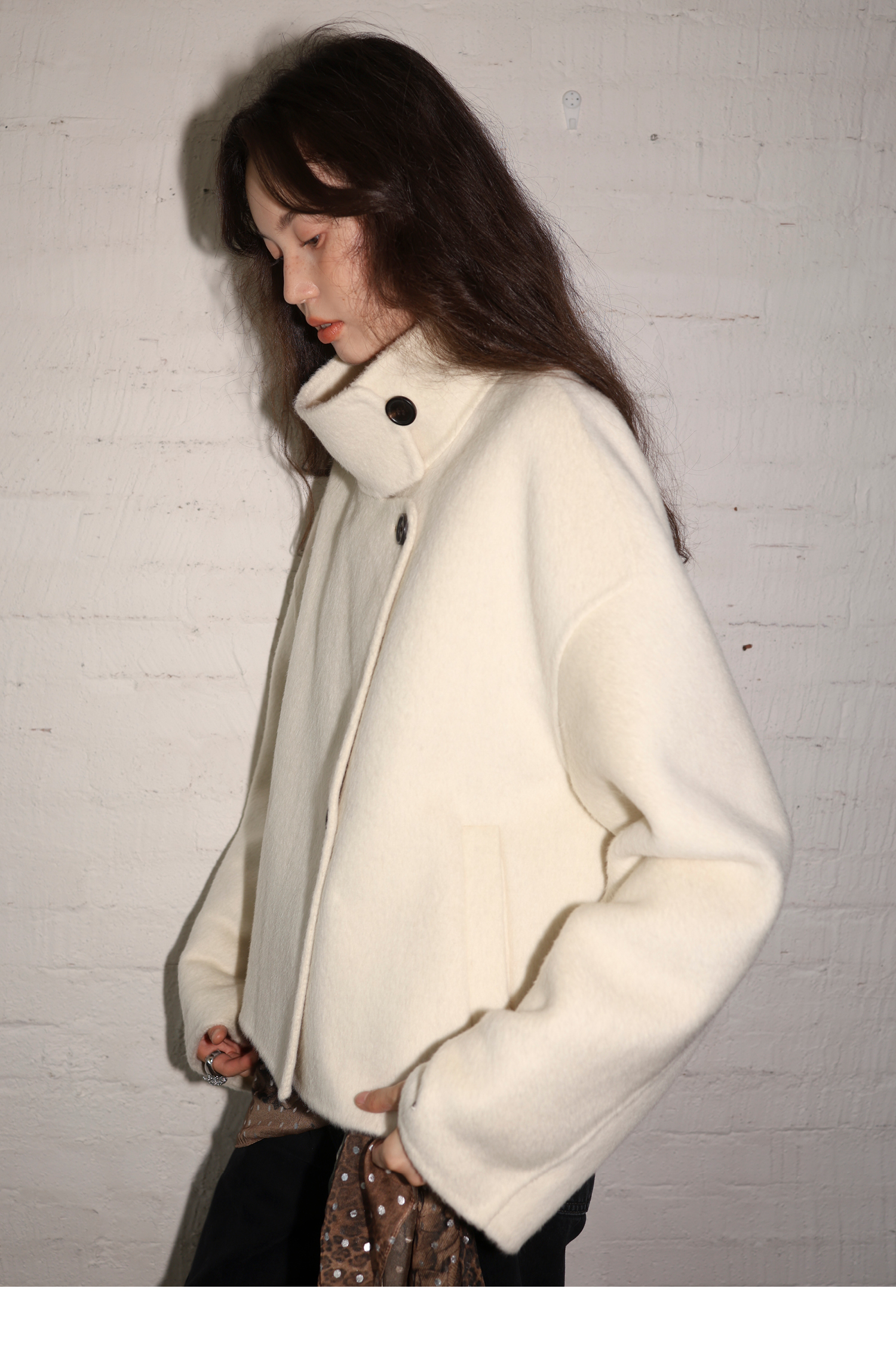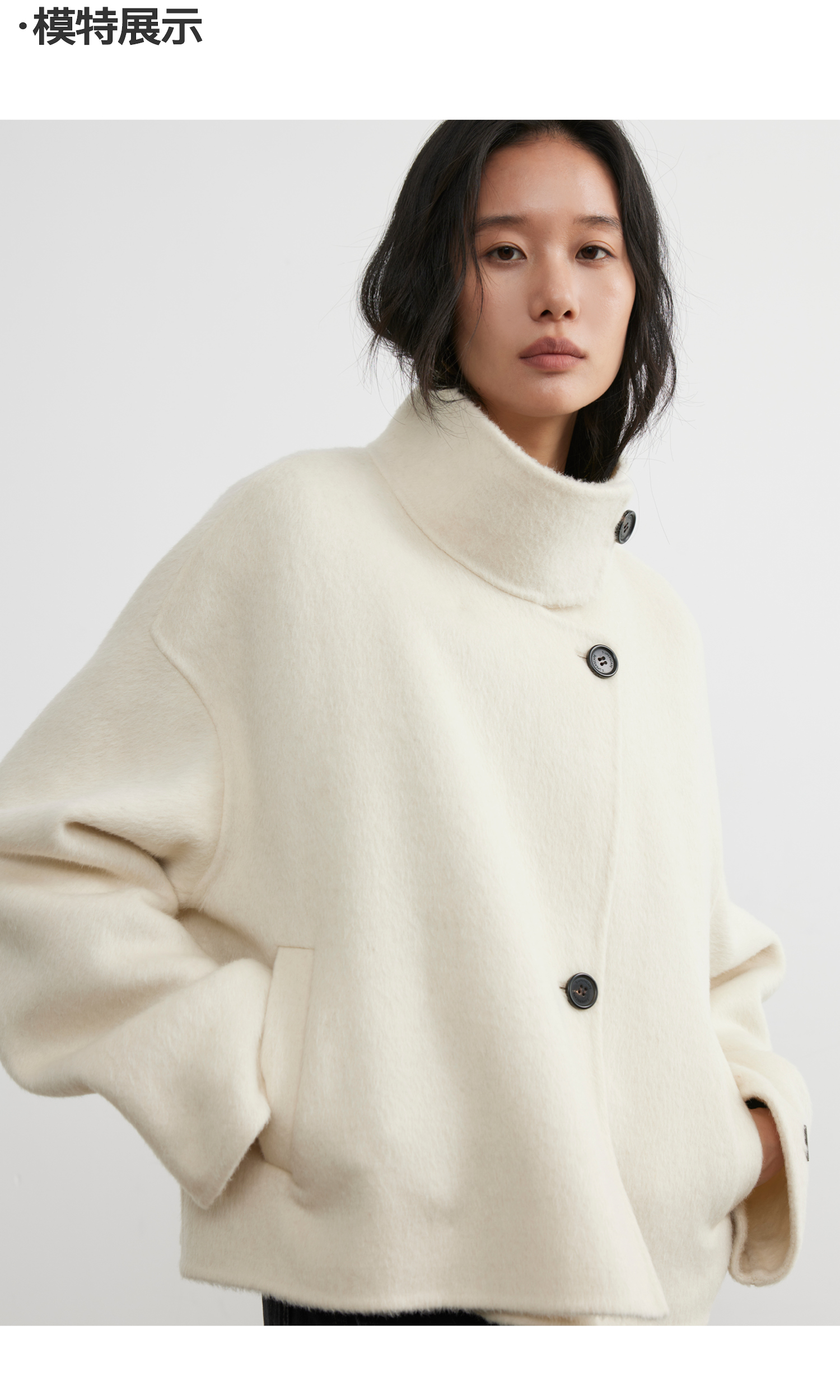 素舶 真丝兔绒羊毛混纺柔顺丝滑短款立领气质双面毛呢大衣短外套