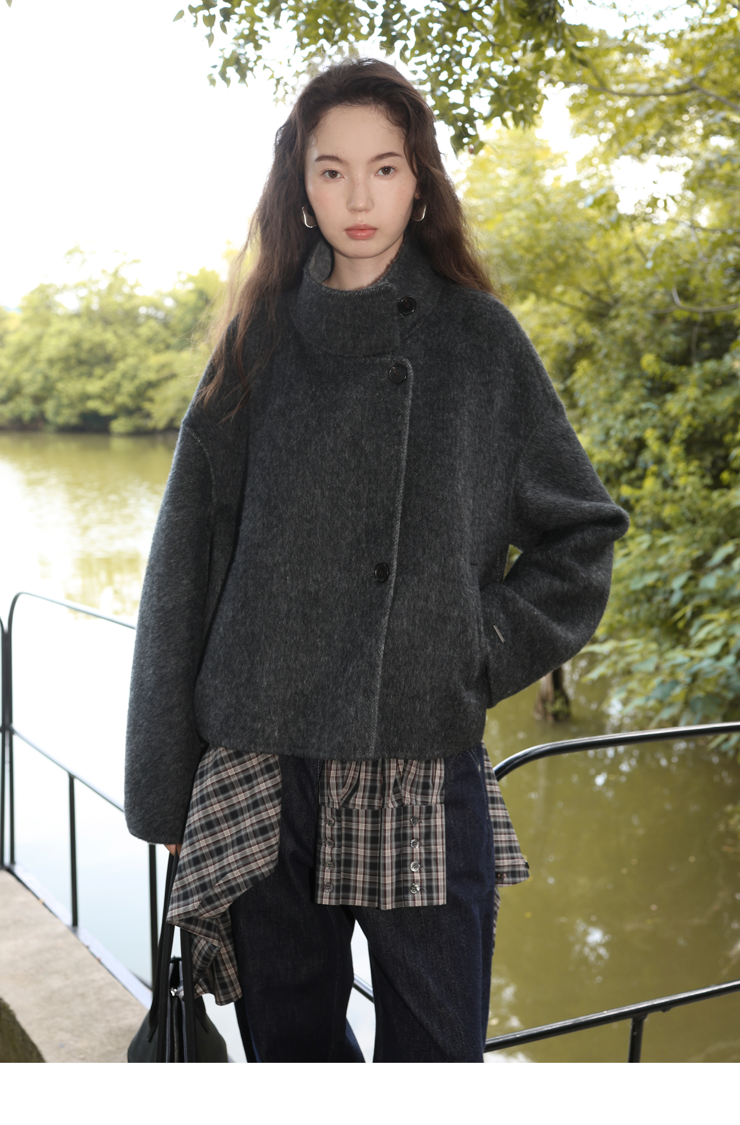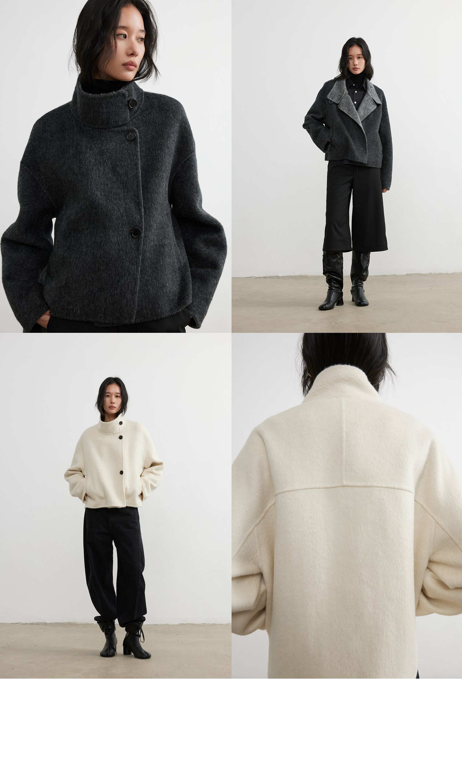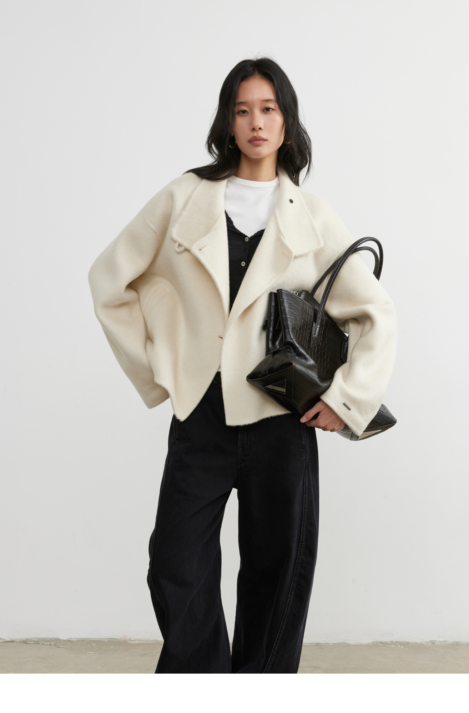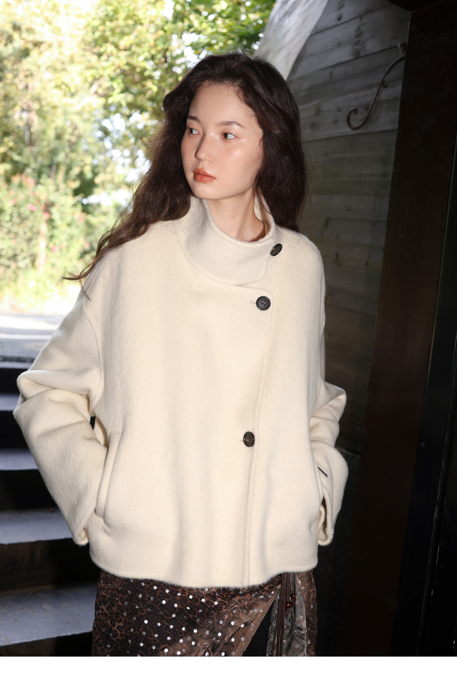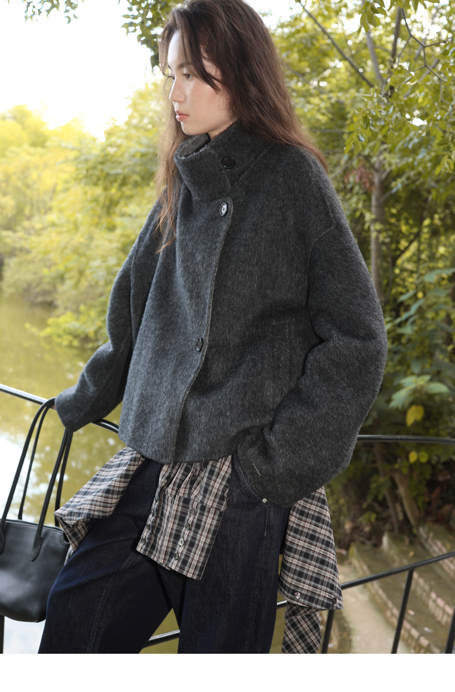 素舶 真丝兔绒羊毛混纺柔顺丝滑短款立领气质双面毛呢大衣短外套