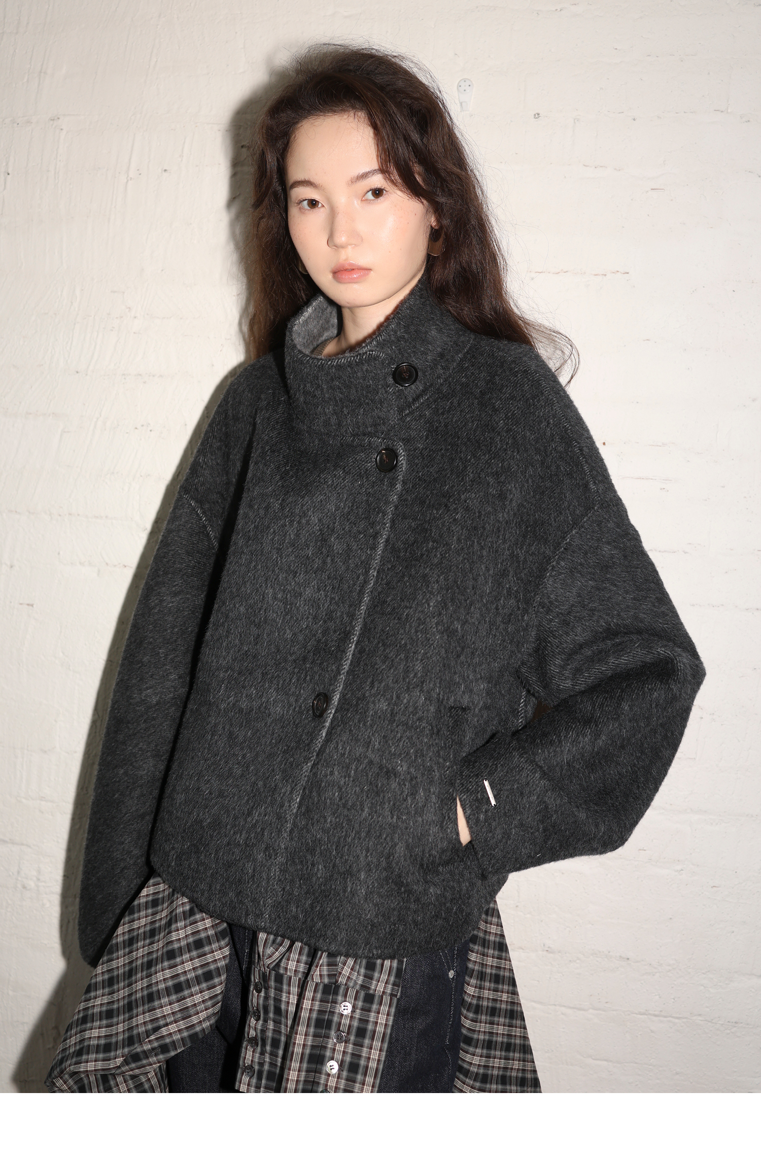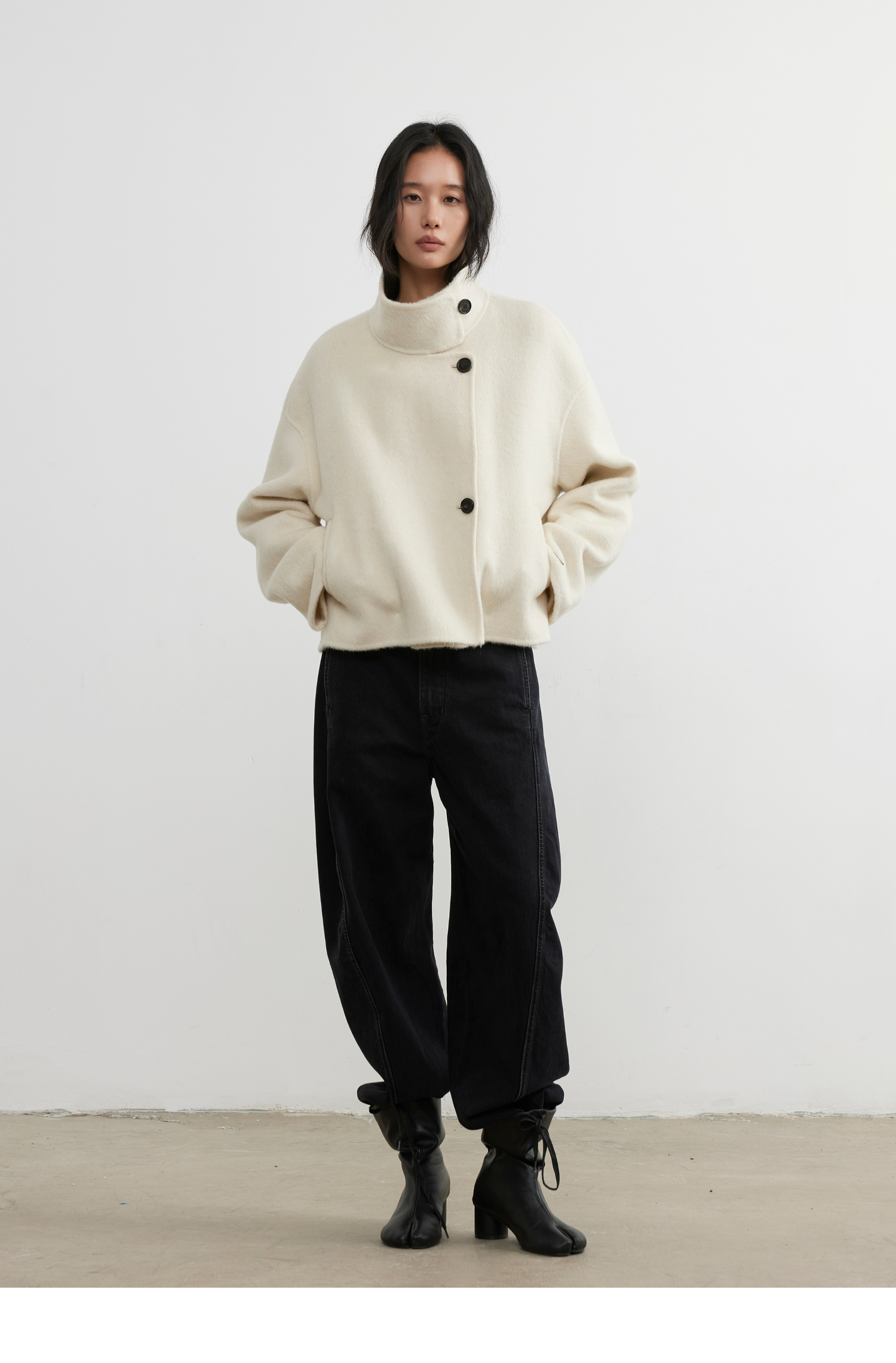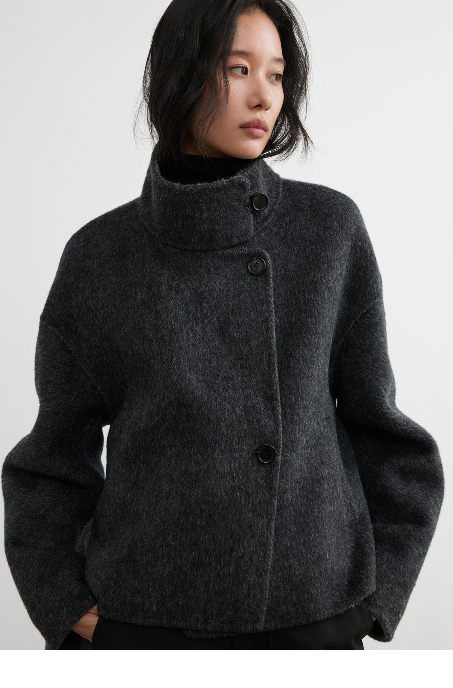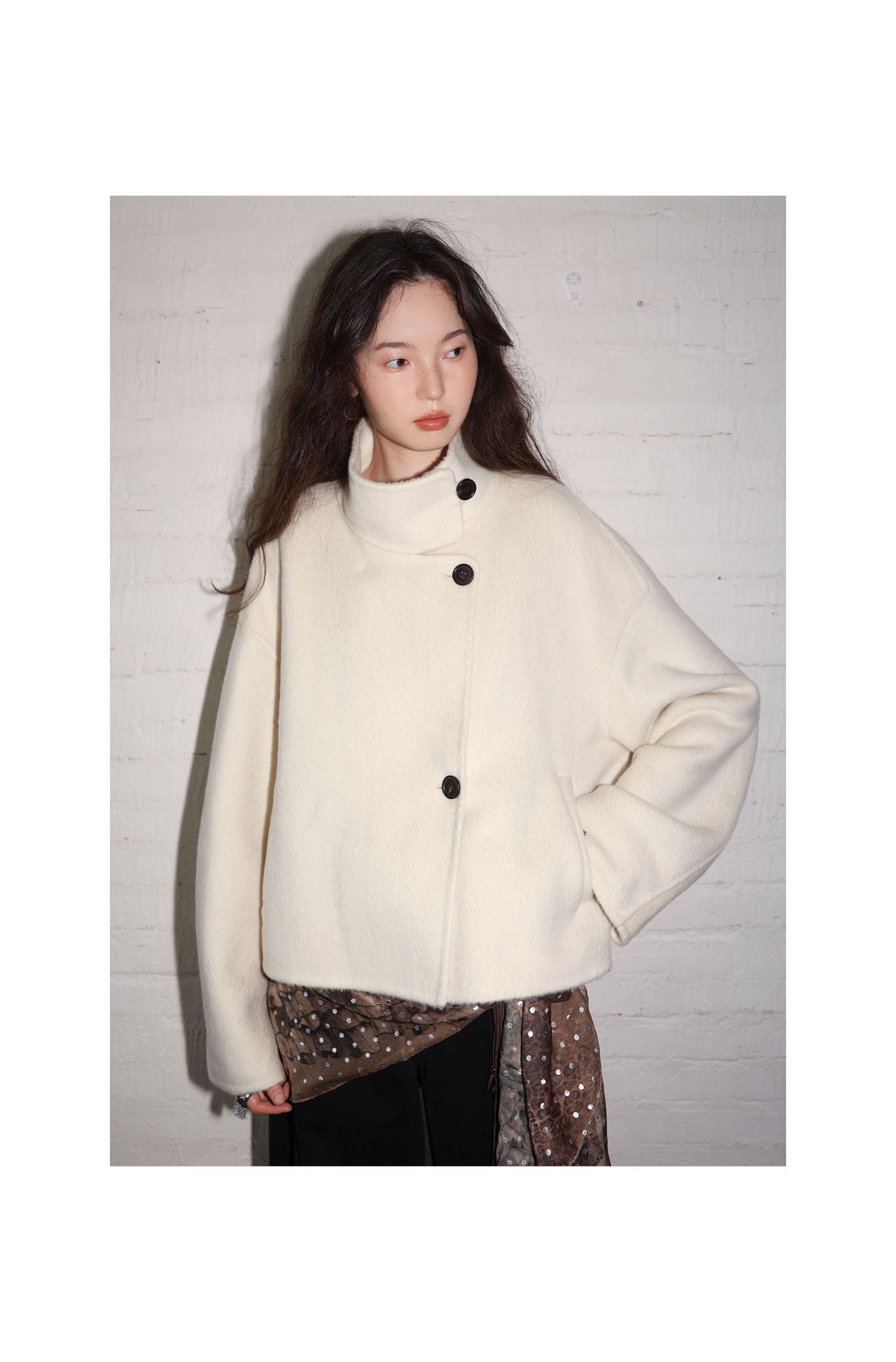 素舶 真丝兔绒羊毛混纺柔顺丝滑短款立领气质双面毛呢大衣短外套
