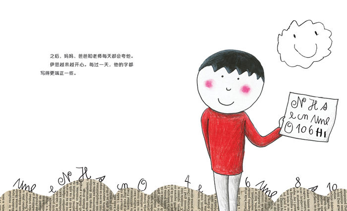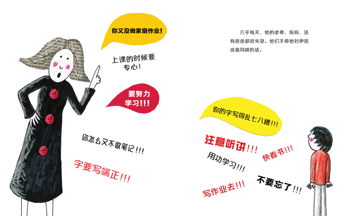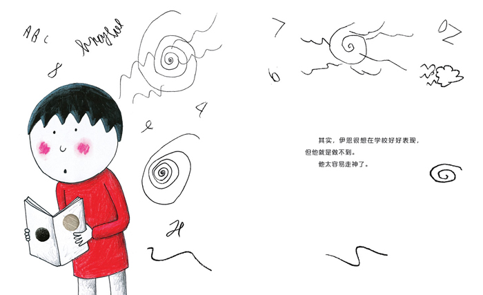 《爱幻想的伊恩》是广西师大出版社魔法象图画书王国推出的作品之一。伊恩是个爱幻想的男孩,他的思绪总是飘来飘去,而且常常沉浸在自己画的世界里。上课的时候,他很容易走神,也无法按照老师教的那样写字、画画,父母和老师对他很失望,其他孩子甚至会嘲笑他。伊恩很伤心。其实,和其他孩子一样,他也想当一个好孩子。伊恩很努力,渐渐地,他的字写得越来越好,父母和老师也常常夸奖他。伊恩相信自己会越来越好,同时他还一直坚持画画,而且会一直画下去。每个孩子的身上都存在一个本能的缪斯,包容的环境和智慧的成人,会让孩子在成长的过程中葆有尊严和自由,也让他们有相信自己的能力,可以勇敢面对挫折,不畏惧。