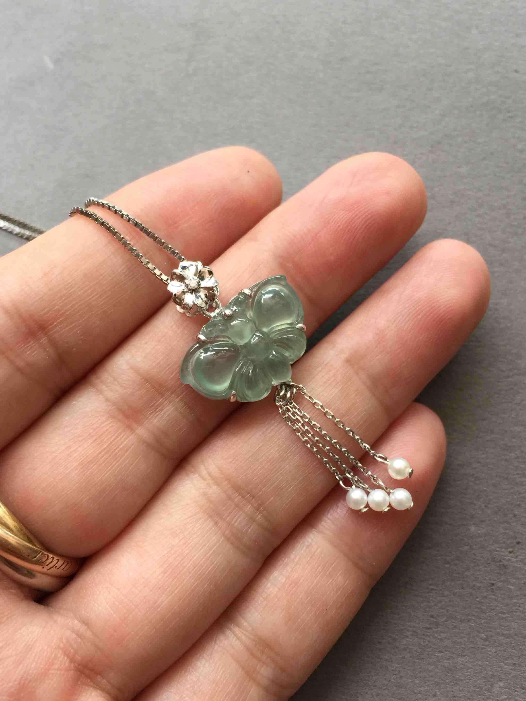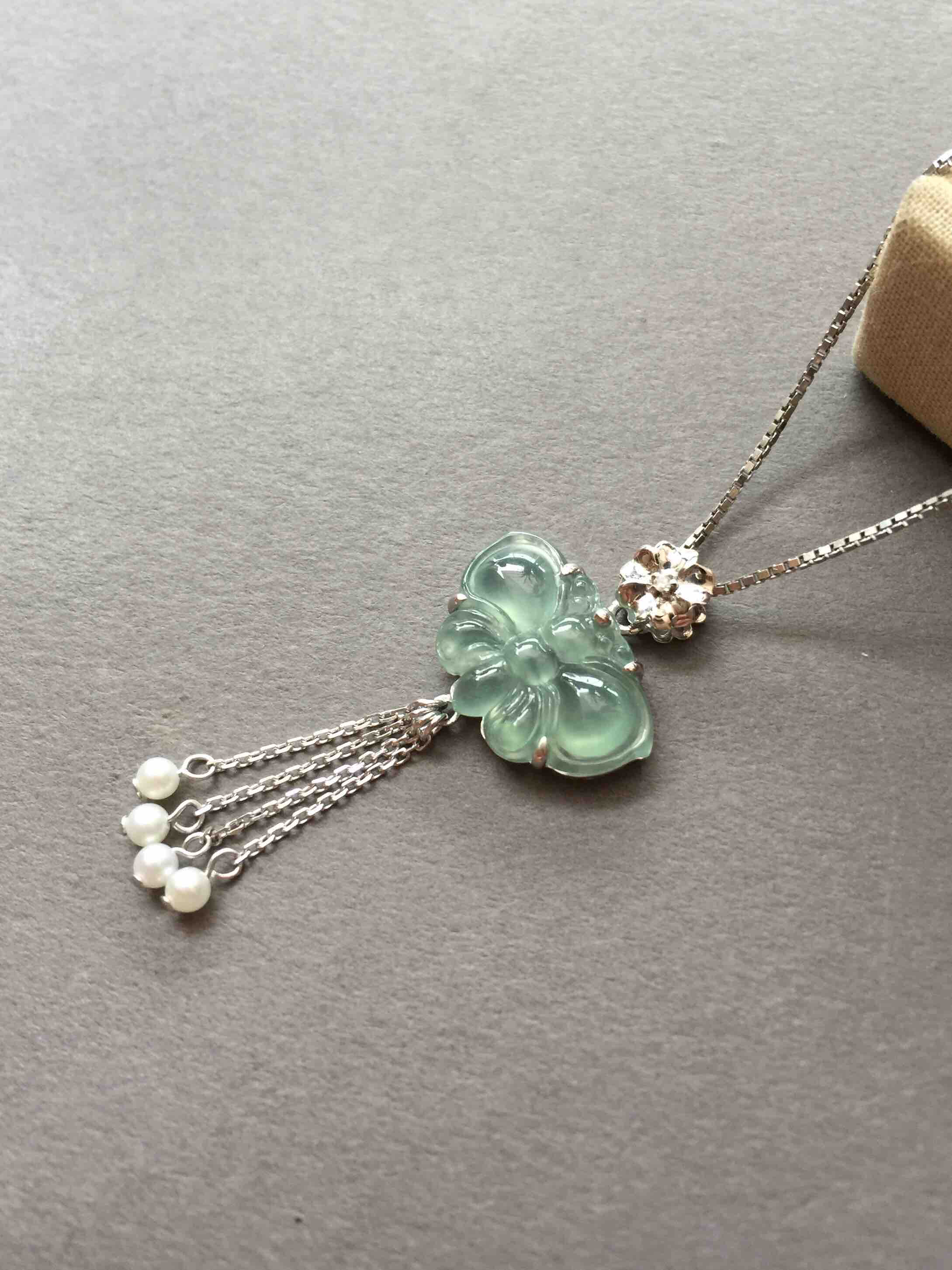 你若盛开蝴蝶自来,高冰种蓝水蝴蝶吊坠,18.1×12.1×3.2mm,镶嵌后42.9×18.1×4.8mm,种水晶莹剔透,荧光四射,天蓝色青春靓丽,18k白金钻石镶嵌,珍珠坠儿摇曳多姿,时尚年轻的氛围感,小四价位还不快秒