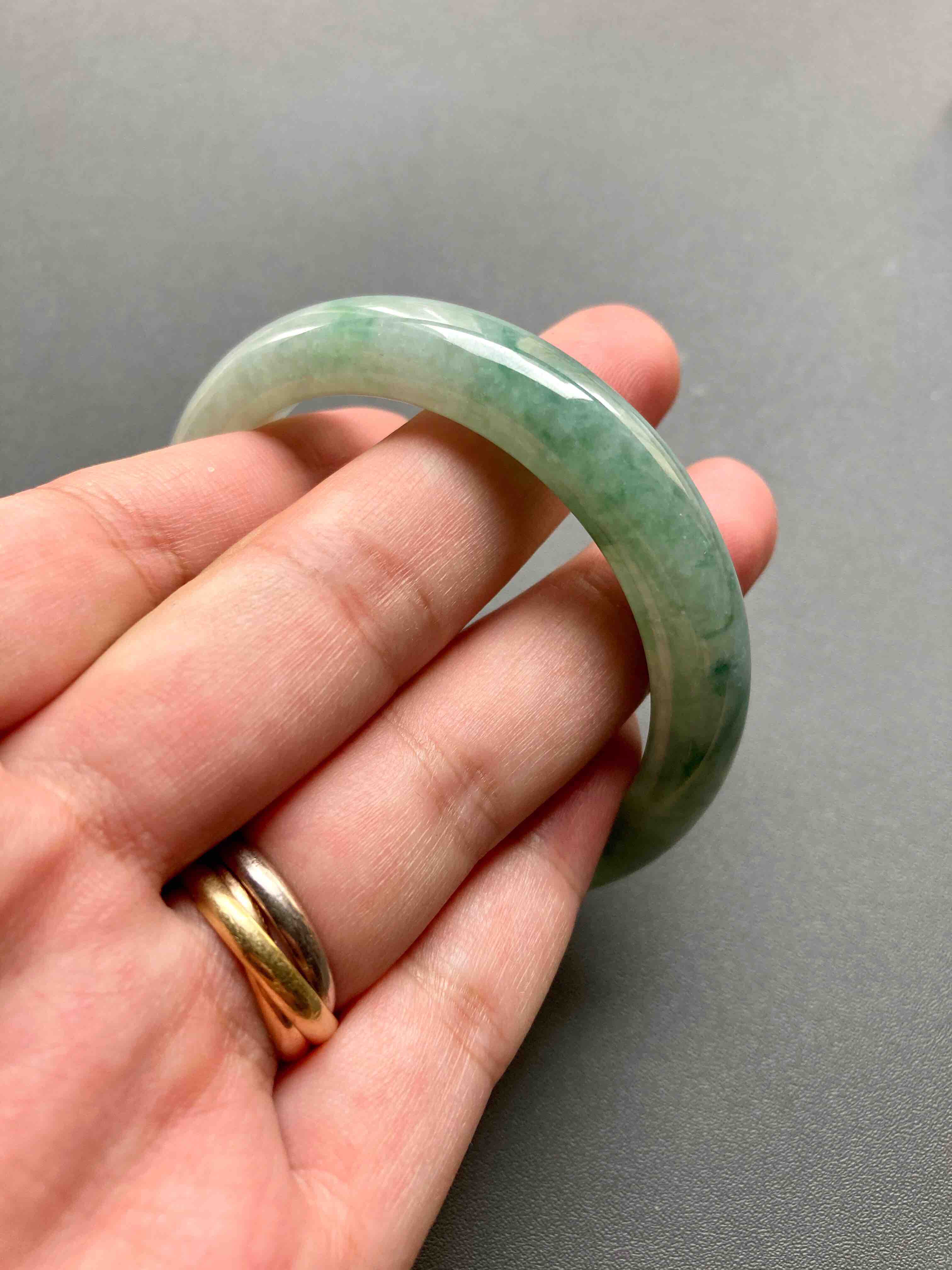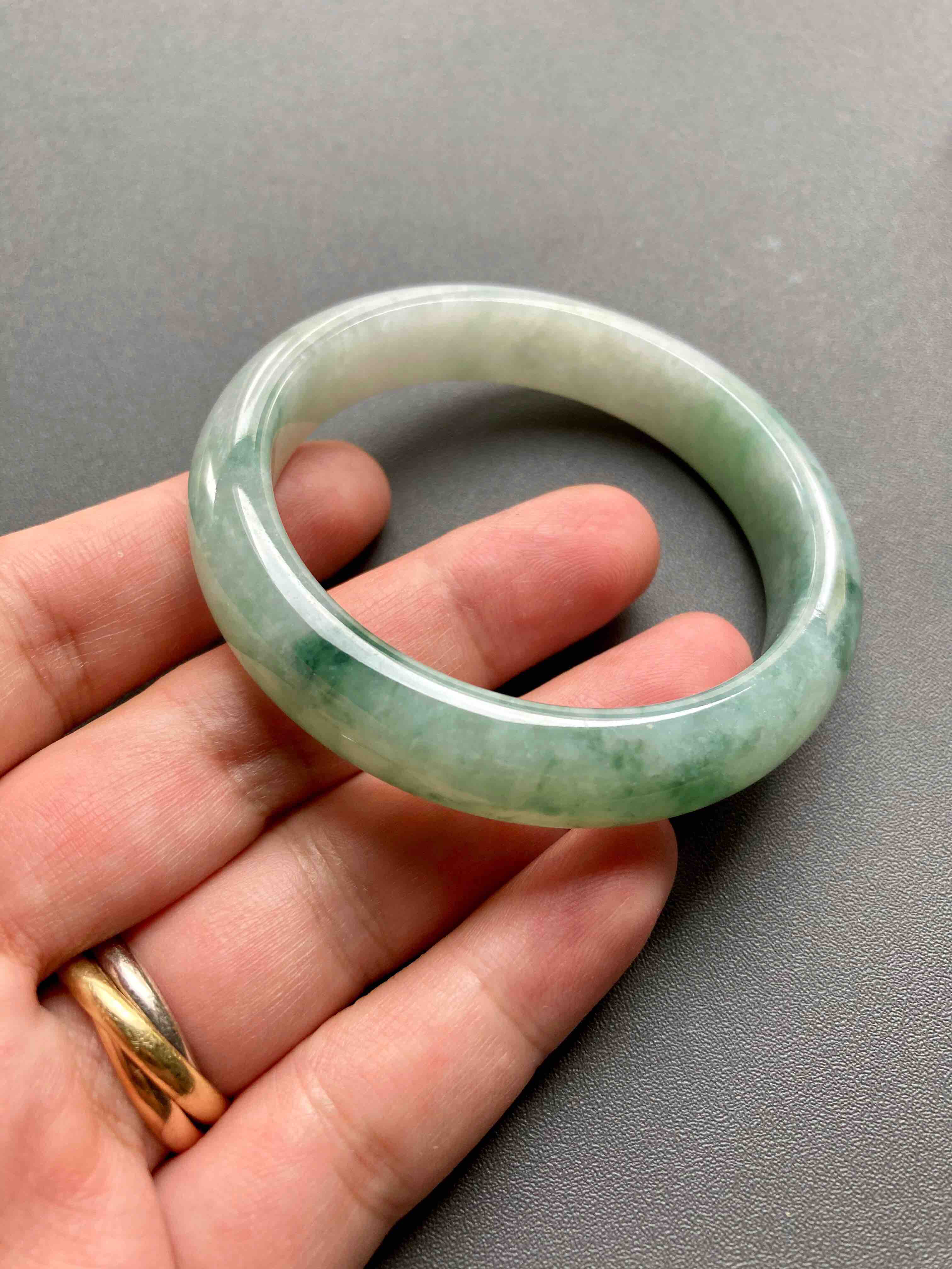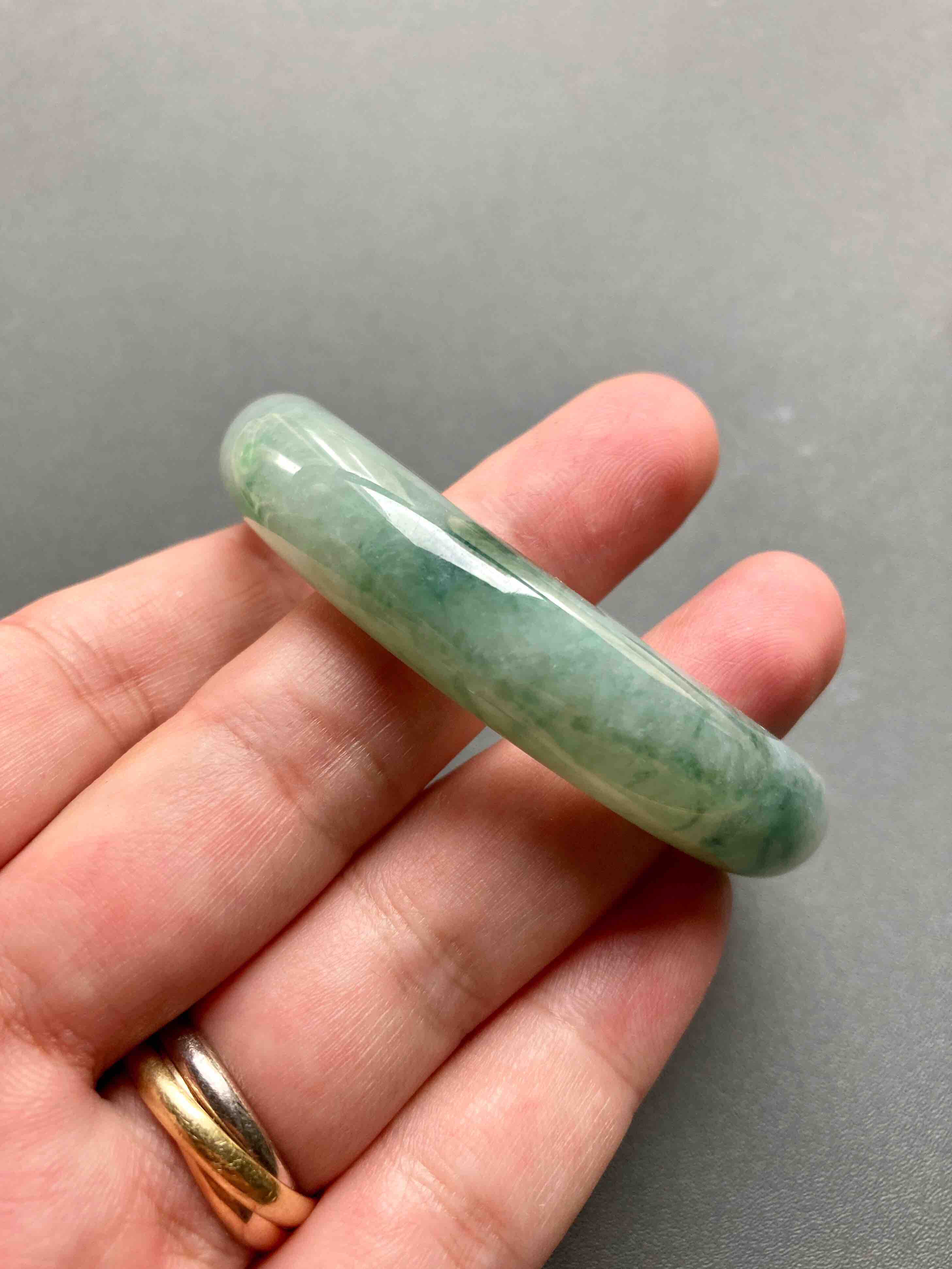 糯种飘花翡翠手镯52.6,种水细腻,飘花写意,难得的小圈口镯子,性价比超高,内径52.6宽11.9厚8.2mm,适合手寸51到53佩戴