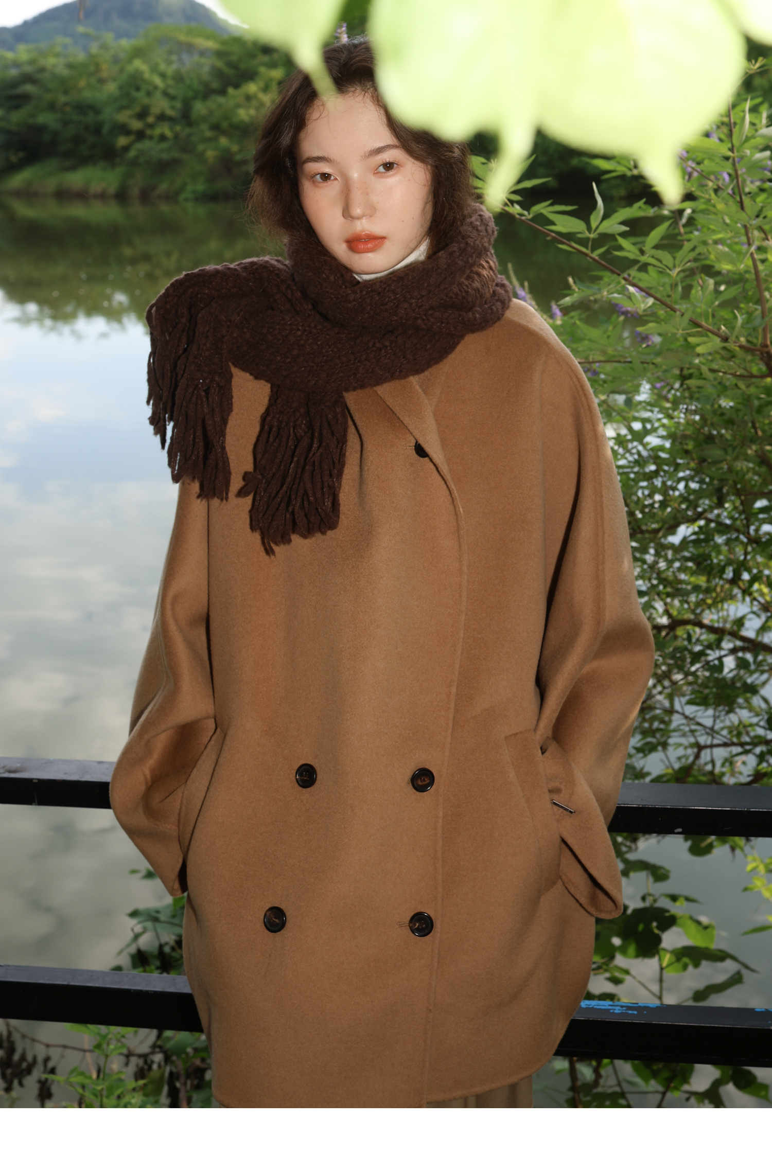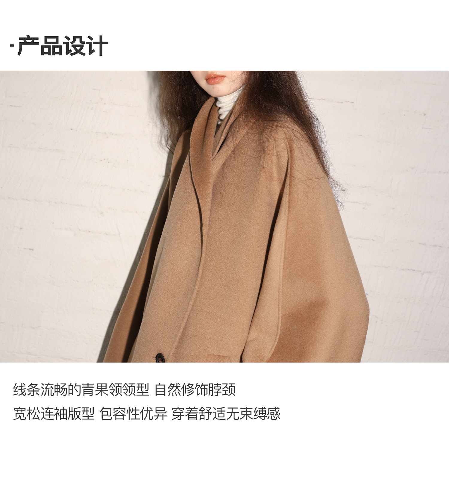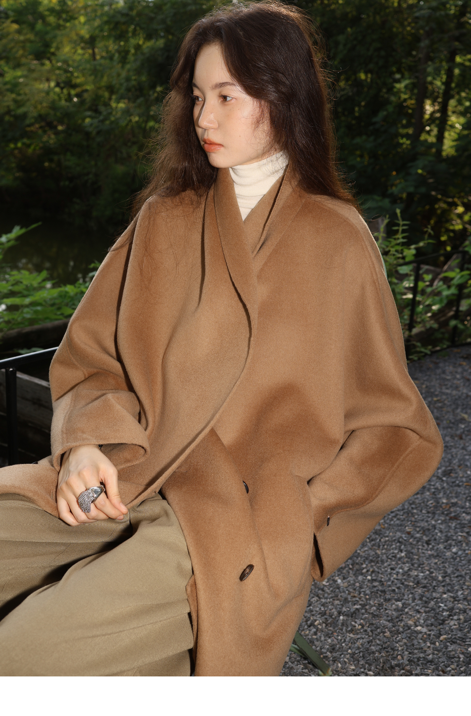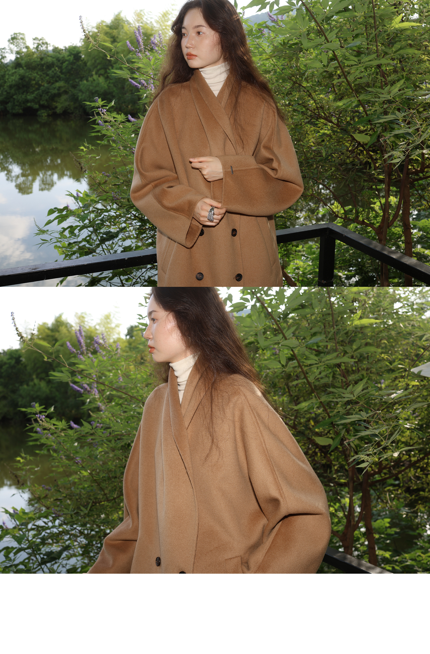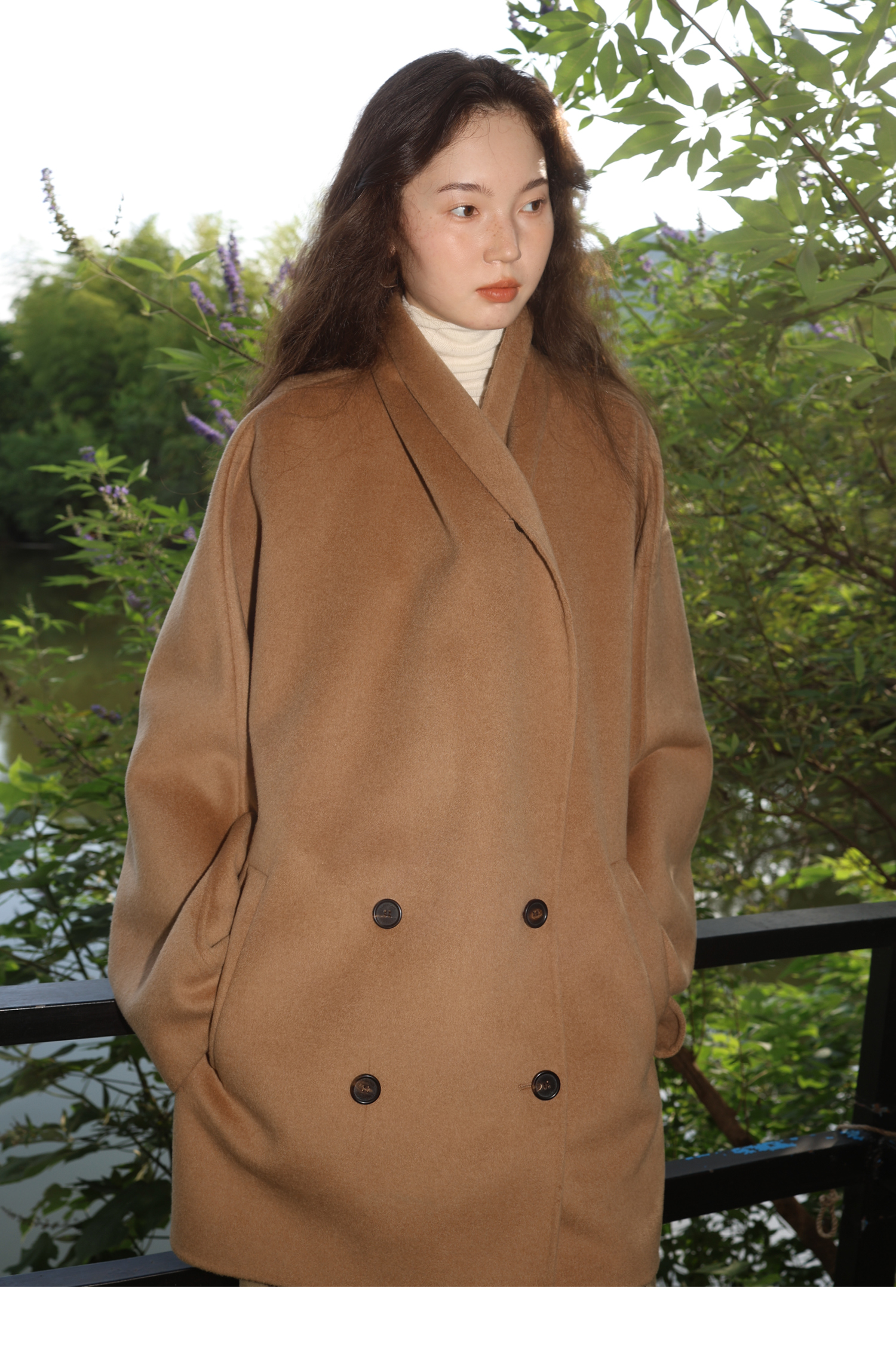 素舶 绵羊毛青果领双排扣松弛廓感宽松双面毛呢中长短款大衣外套