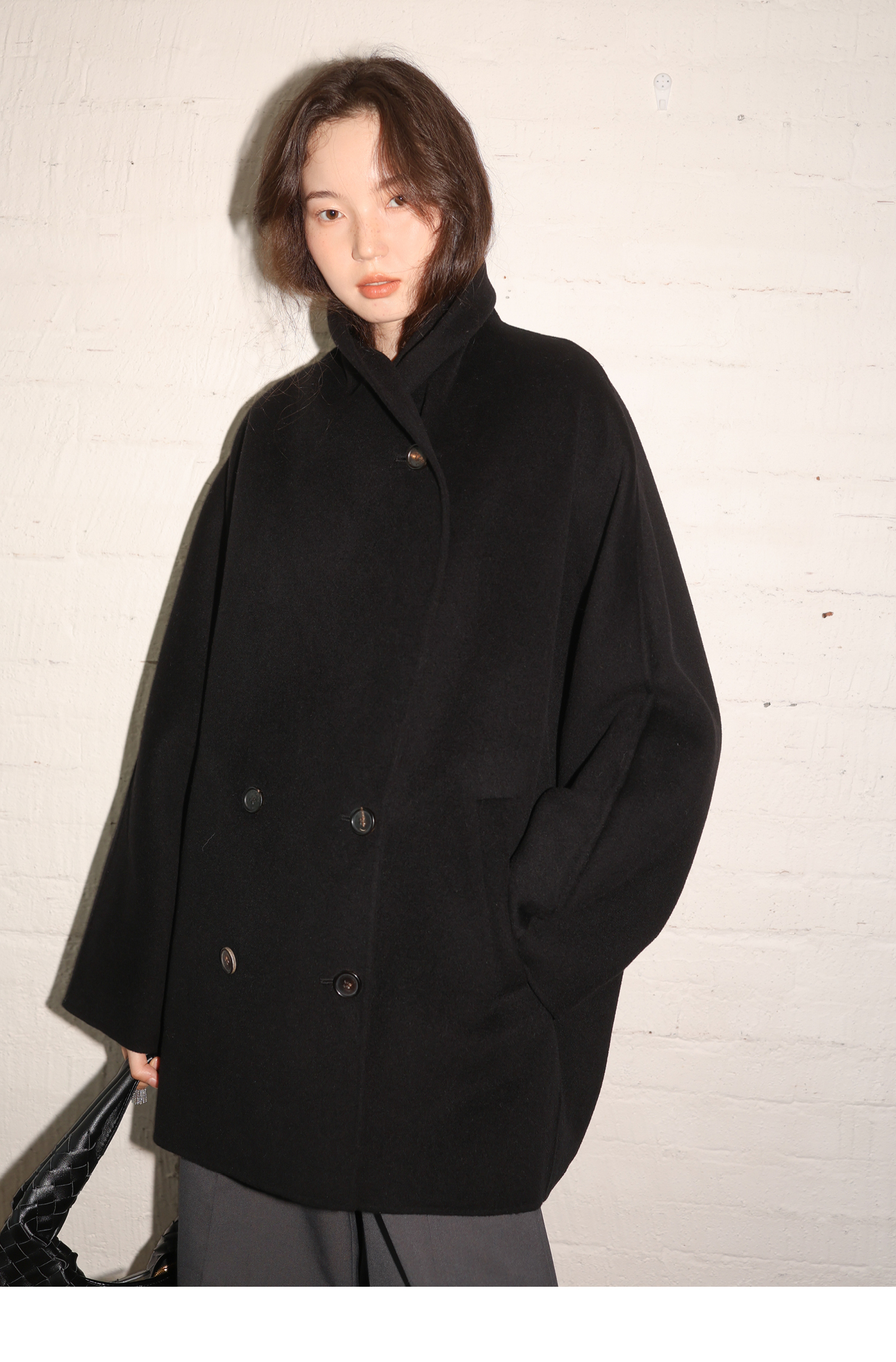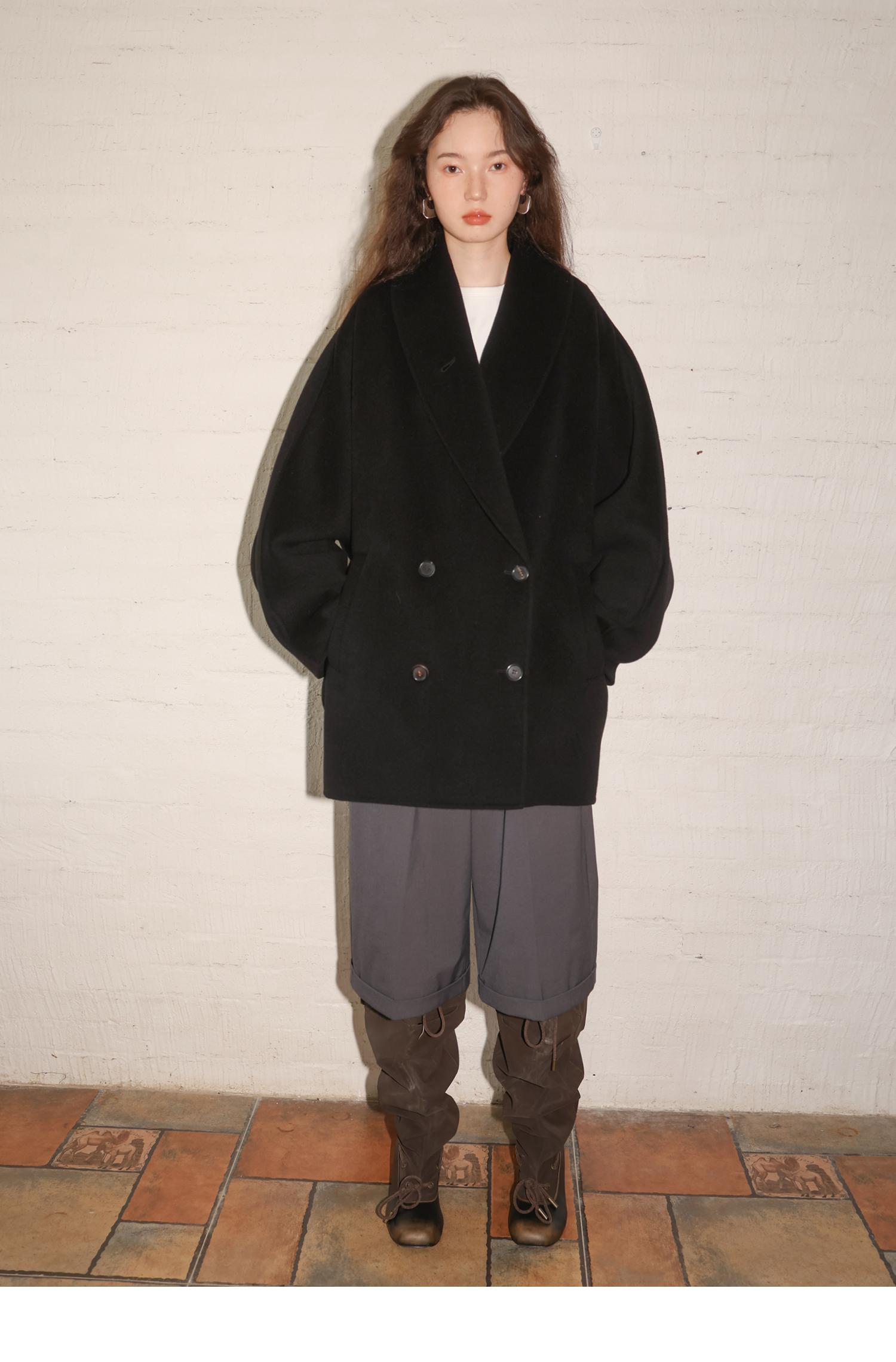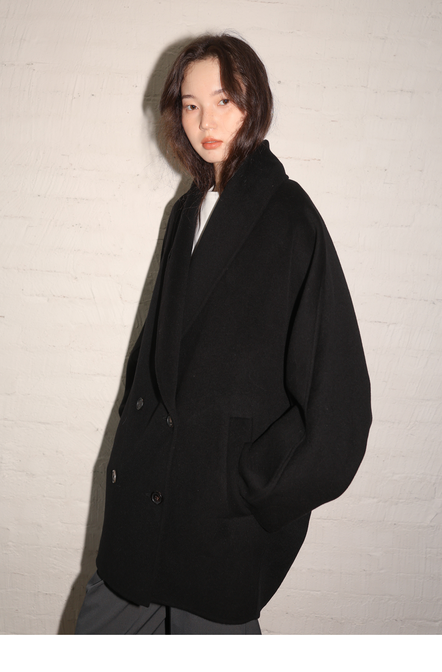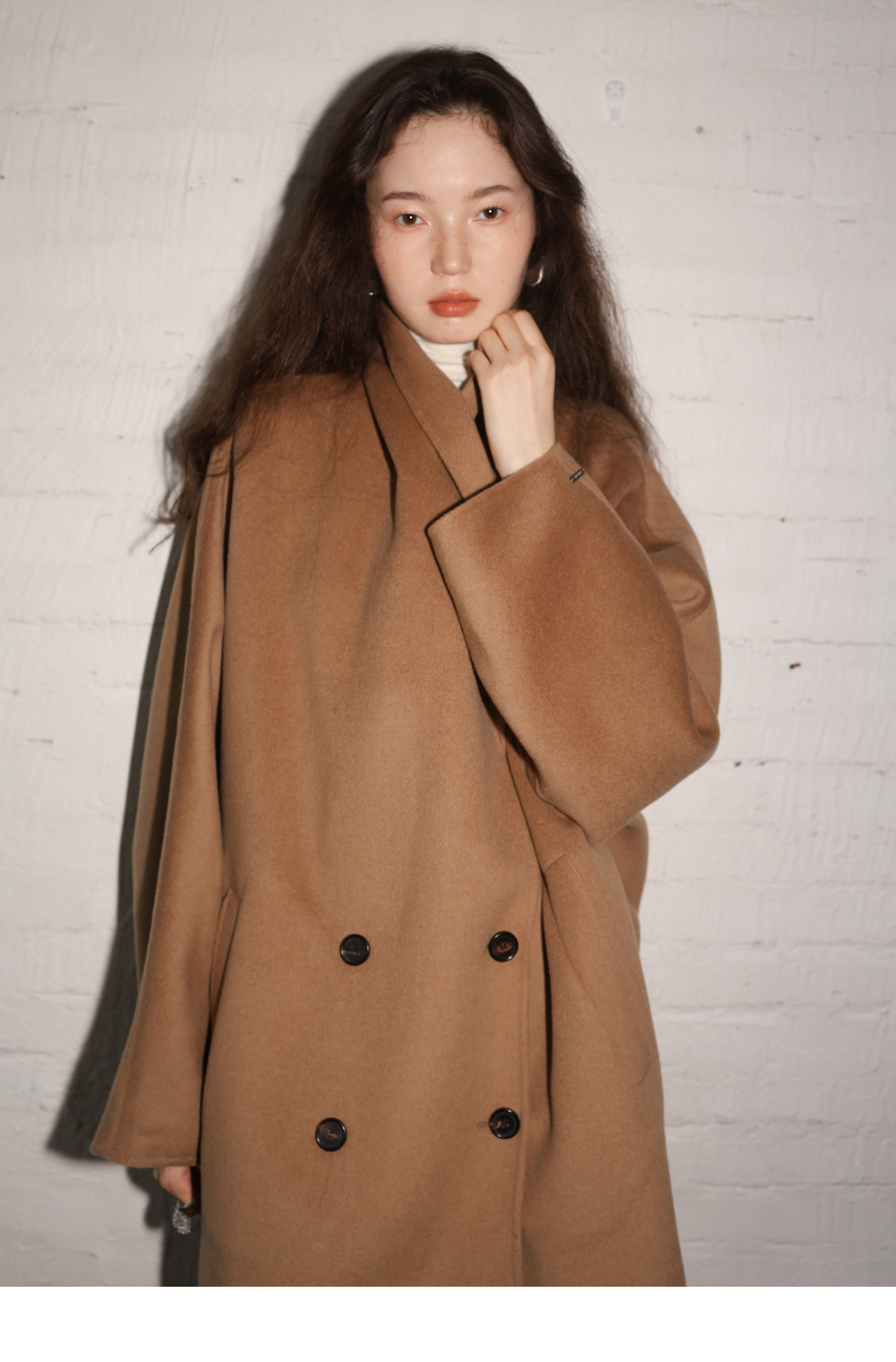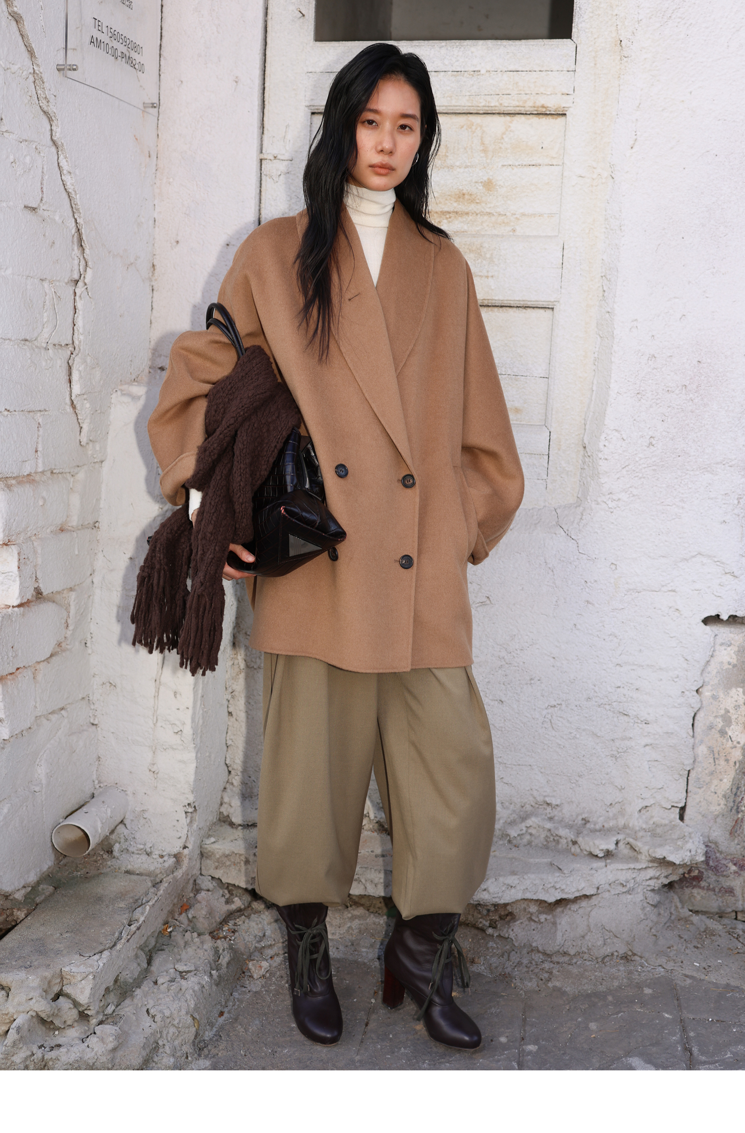 素舶 绵羊毛青果领双排扣松弛廓感宽松双面毛呢中长短款大衣外套