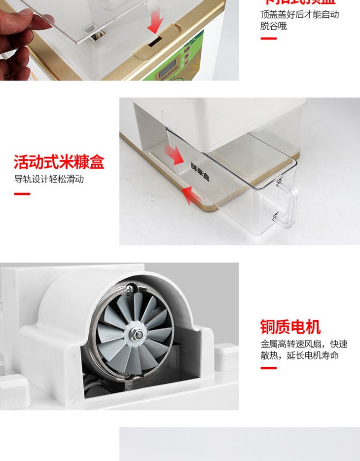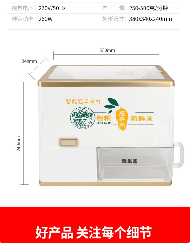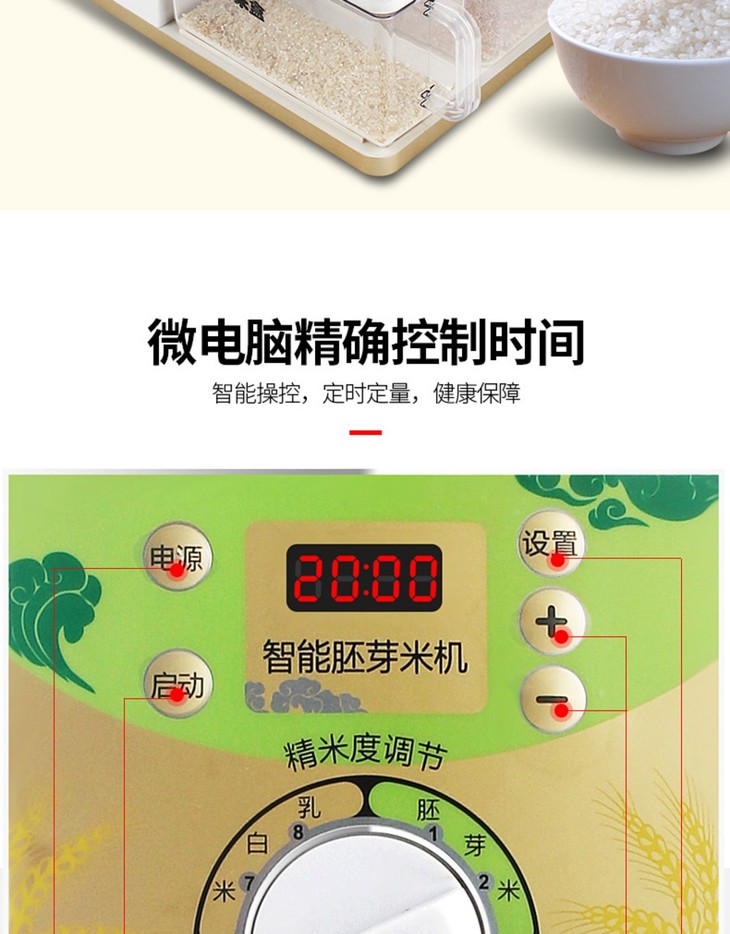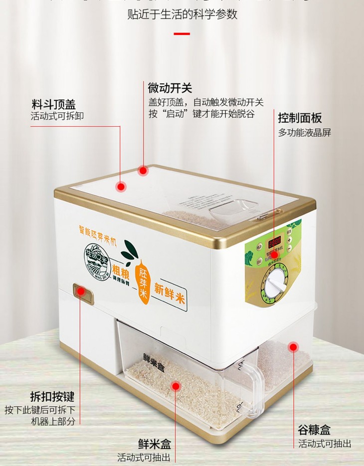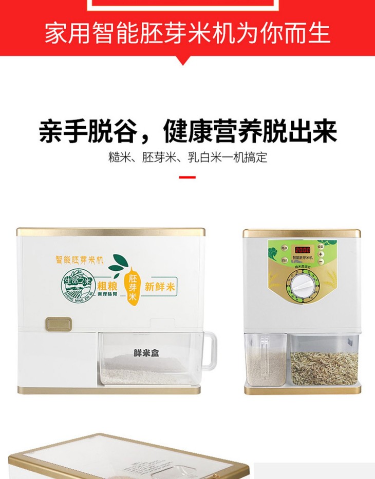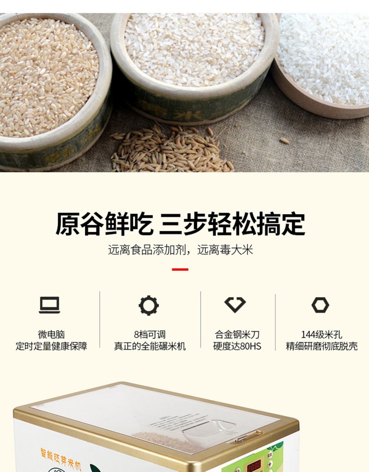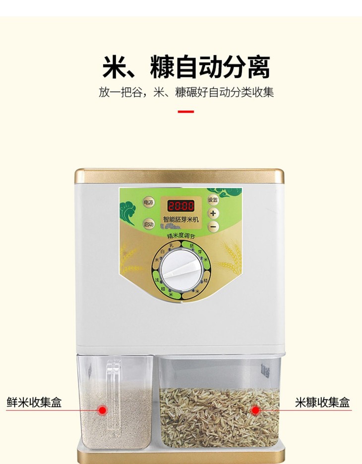 6.简易操作,无需接受专业培训智能胚芽米机有效去壳生产胚芽米或糙米,保留谷物营养,选择胚芽米,选择健康生活!健康从胚