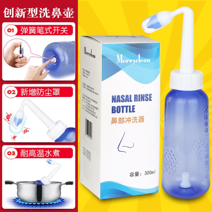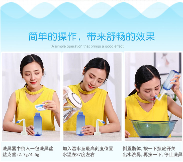 使用时建议搭配洗鼻盐使用,以防呛鼻!300ml洗鼻器搭配洗鼻盐,调配成0.9%浓度的洗鼻盐水。使用姜汤或姜粉汤洗鼻,请在原始点指导下使用。