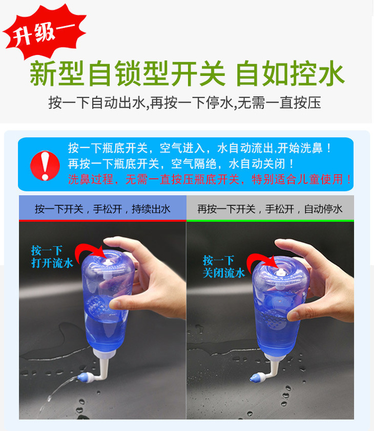 1、采用新型自锁式开关,按一下出水,再按一下停水,洗鼻过程无需一直按压;