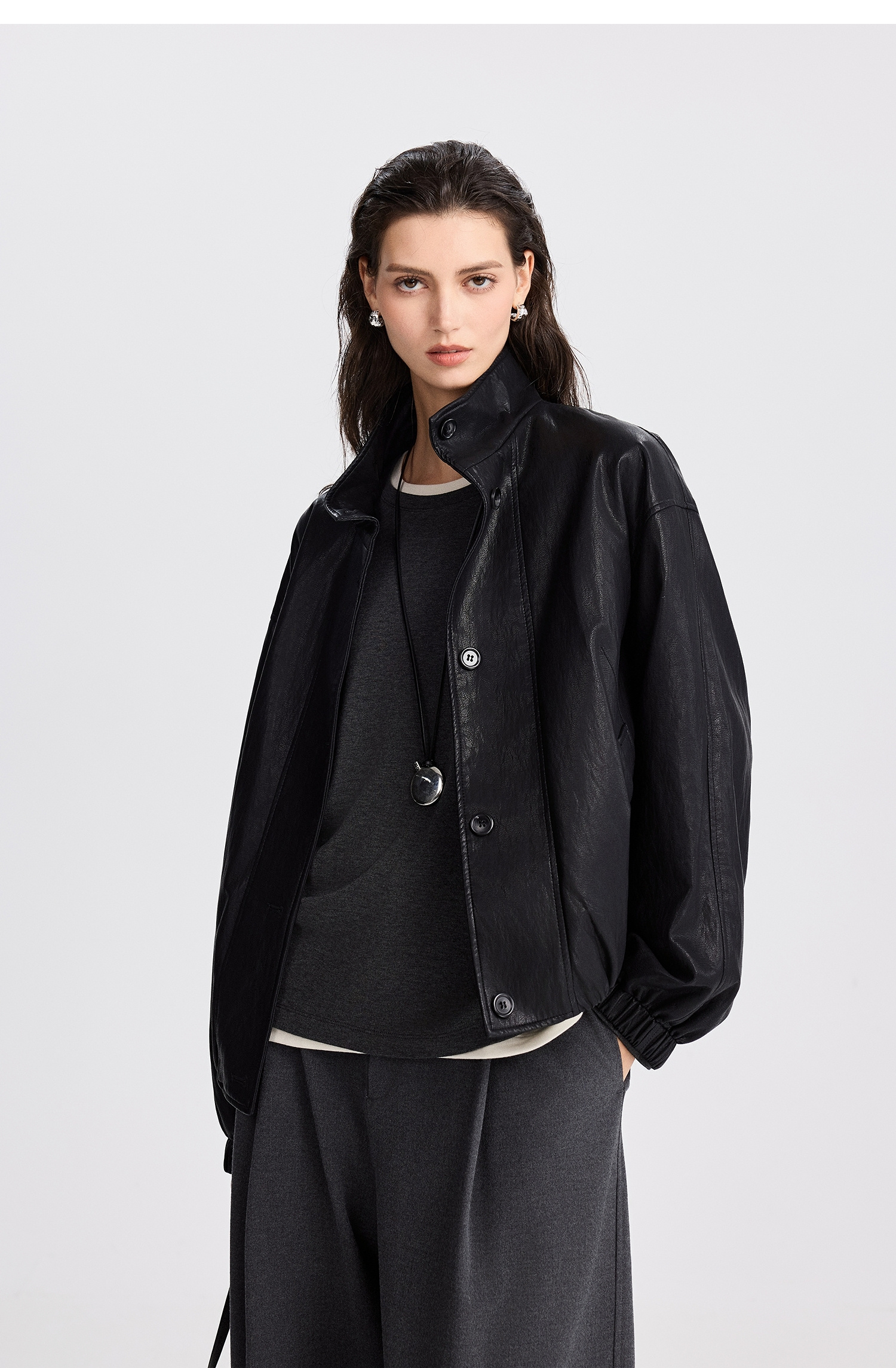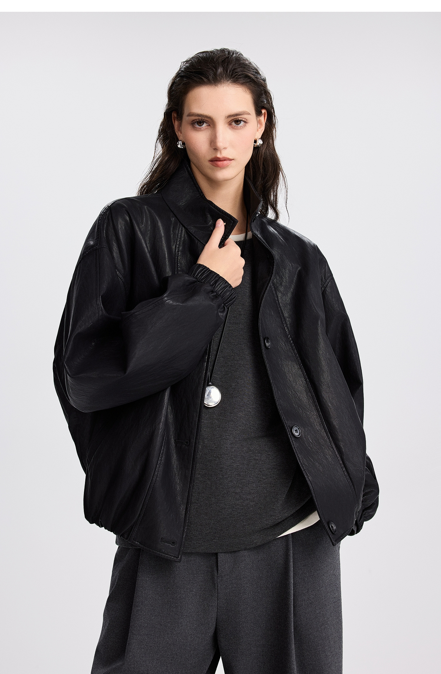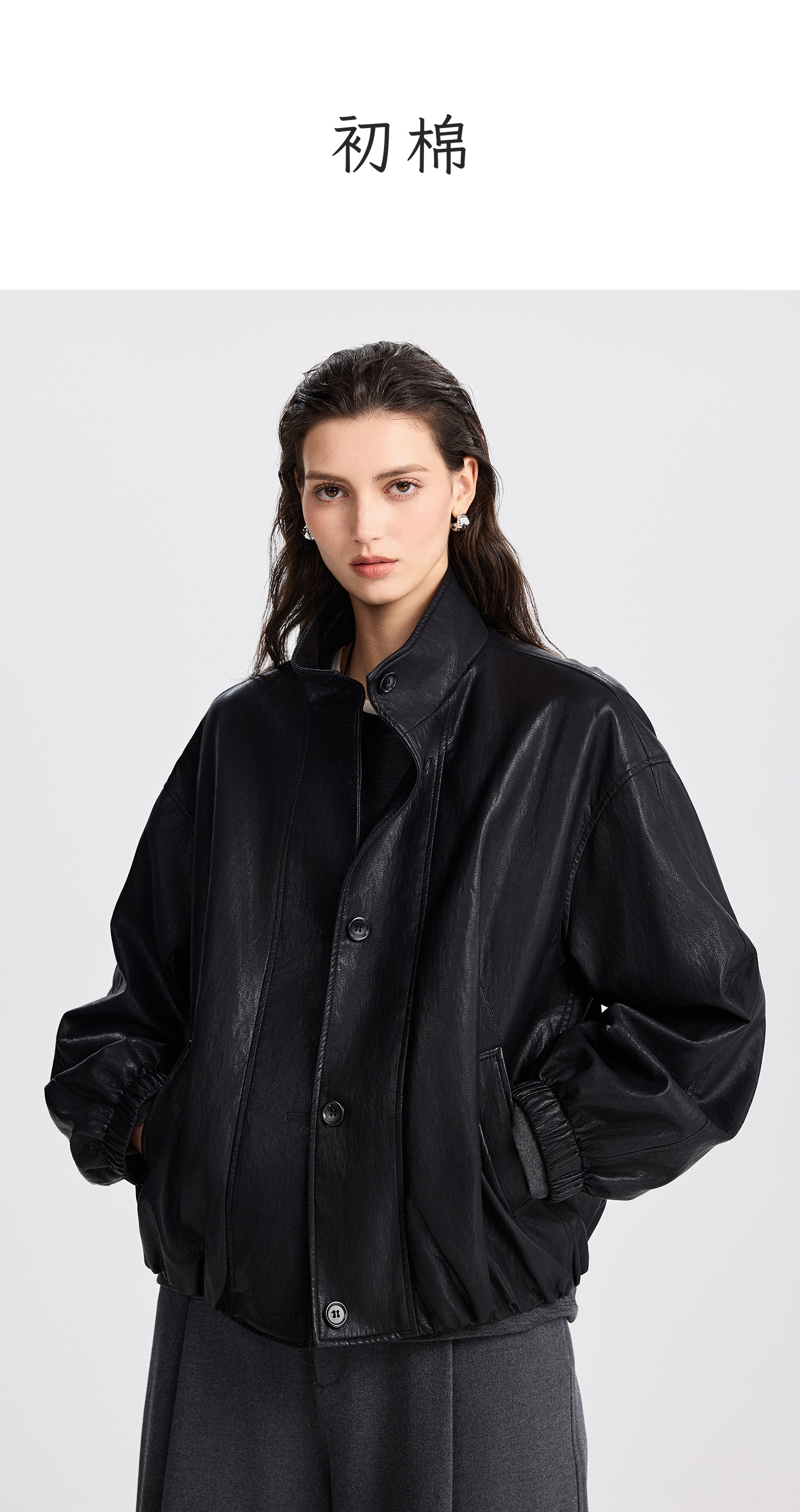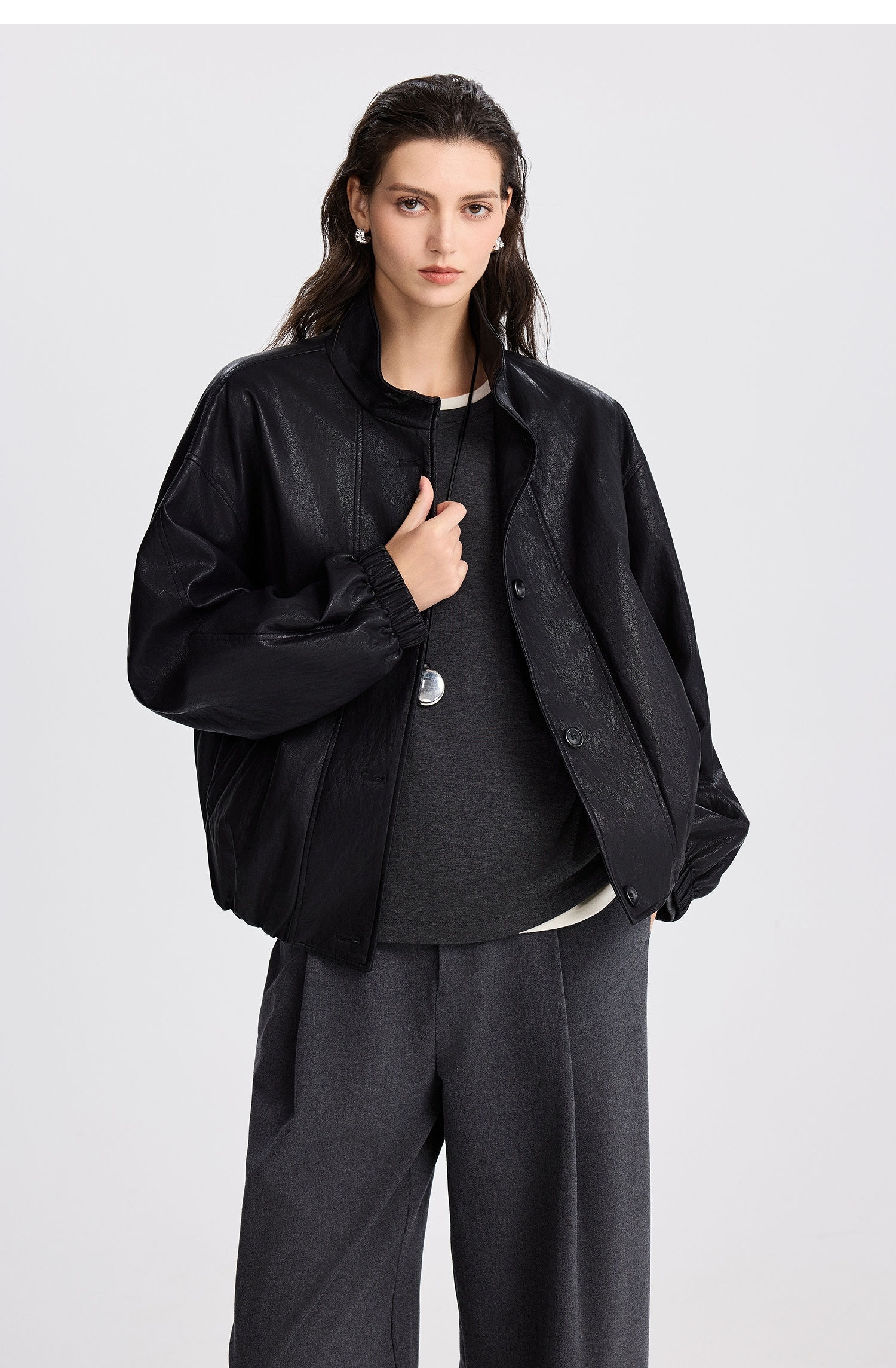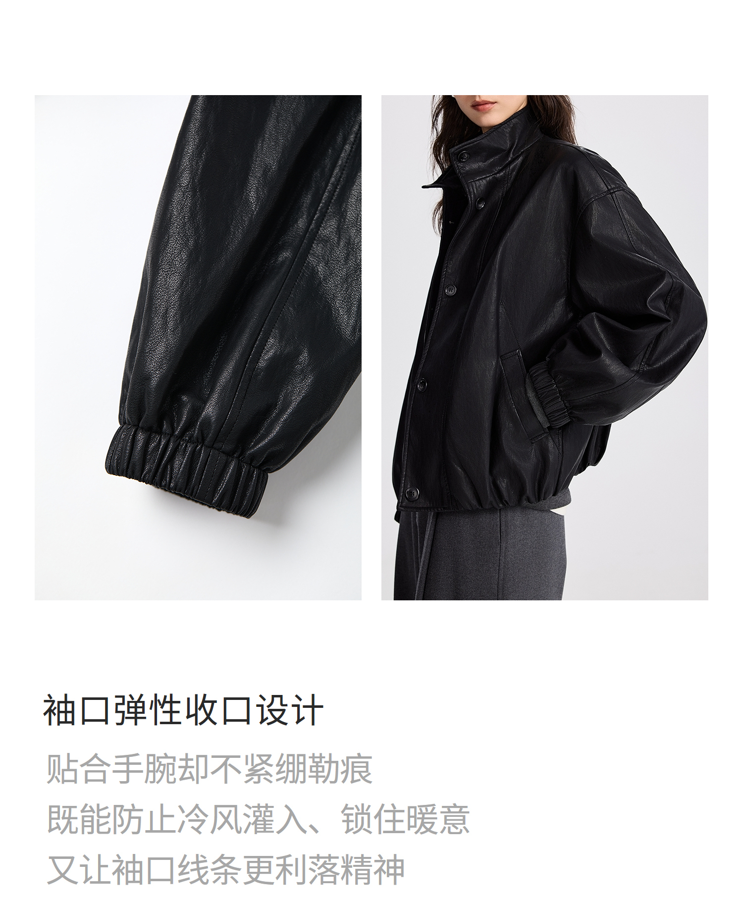 棉仓366607027立领宽松PU蛋白皮外套女25秋冬肌理感廓形显瘦机车皮夹克上衣