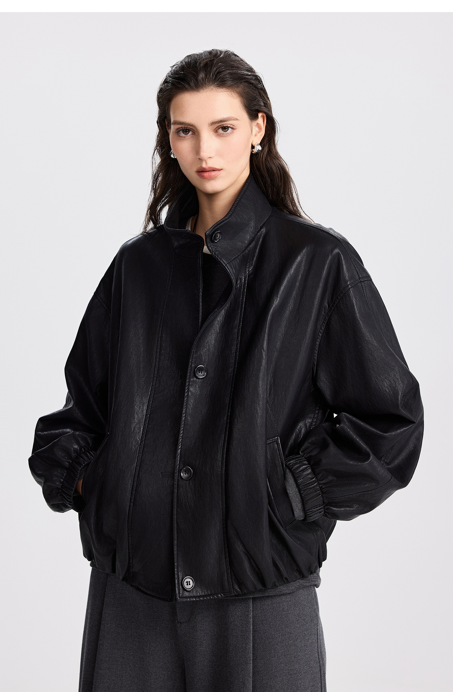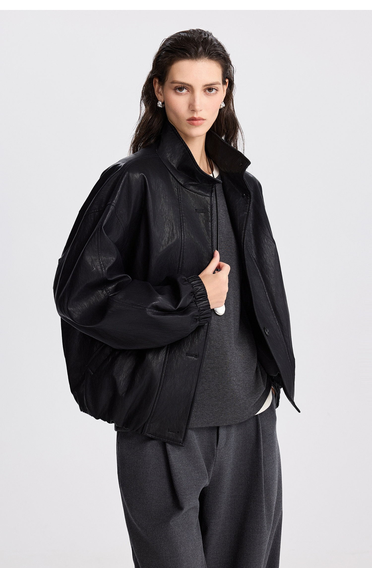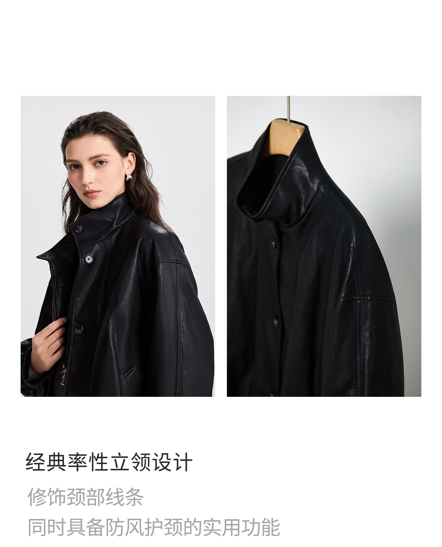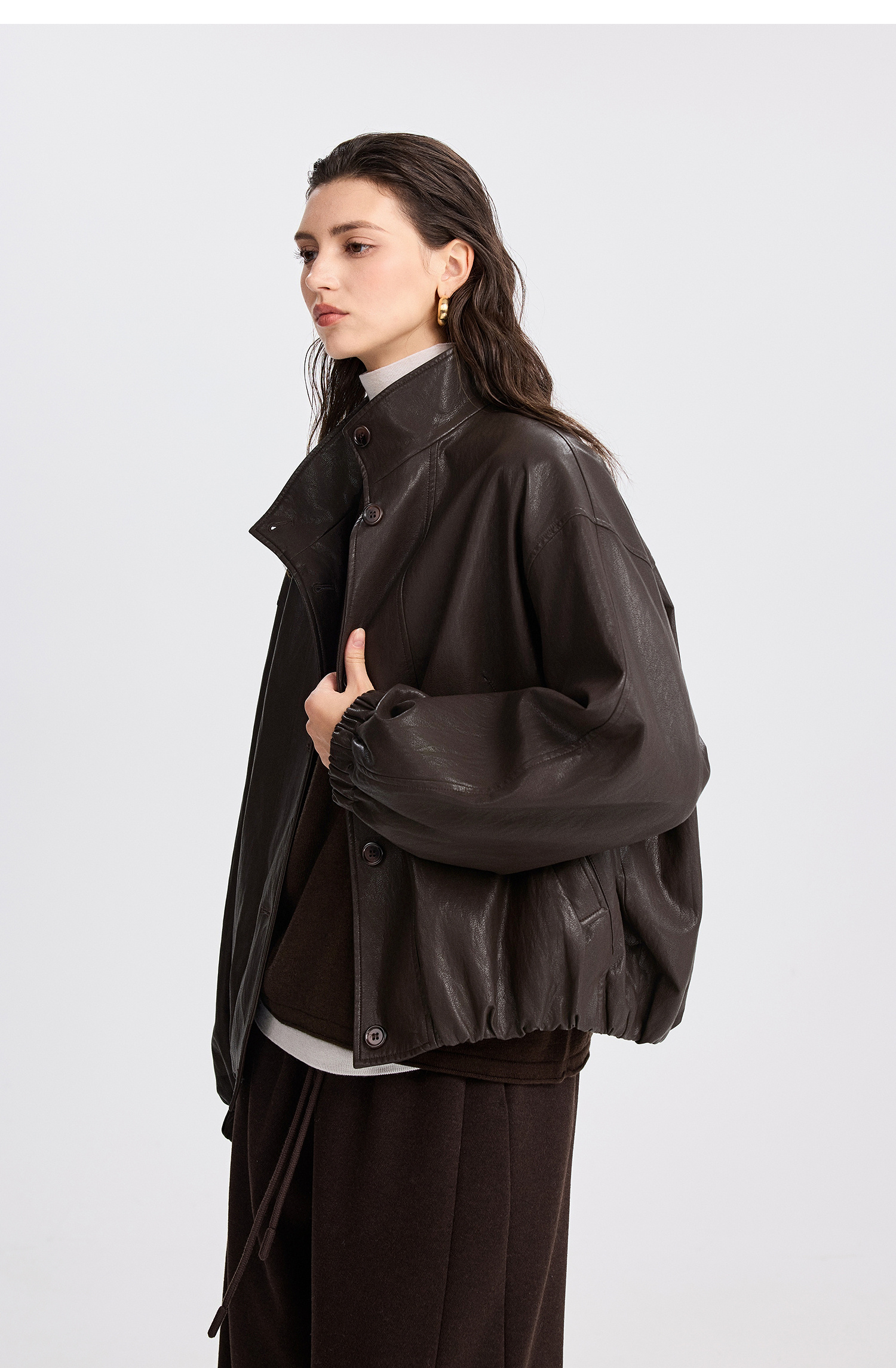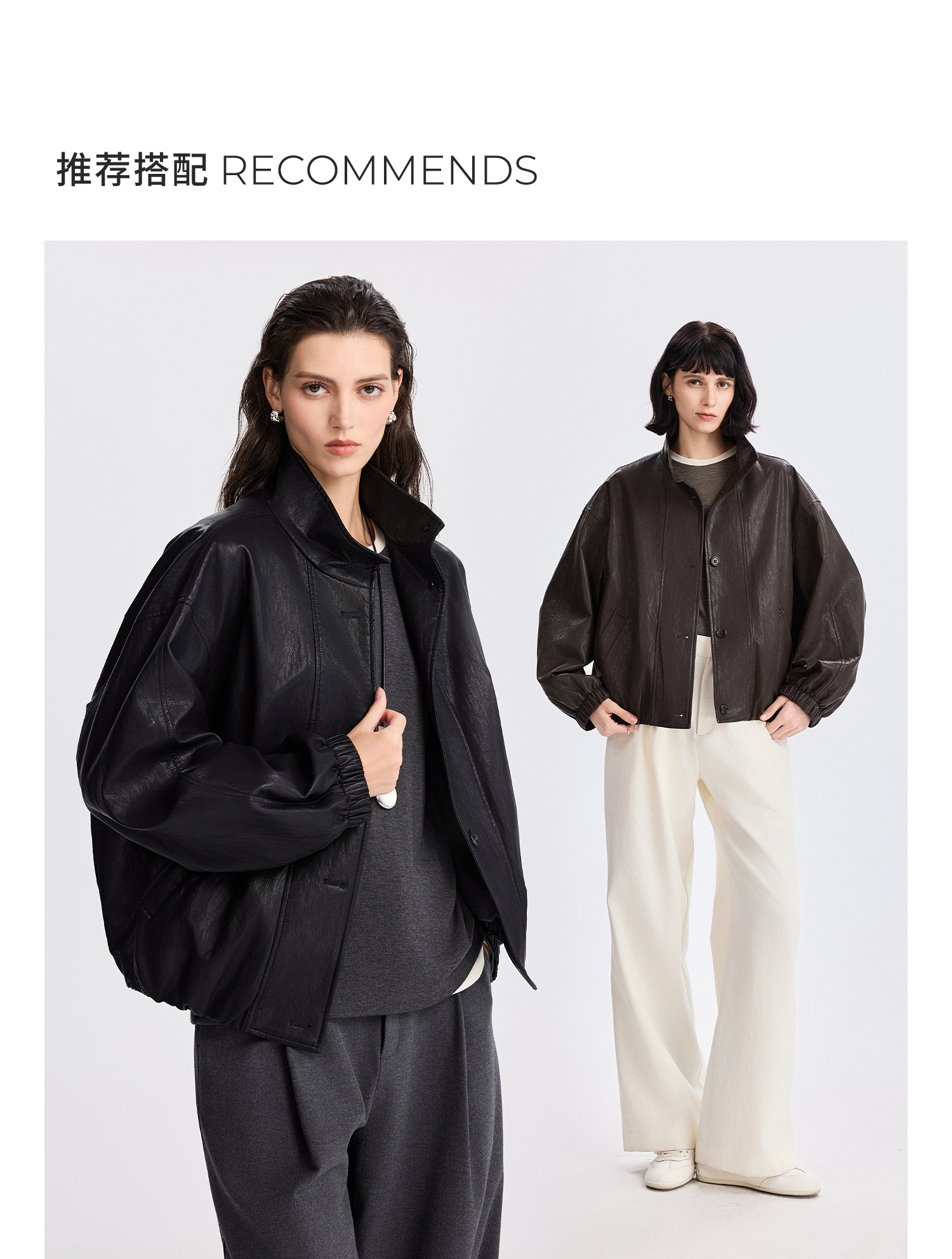 棉仓366607027立领宽松PU蛋白皮外套女25秋冬肌理感廓形显瘦机车皮夹克上衣