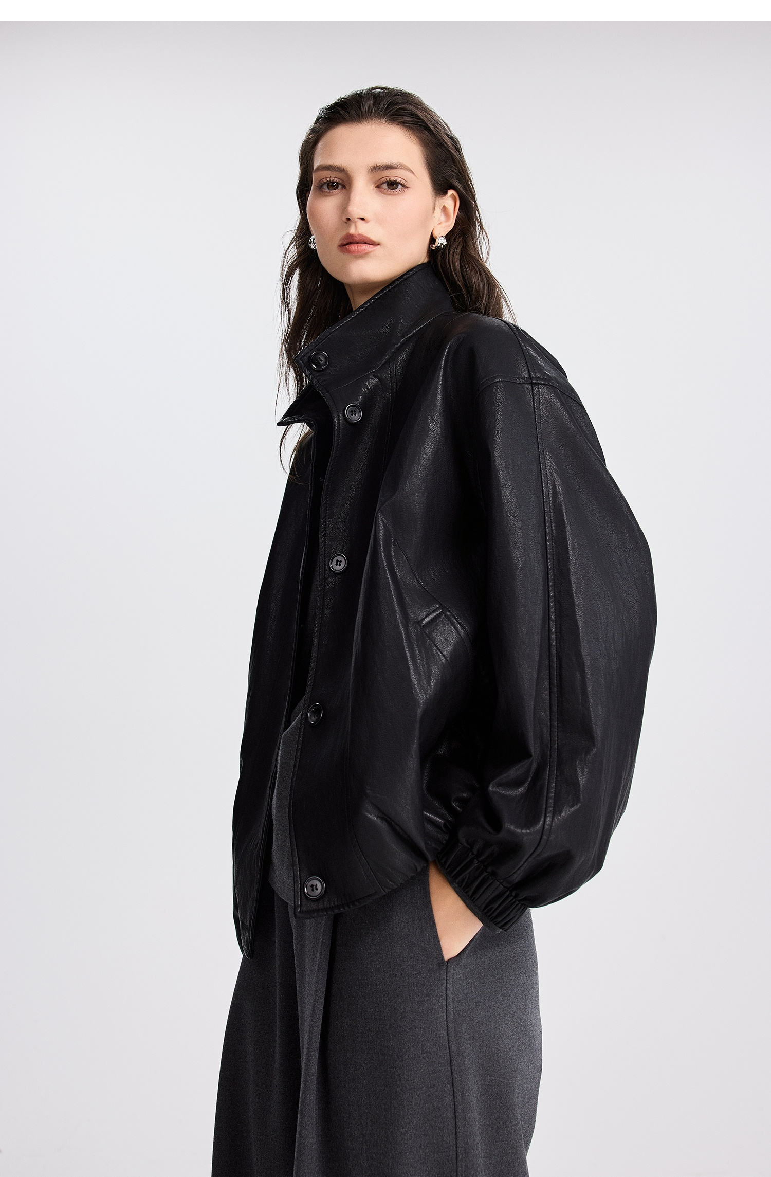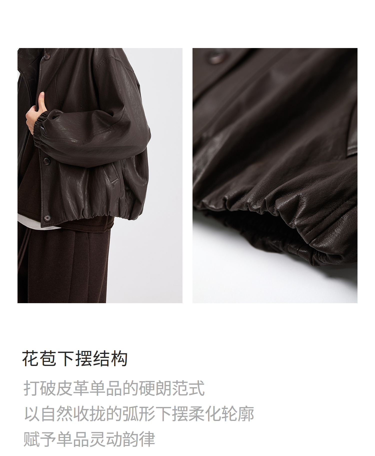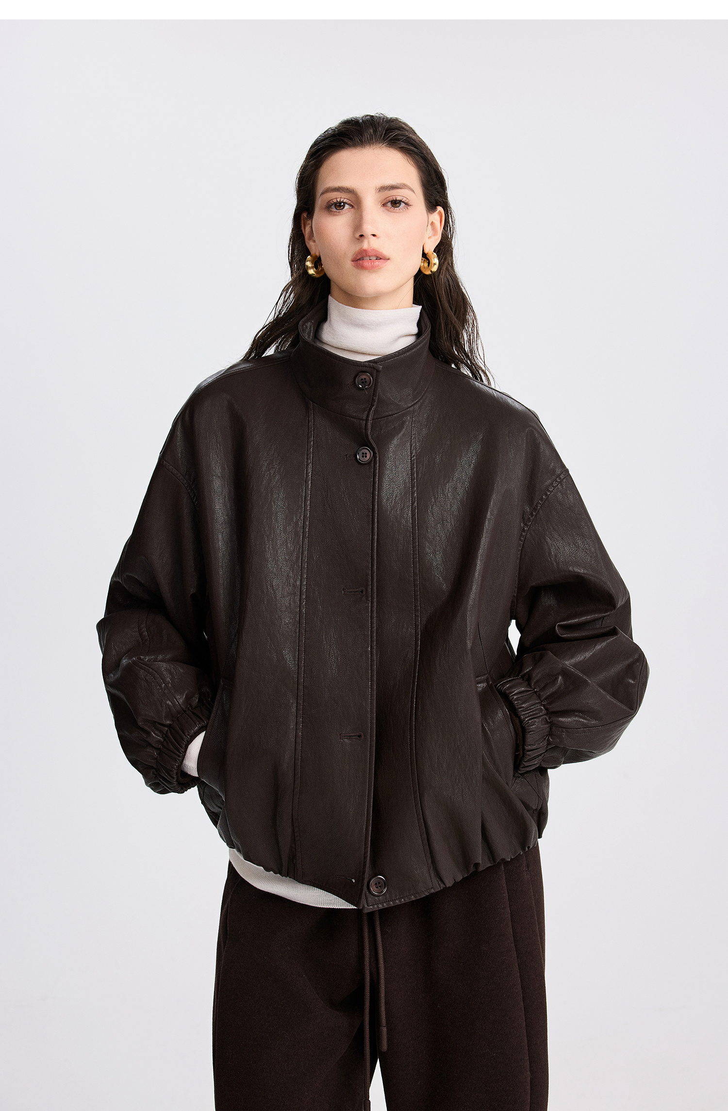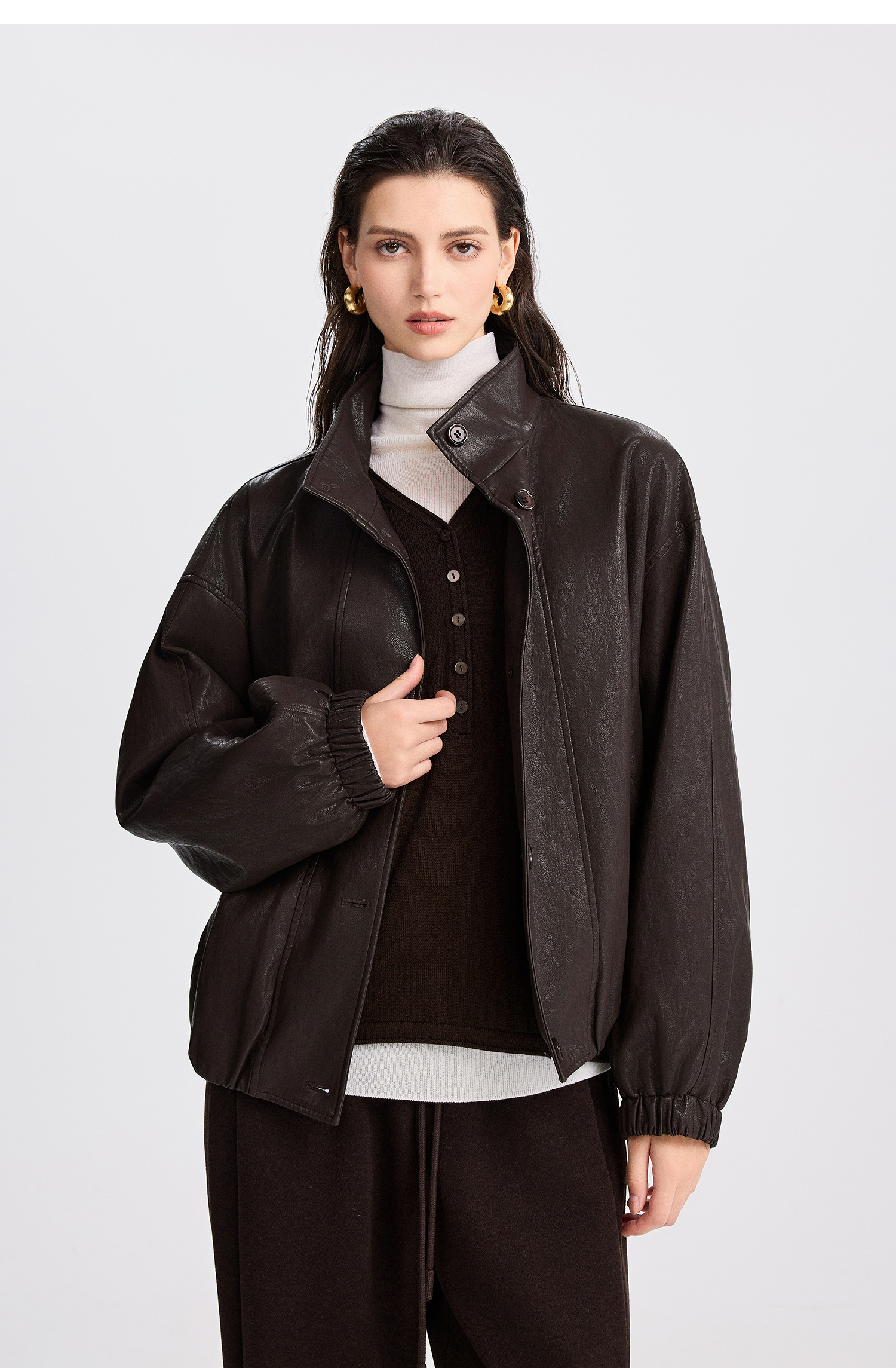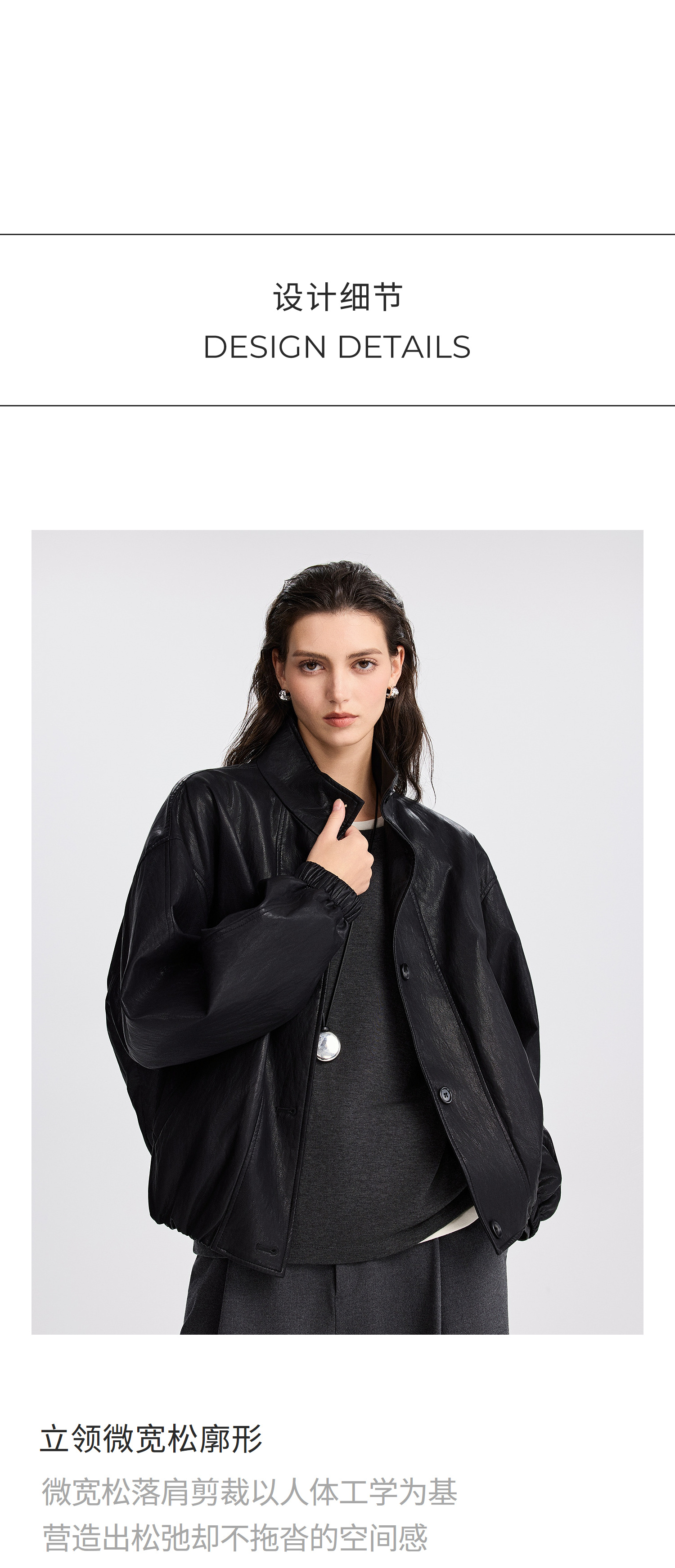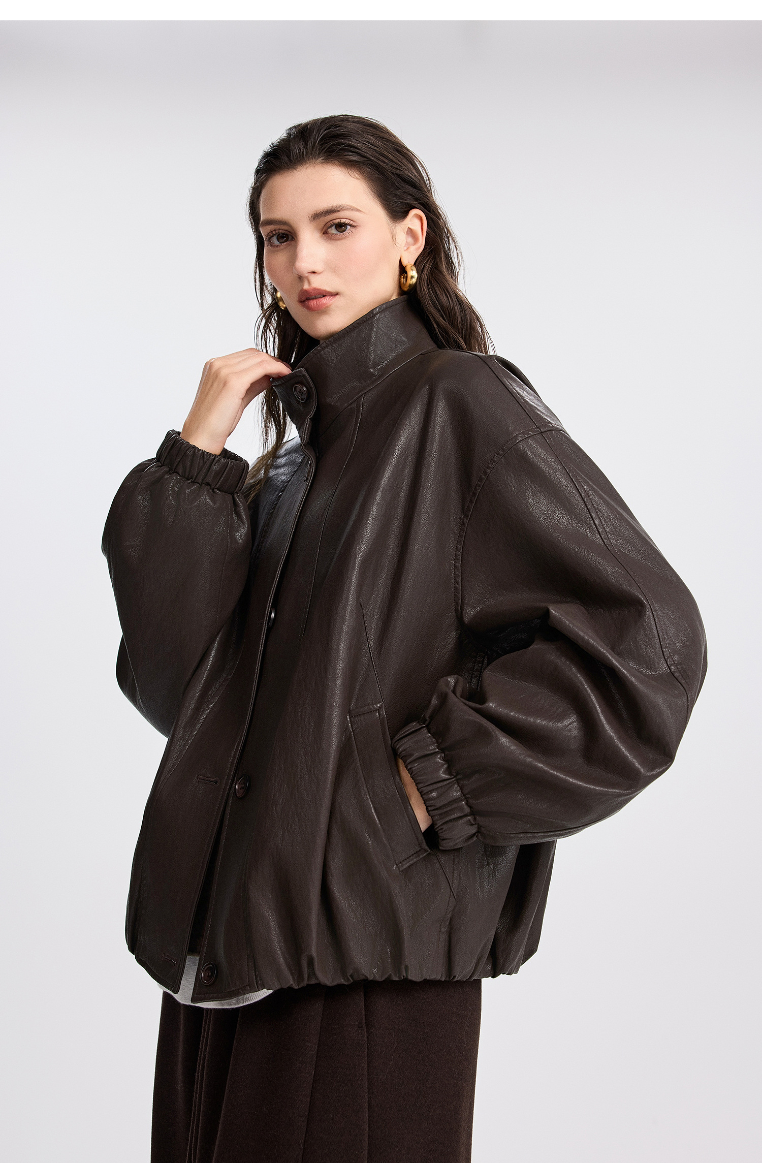 棉仓366607027立领宽松PU蛋白皮外套女25秋冬肌理感廓形显瘦机车皮夹克上衣