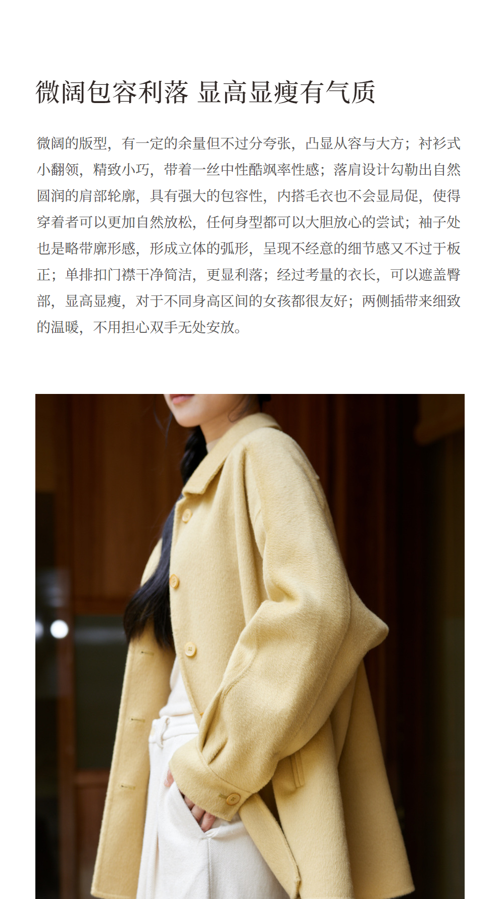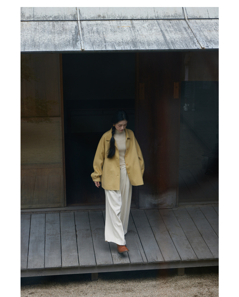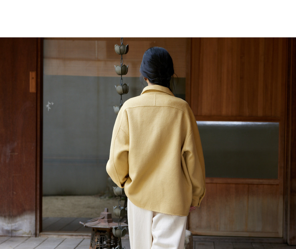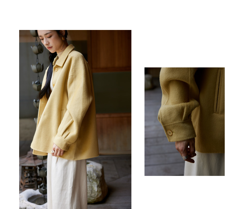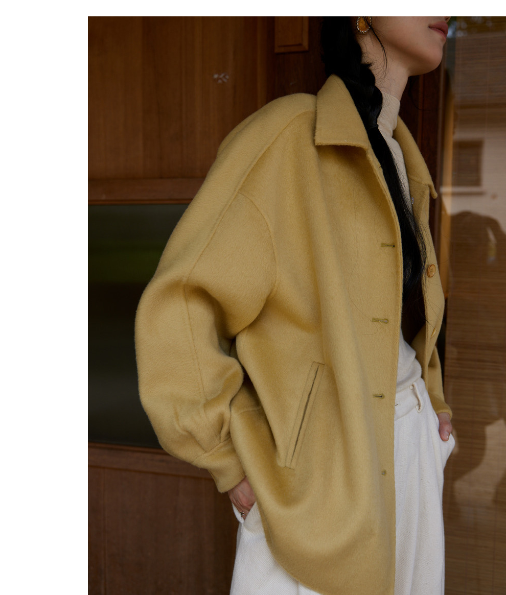 绽放868朵/嫩黄色减龄羊羔毛驼绒双面呢大衣简约大气通勤百搭外套